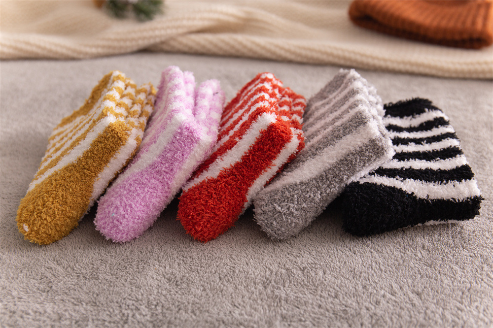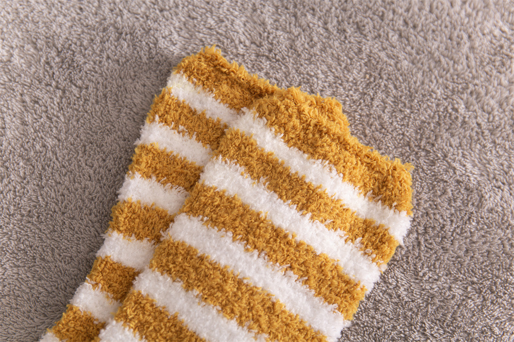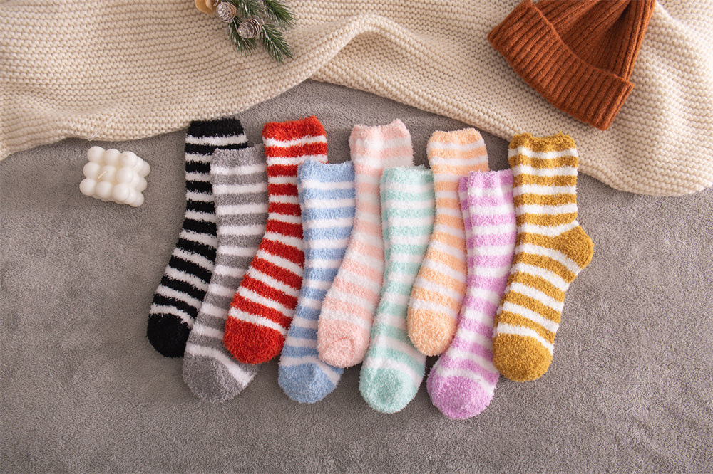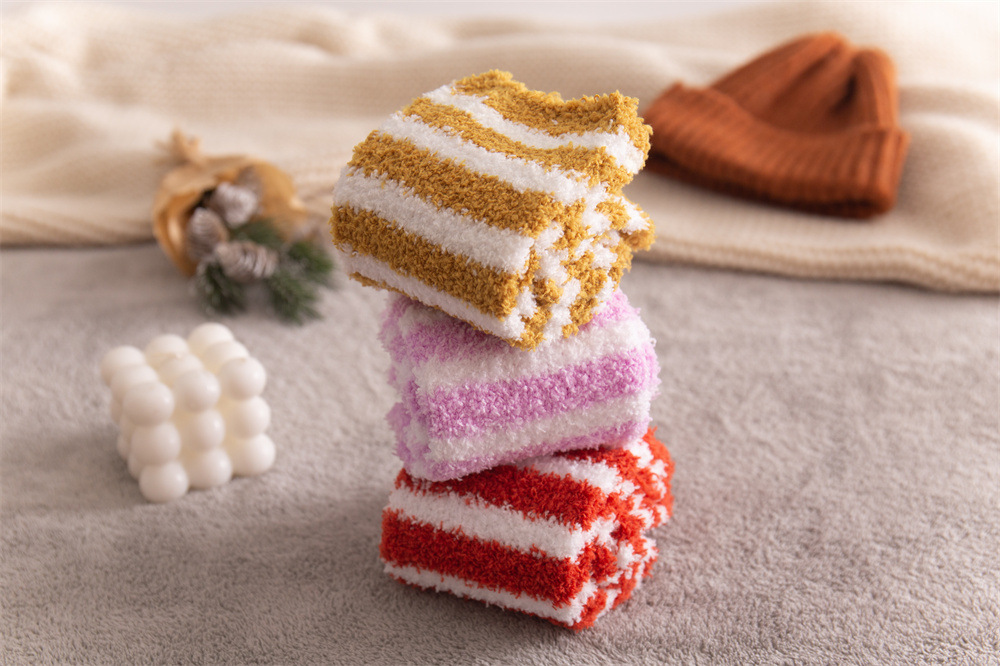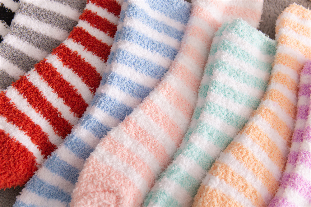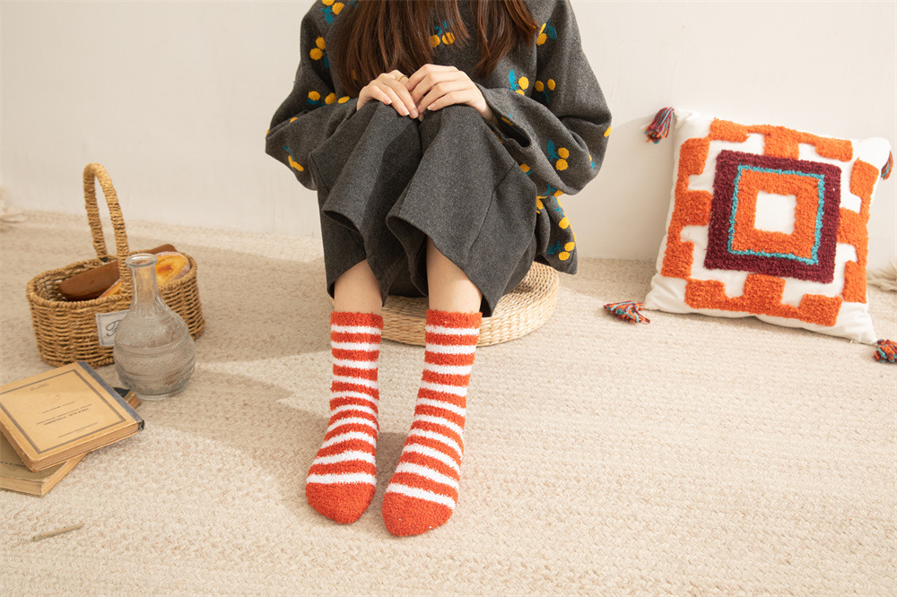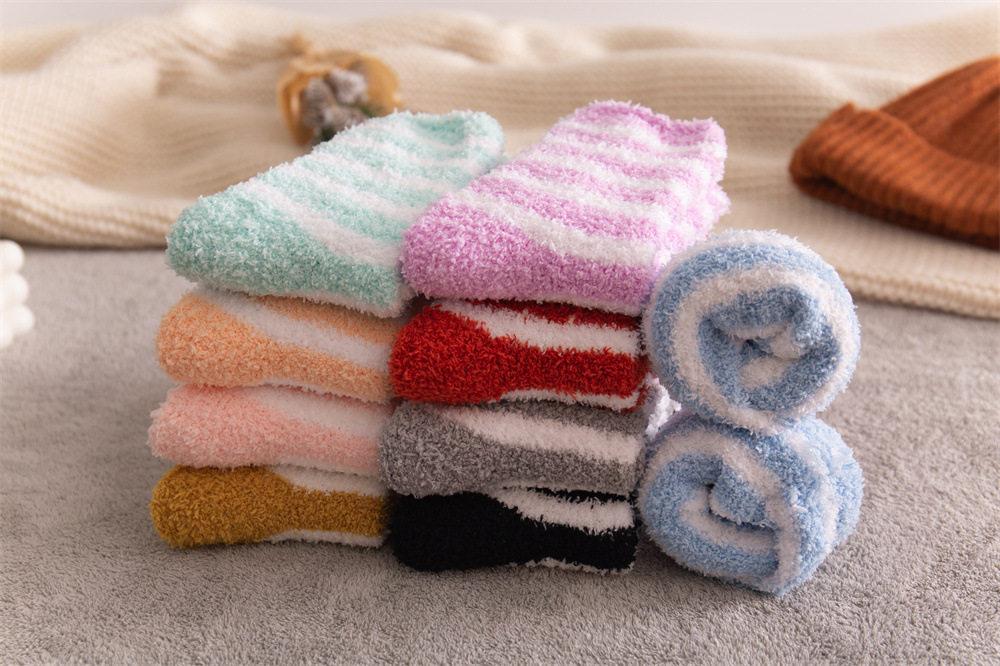 여성용 슬리퍼 양말 아마존 국경 간 슬리핑 양말 캔디 컬러 스트라이프 산호 양털 양말 중간 튜브 따뜻한 기모 사이드 플리스