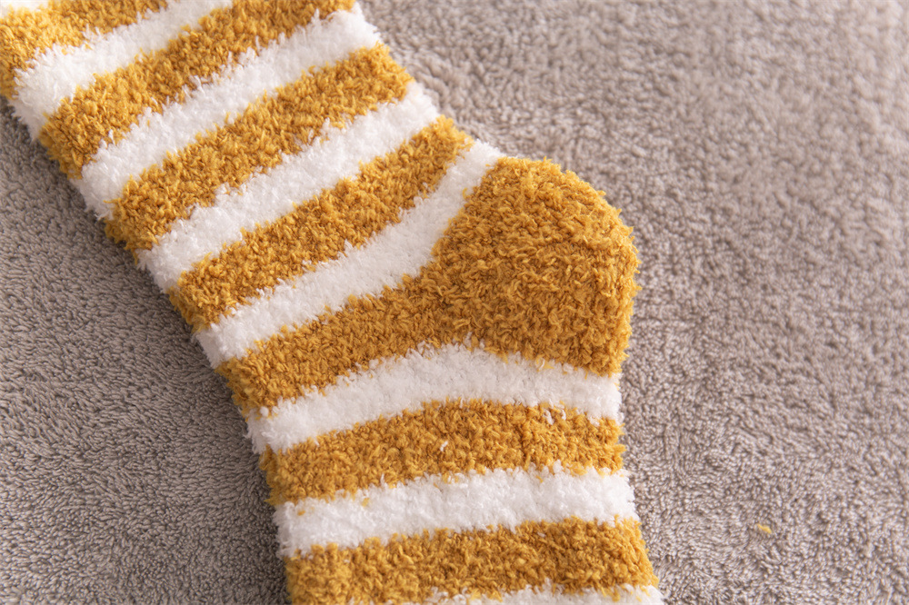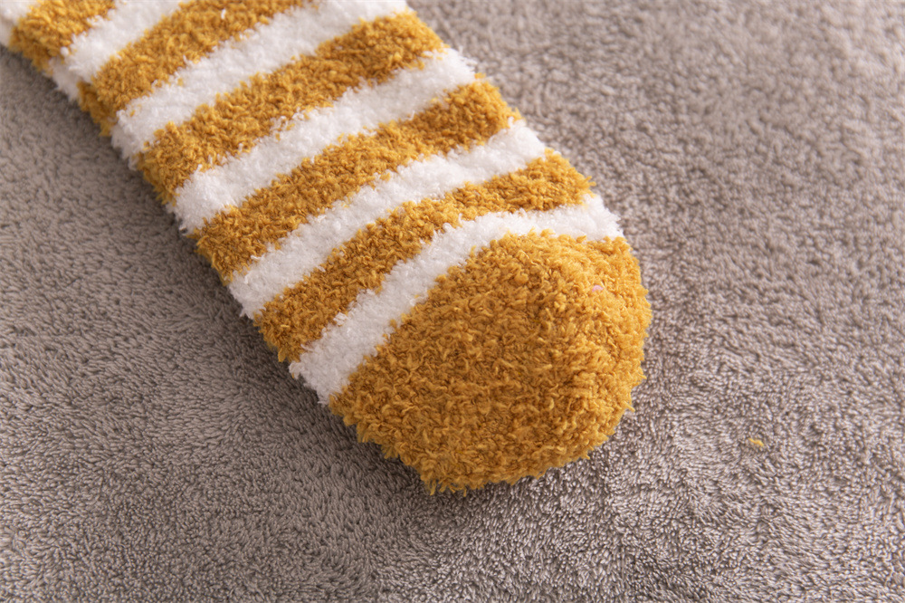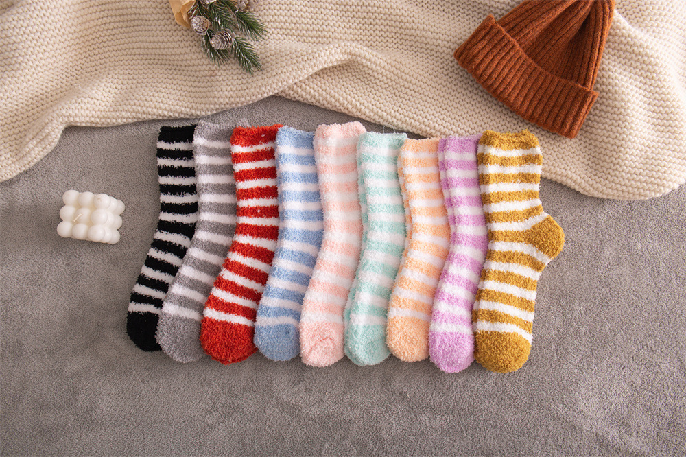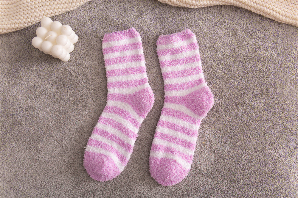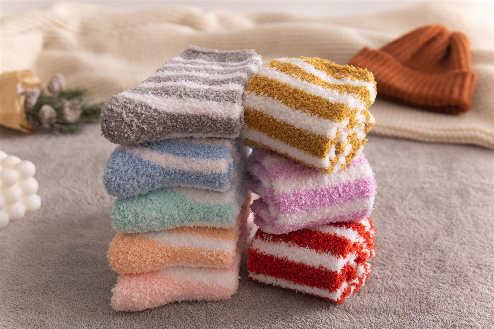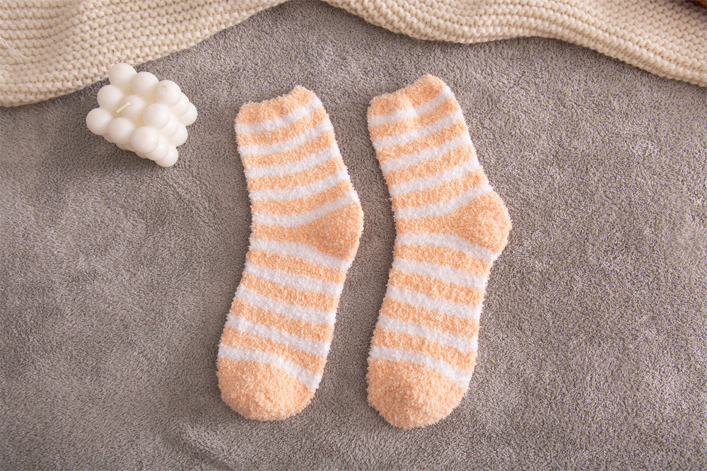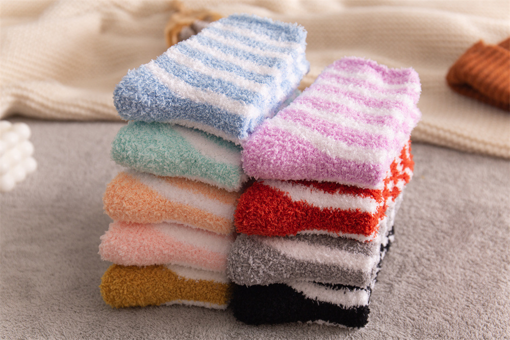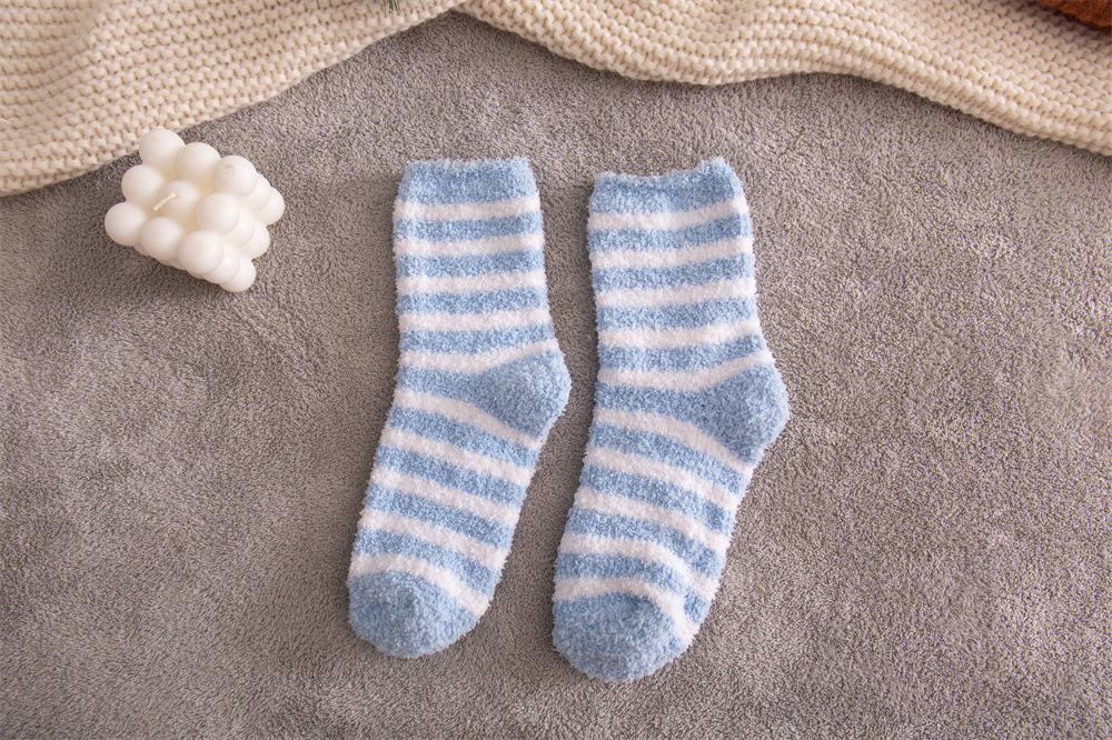 여성용 슬리퍼 양말 아마존 국경 간 슬리핑 양말 캔디 컬러 스트라이프 산호 양털 양말 중간 튜브 따뜻한 기모 사이드 플리스