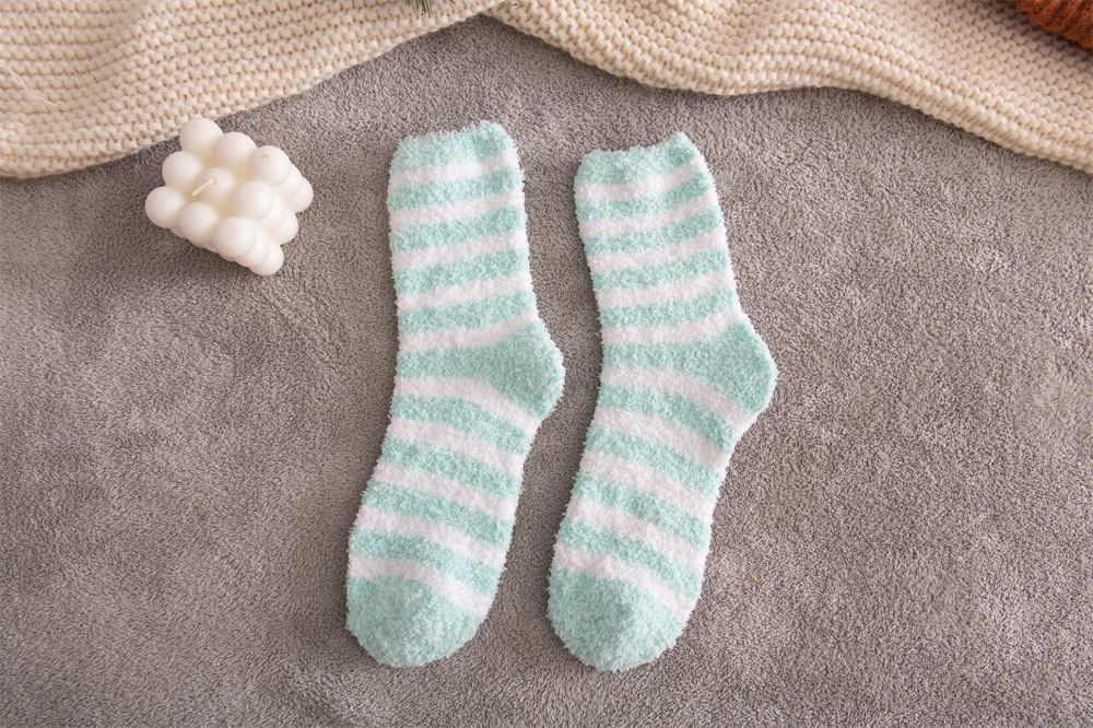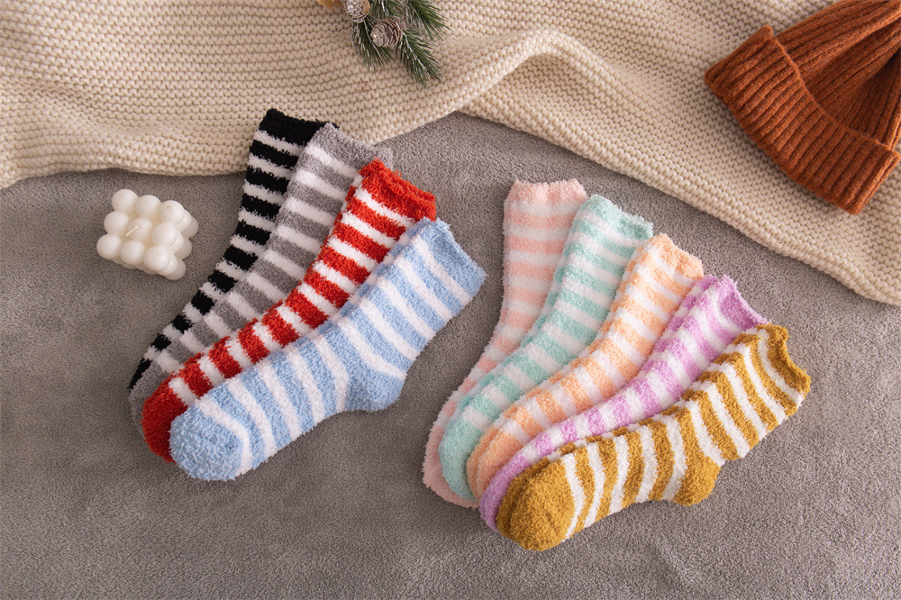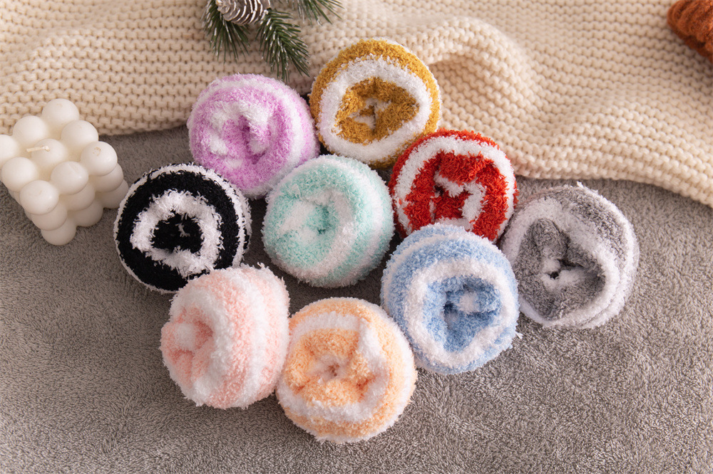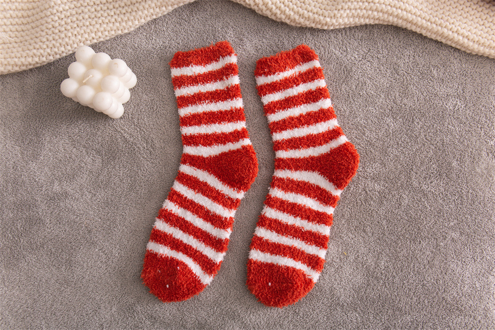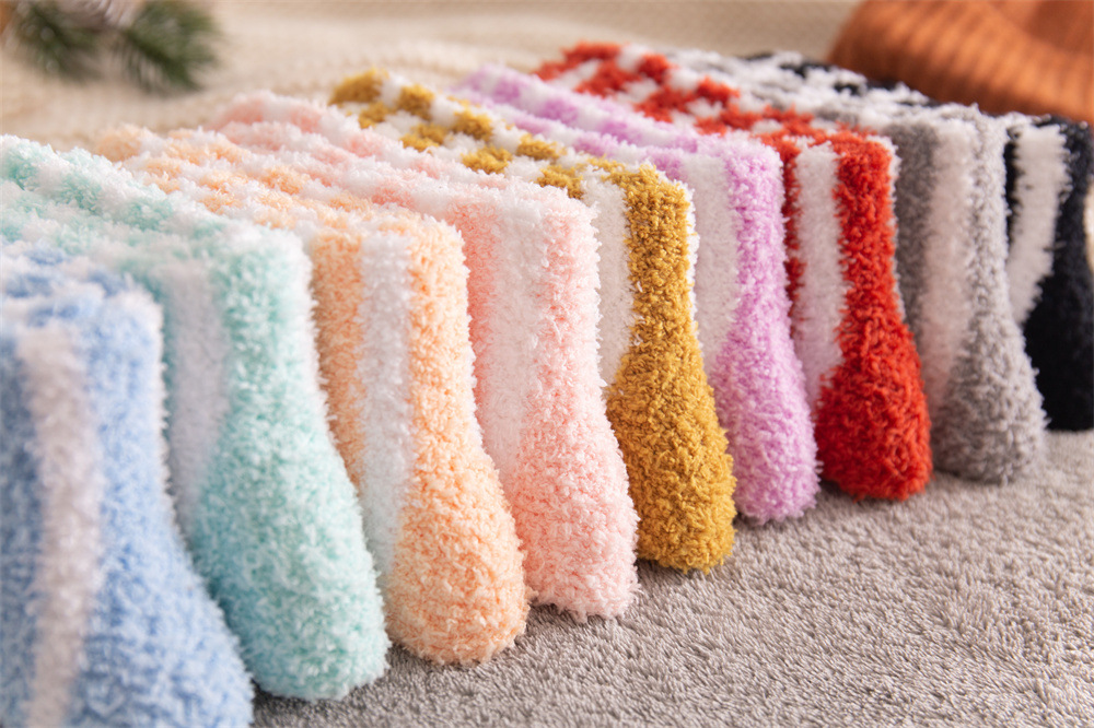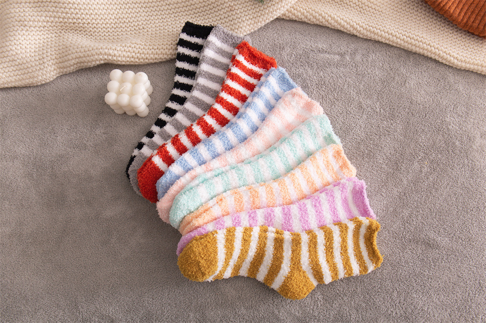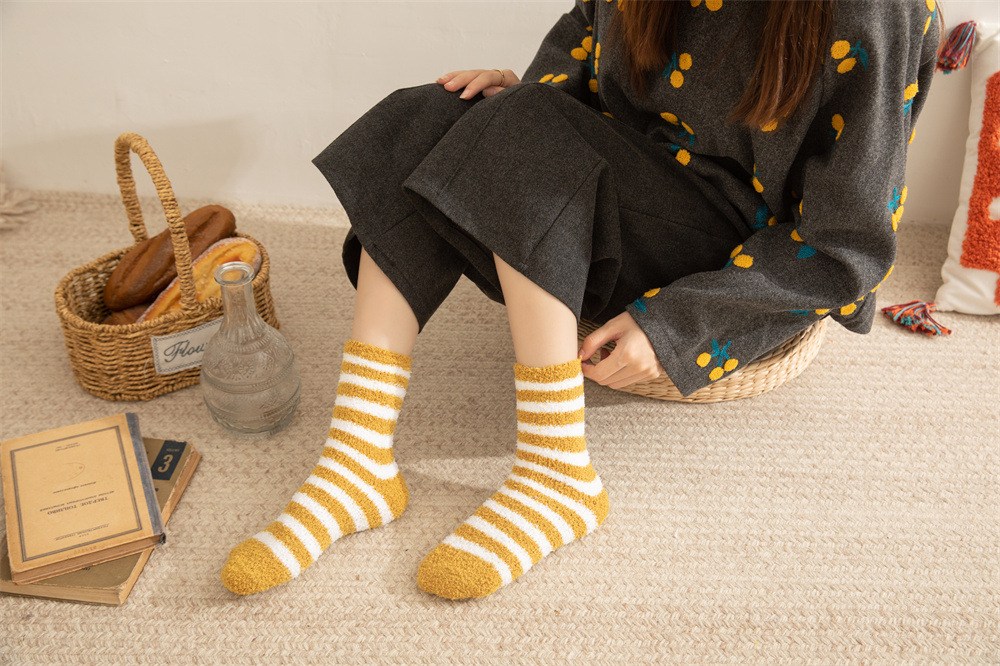 여성용 슬리퍼 양말 아마존 국경 간 슬리핑 양말 캔디 컬러 스트라이프 산호 양털 양말 중간 튜브 따뜻한 기모 사이드 플리스