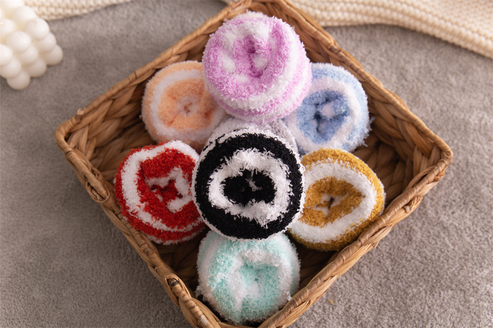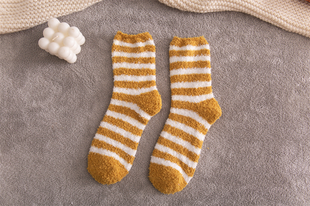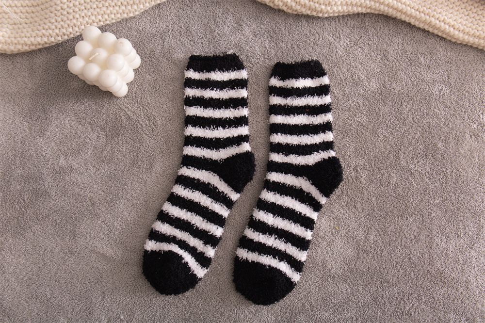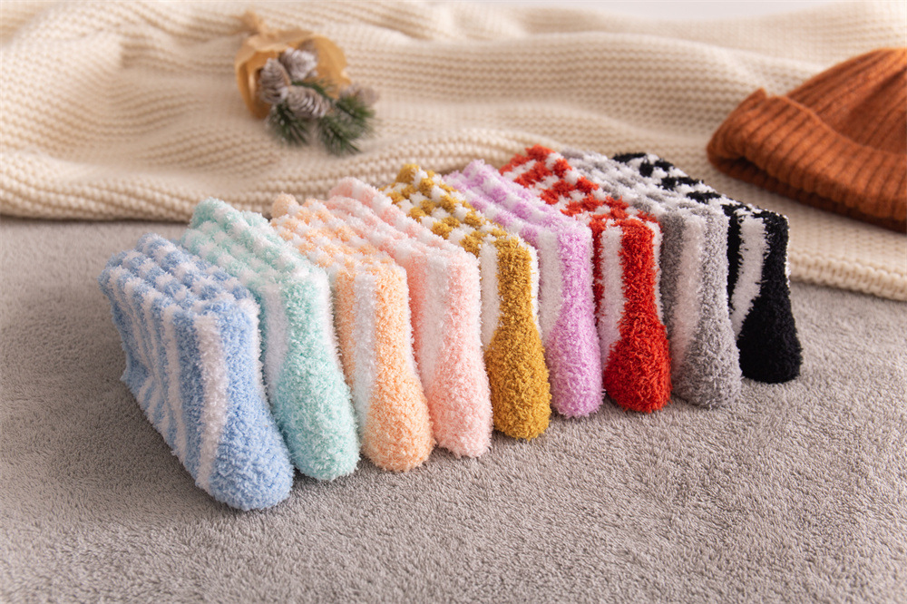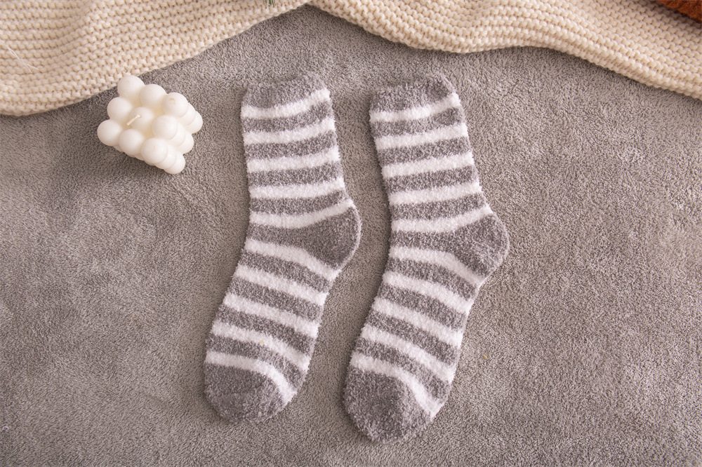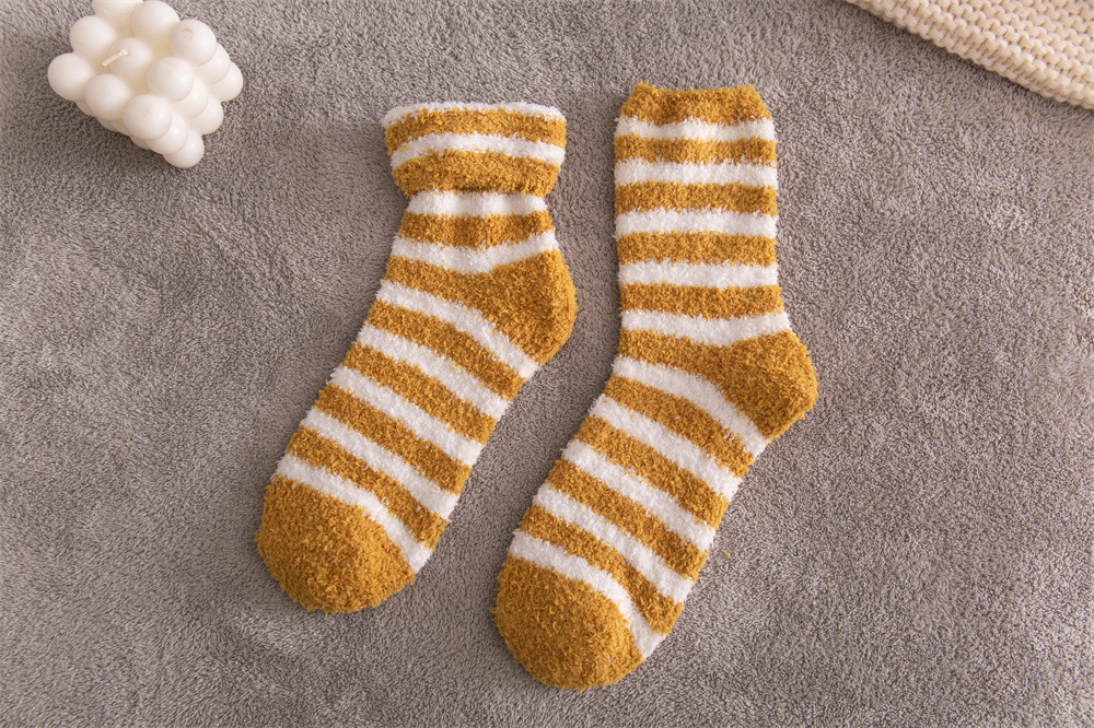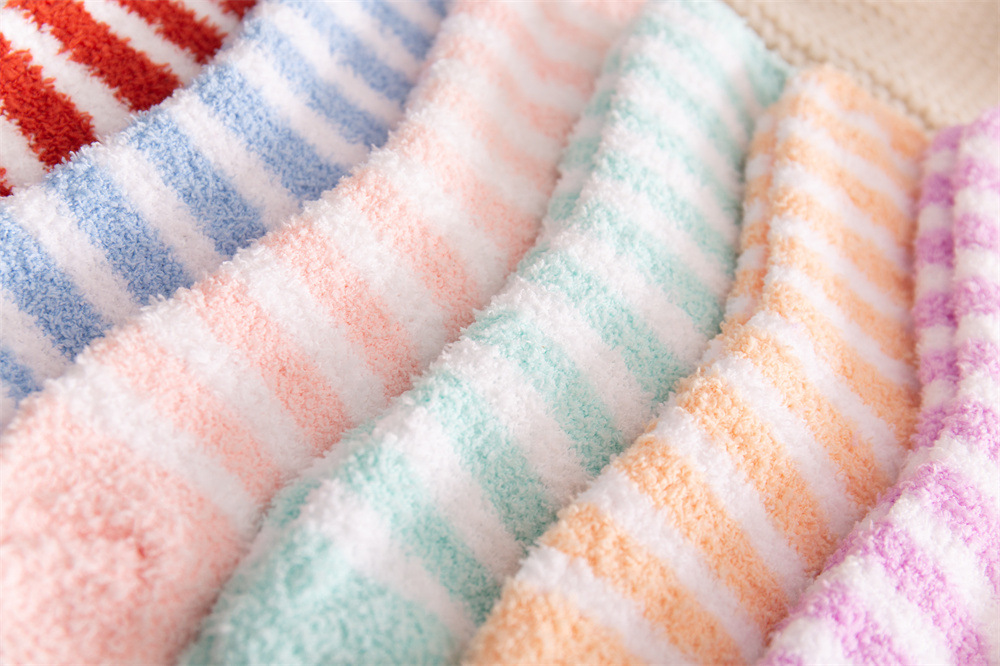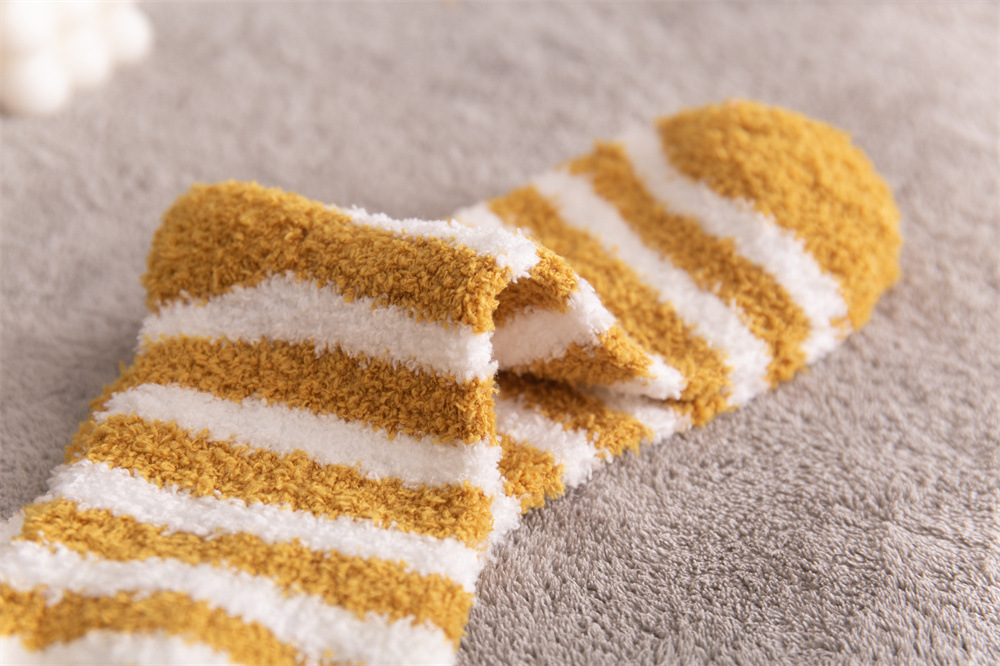 여성용 슬리퍼 양말 아마존 국경 간 슬리핑 양말 캔디 컬러 스트라이프 산호 양털 양말 중간 튜브 따뜻한 기모 사이드 플리스