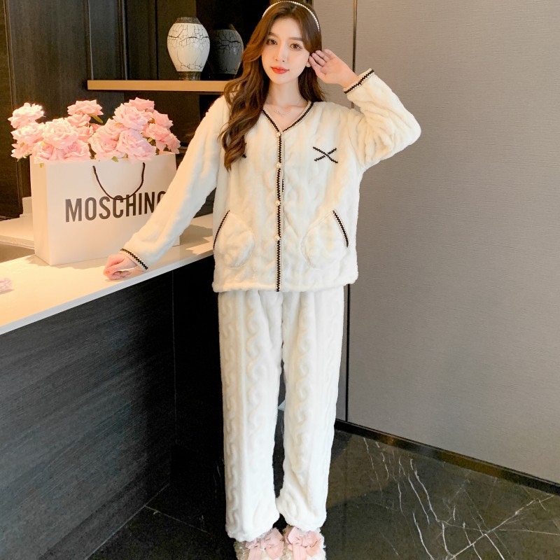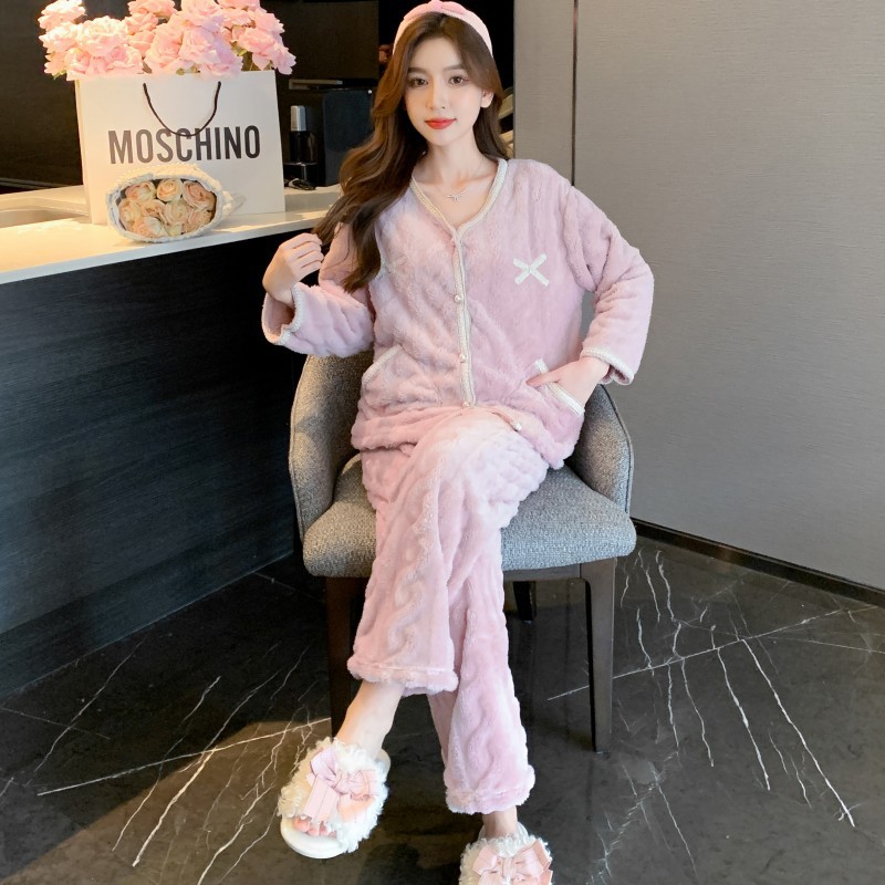 가을과 겨울 플란넬 산호 양털 새로운 도착 잠옷 여성 기모 두꺼운 긴 소매 샤넬 스타일 따뜻한 홈 옷 세트
