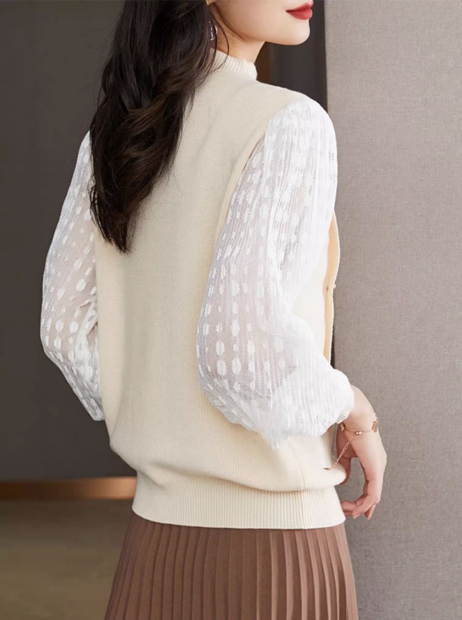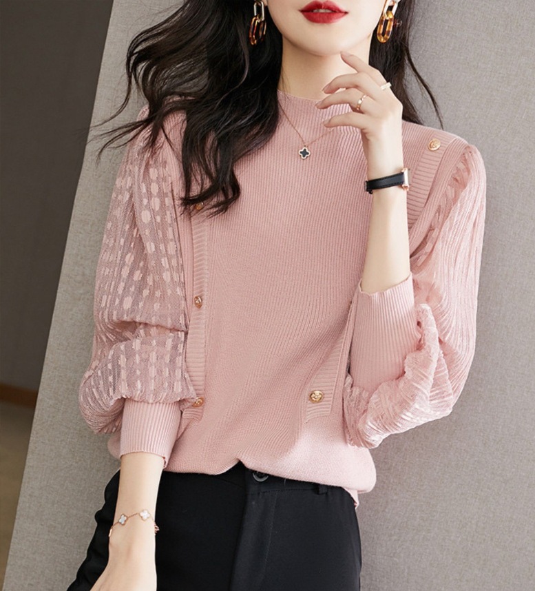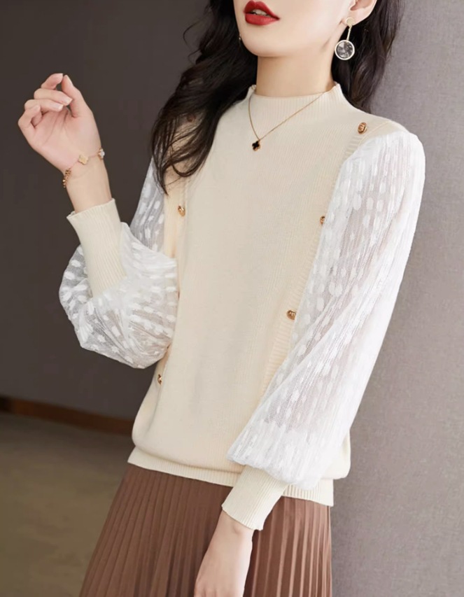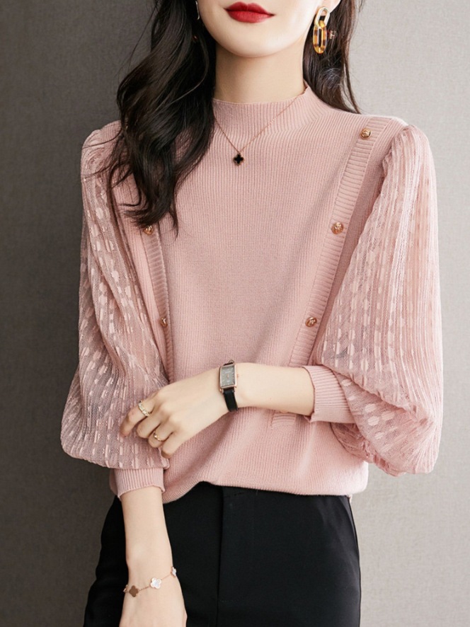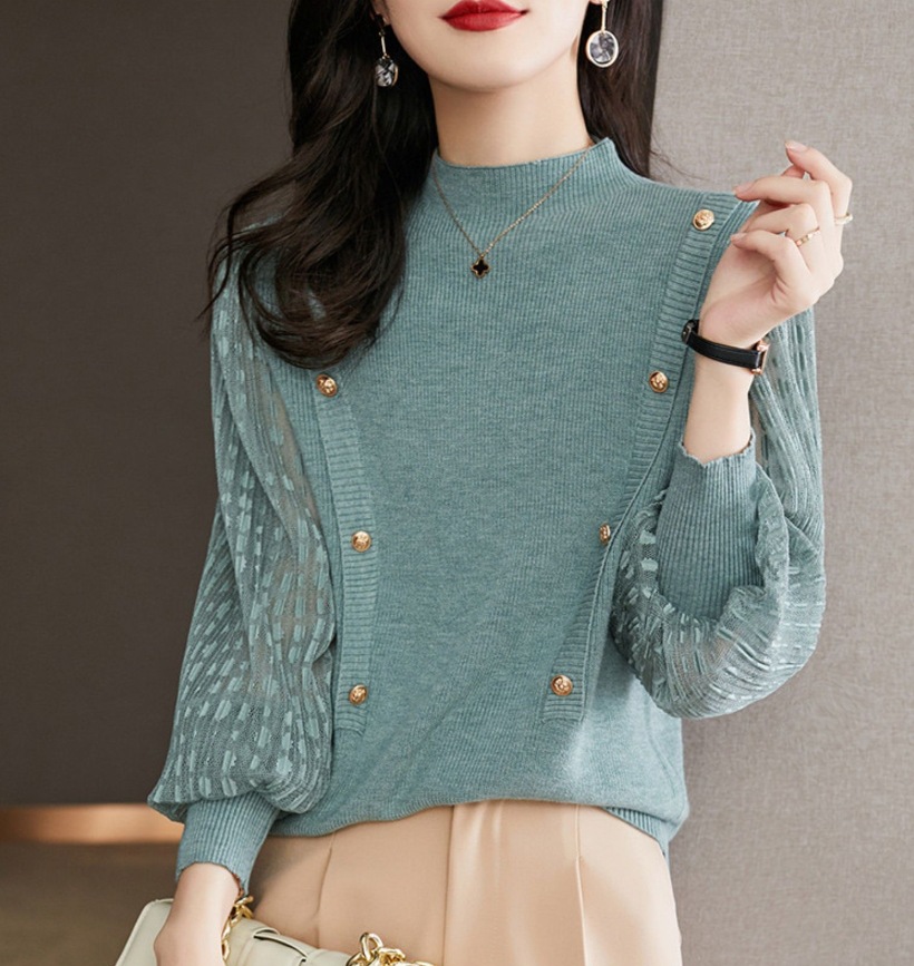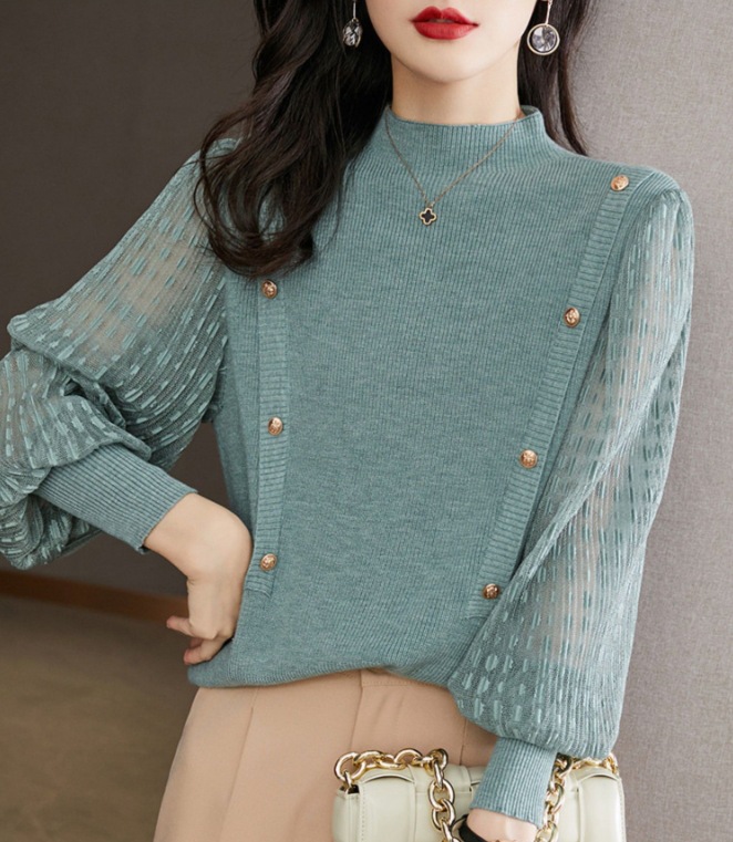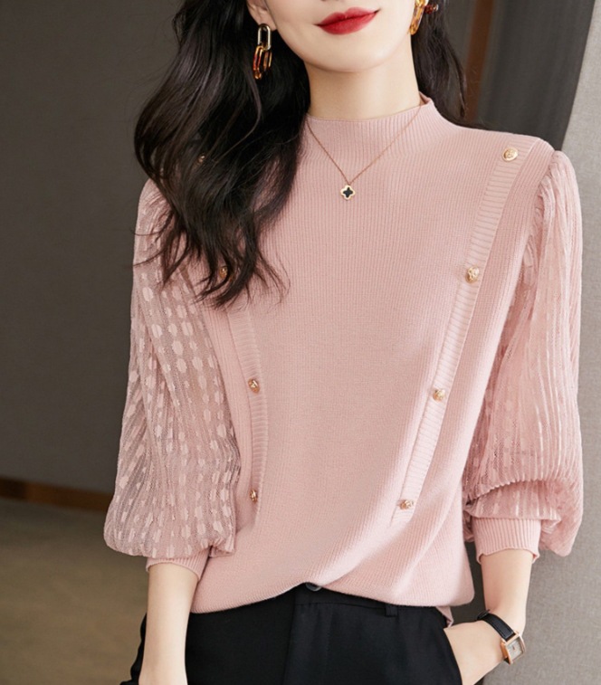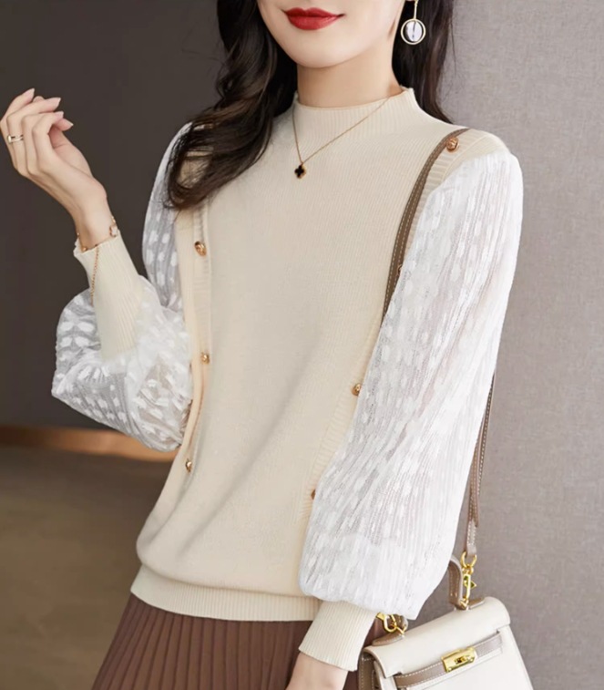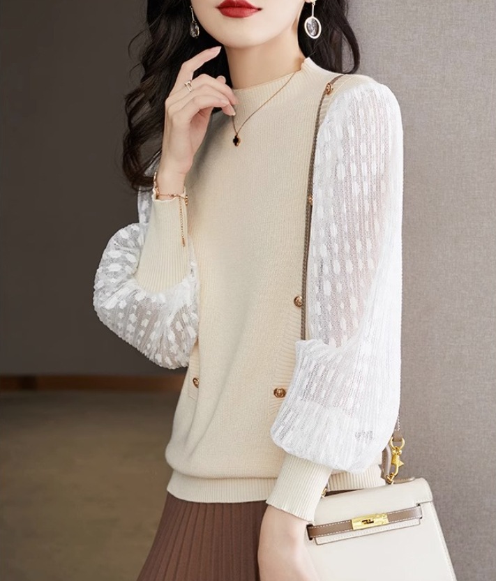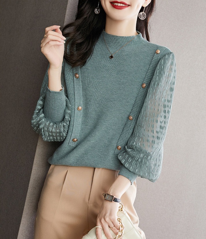 2025 봄과 가을 스타일 작은 향기 우아한 기질 스웨터 여성 하프 터틀넥 바닥 스웨터 짧은 랜턴 슬리브 탑
