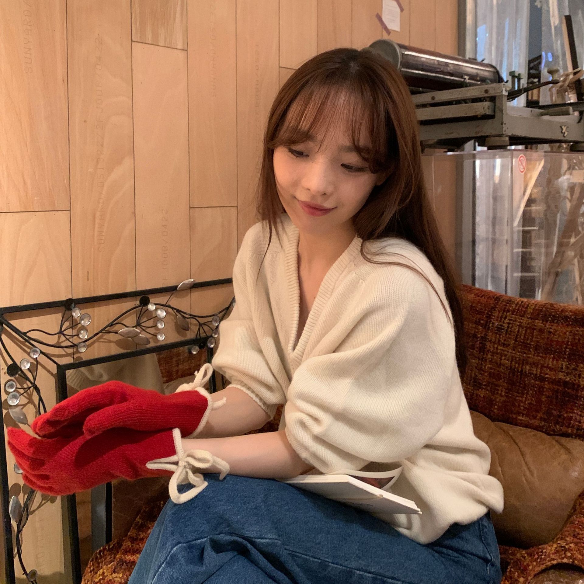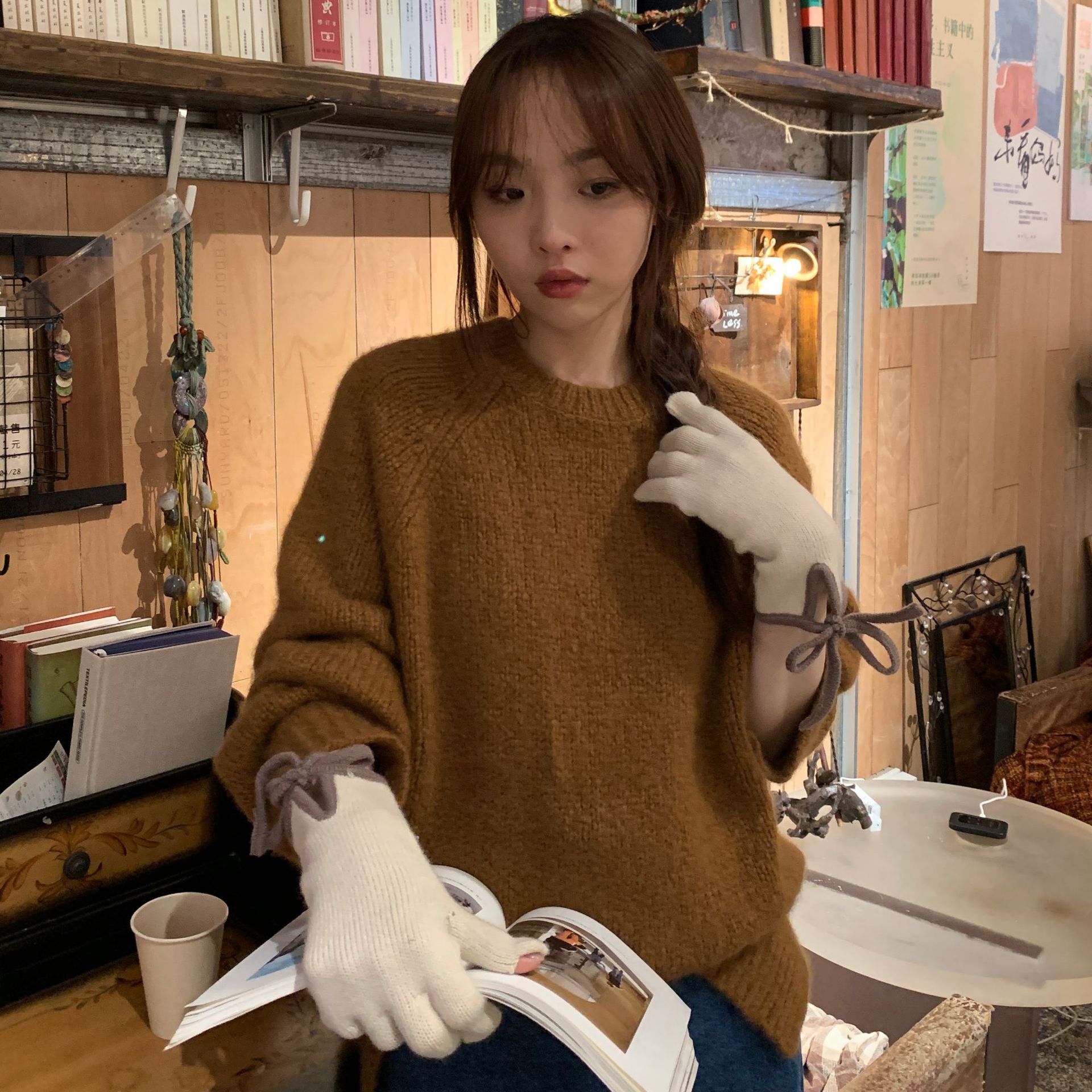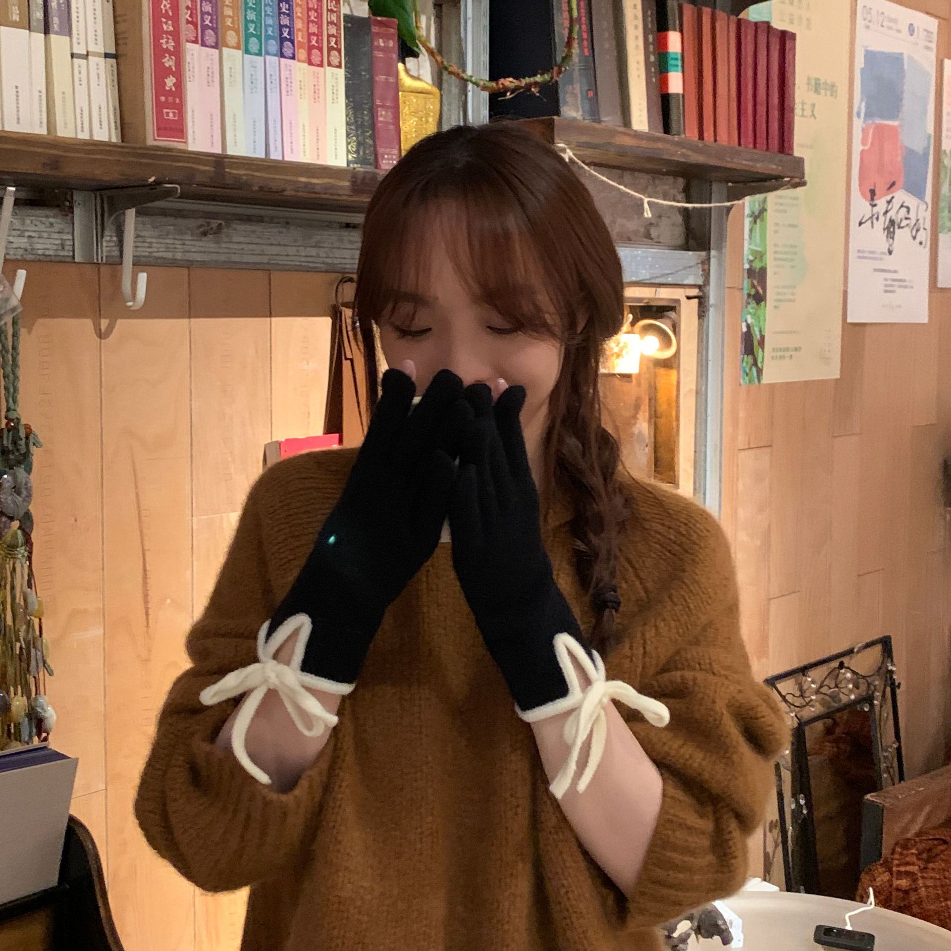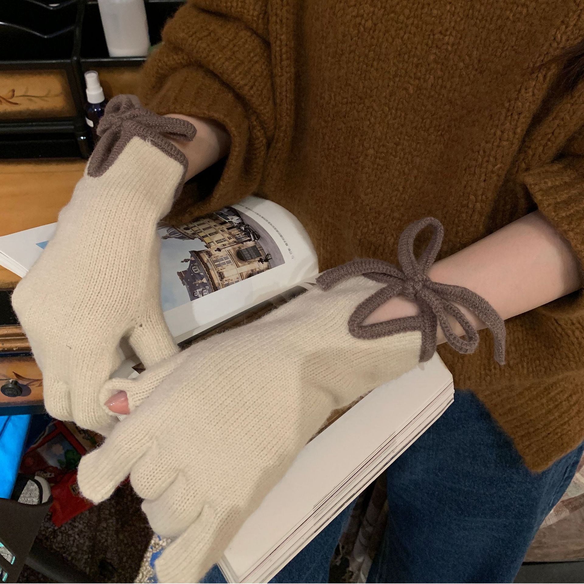 레이디 보우 스트랩 솔리드 컬러 니트 힙합 장갑 운전 및 사이클링 따뜻한 방풍 두꺼운 터치 스크린 장갑스토어 가기