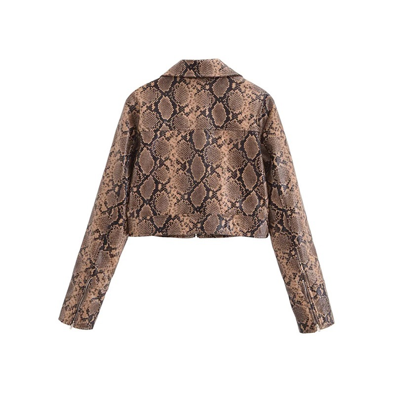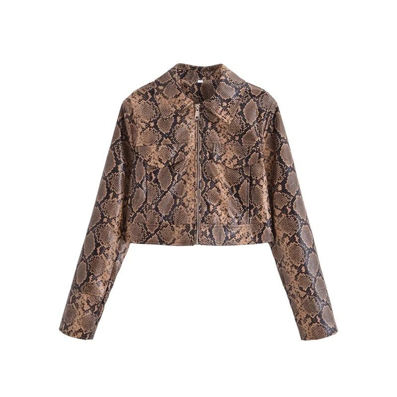 유럽과 미국 스타일의 섹시한 뱀 패턴 폴로 칼라 긴팔 PU 가죽 자켓 가을 여성을위한 새로운 느슨한 짧은 캐주얼 자켓스토어 가기
