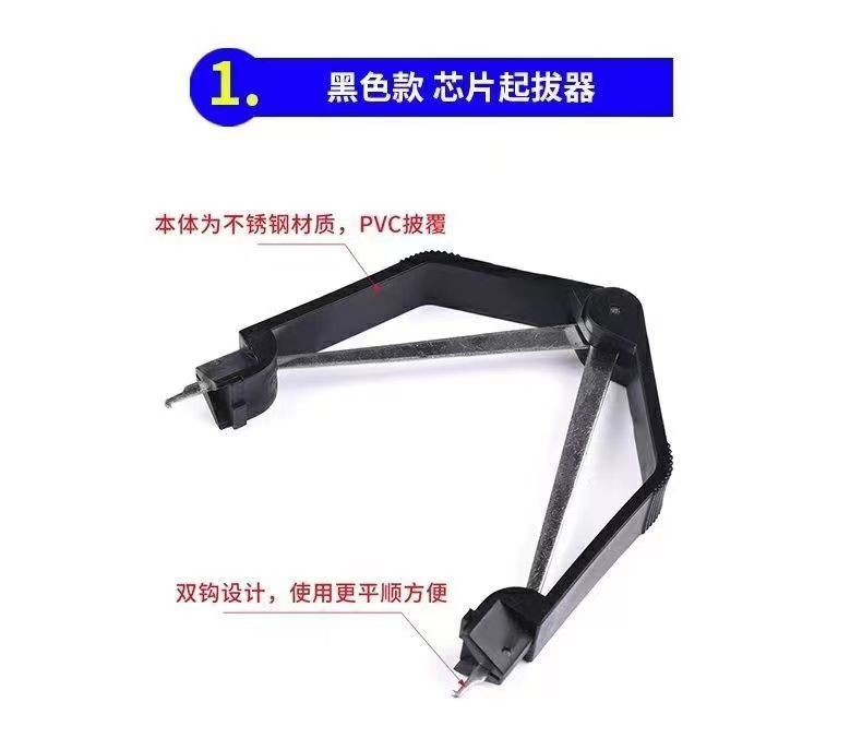 拔取PLCC芯片,如果用一字螺丝刀,因周围有其他元件,很不顺手,如果没有专用的拔取夹,是很难取下的,操作不当,会导致插座或芯片受损,甚至造成芯片折裂、断脚。我们为您准备的芯片起拔夹,可直接上板使用,方便拔取PLCC封装的芯片,是起拔各种芯片、集成块的好工具,用于主板、单片机、编程器。