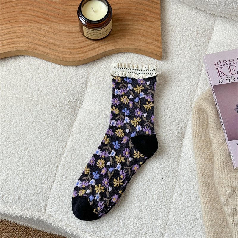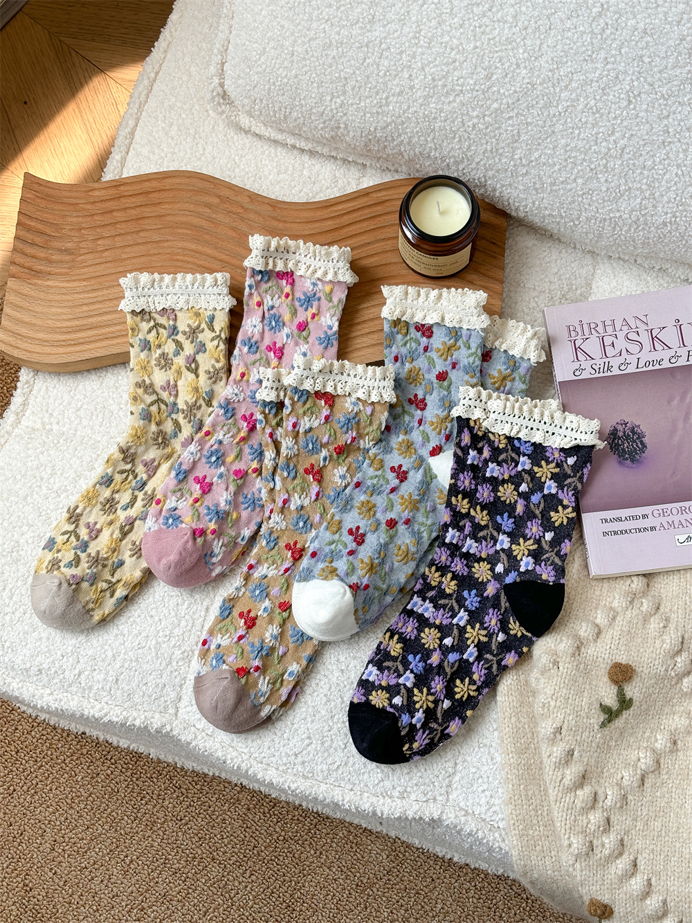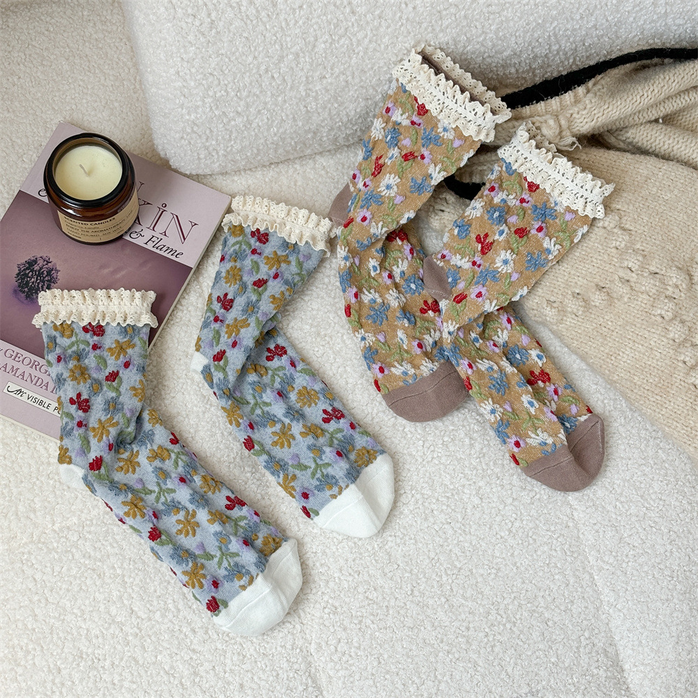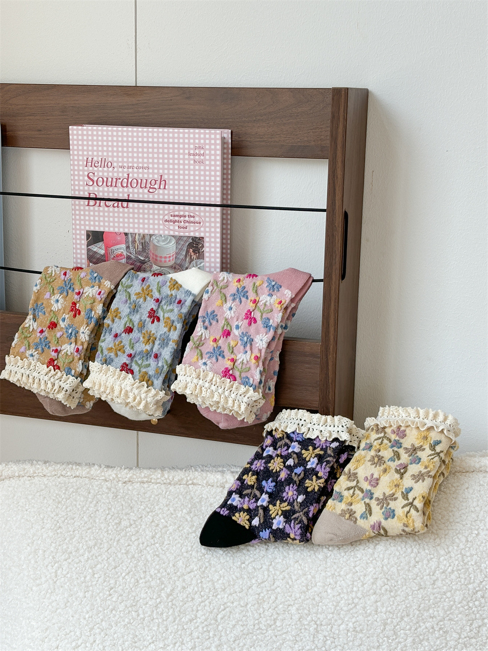 가을과 겨울 새로운 일본 스타일 레이스 빈티지 3 차원 꽃 중간 튜브 여성용 양말 패션 면 스택 양말