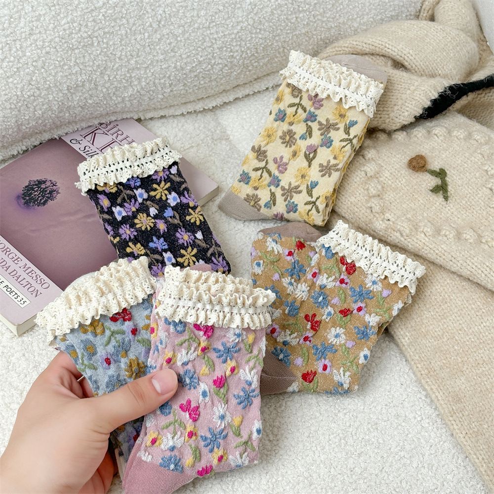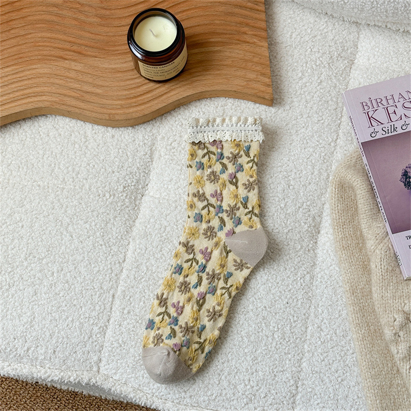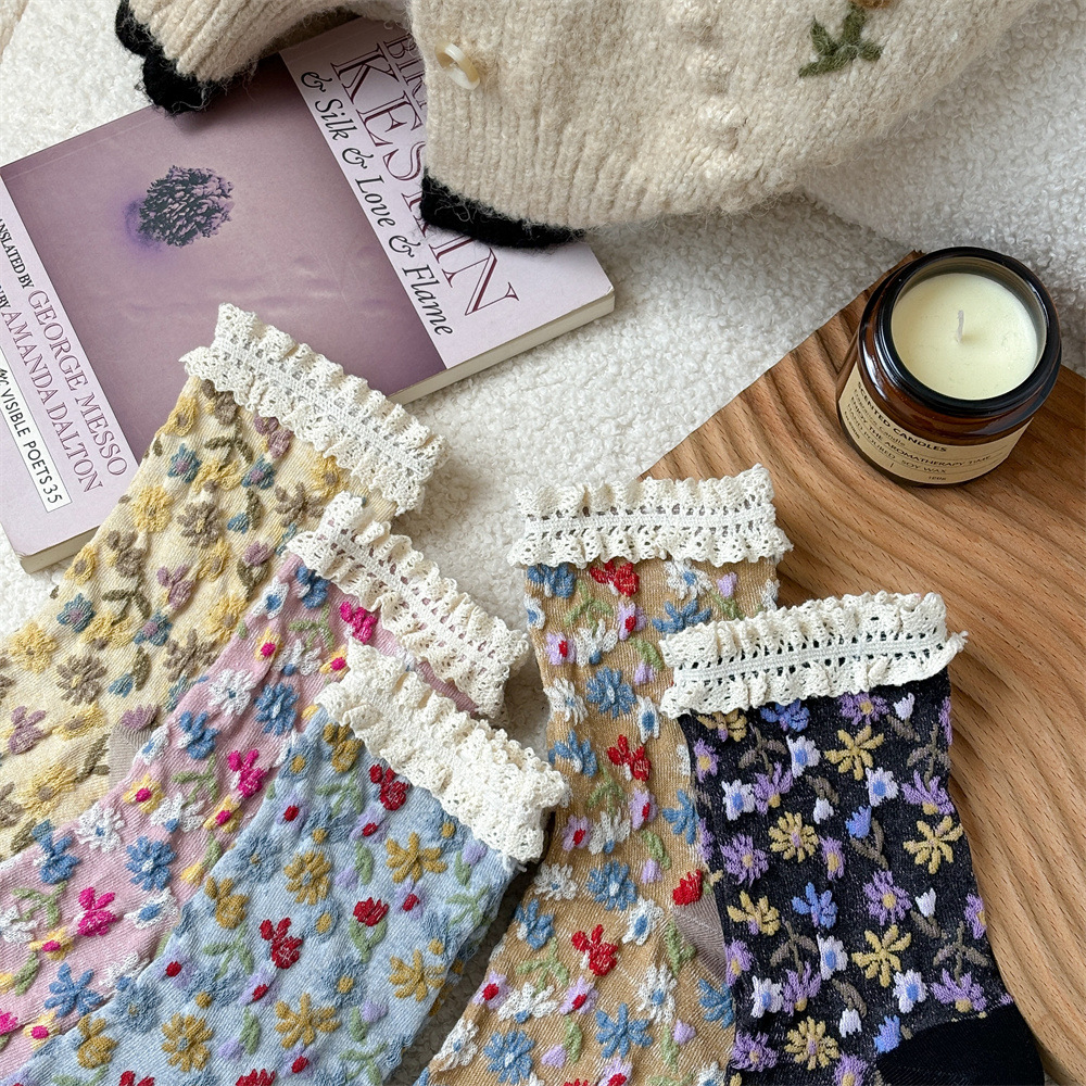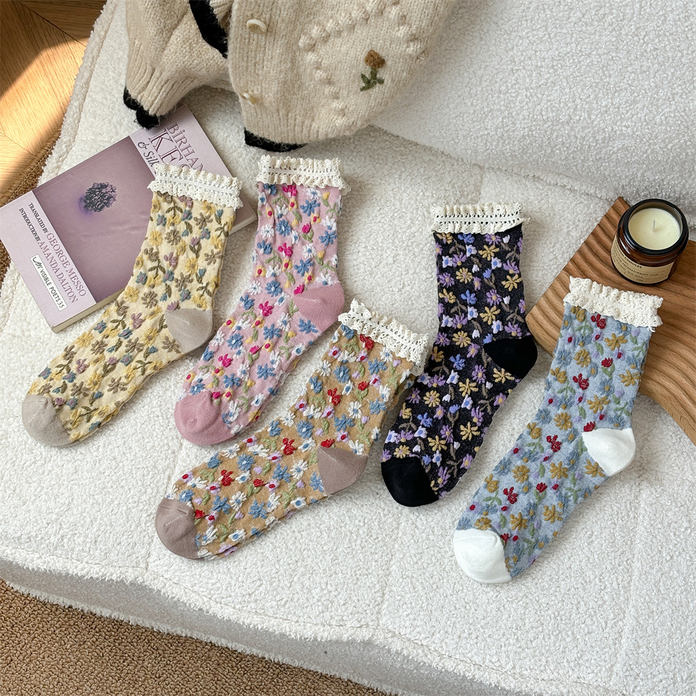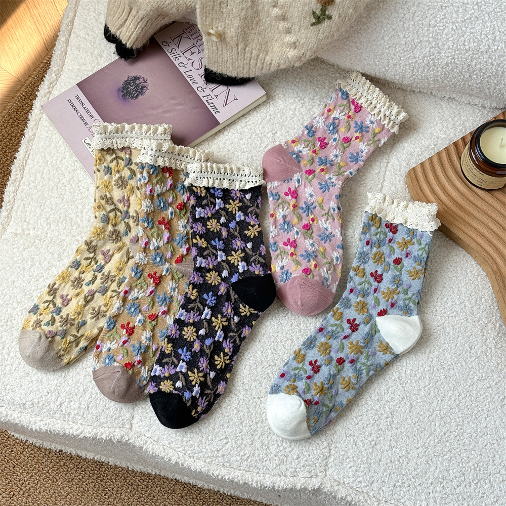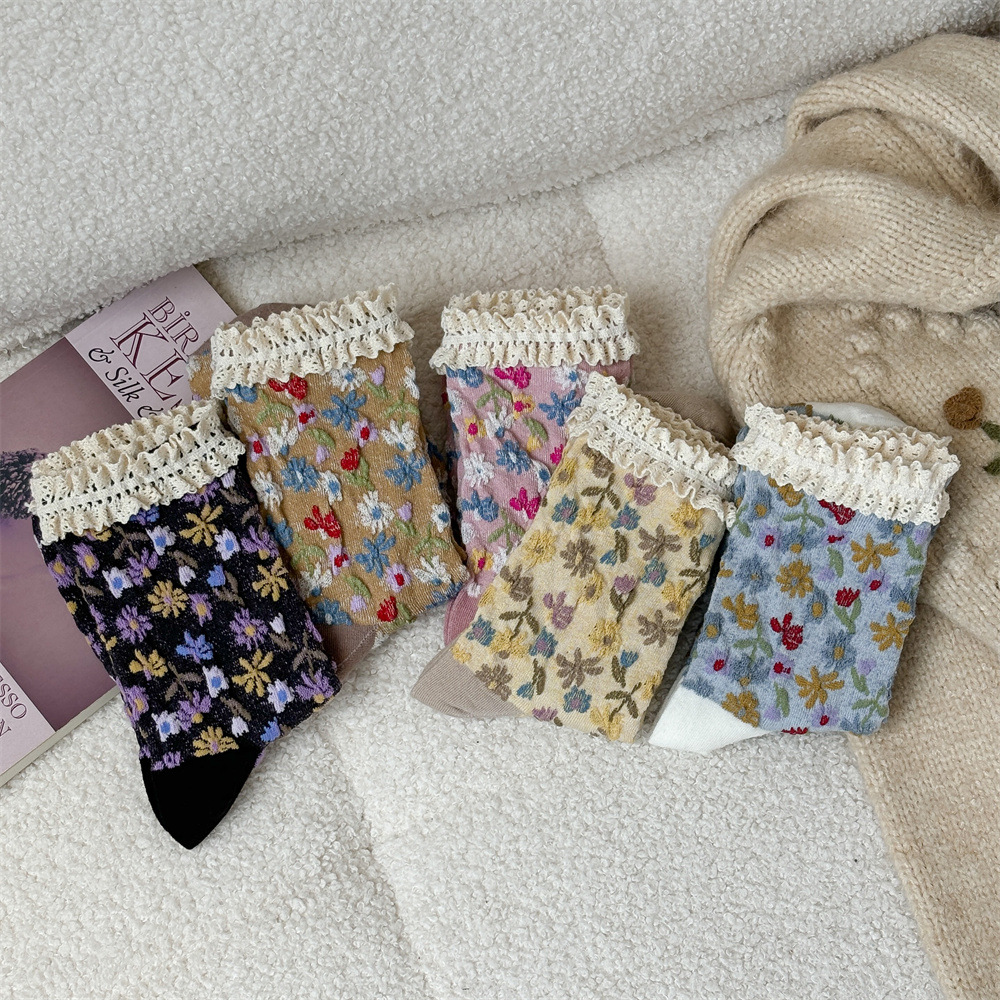가을과 겨울 새로운 일본 스타일 레이스 빈티지 3 차원 꽃 중간 튜브 여성용 양말 패션 면 스택 양말스토어 가기