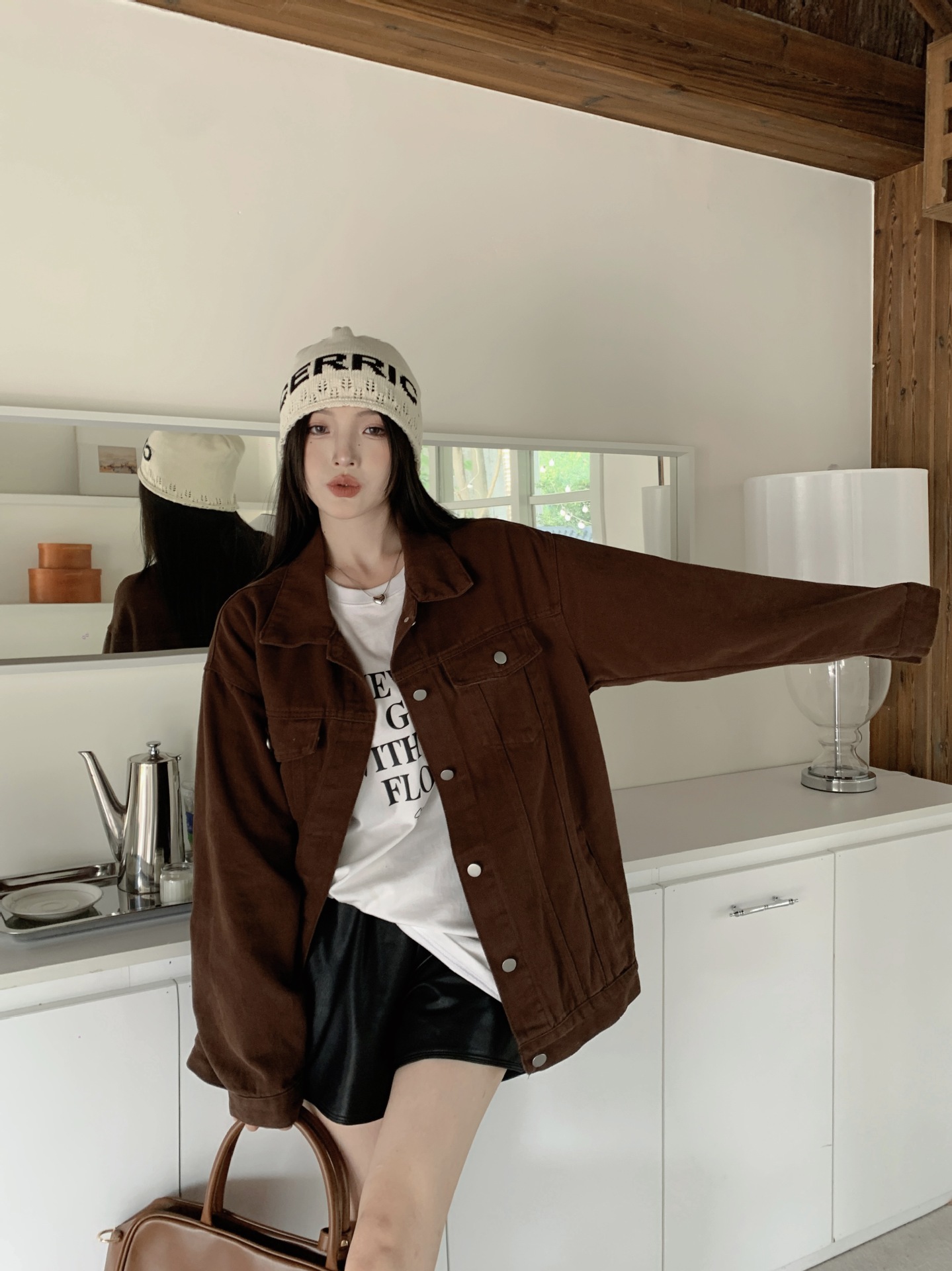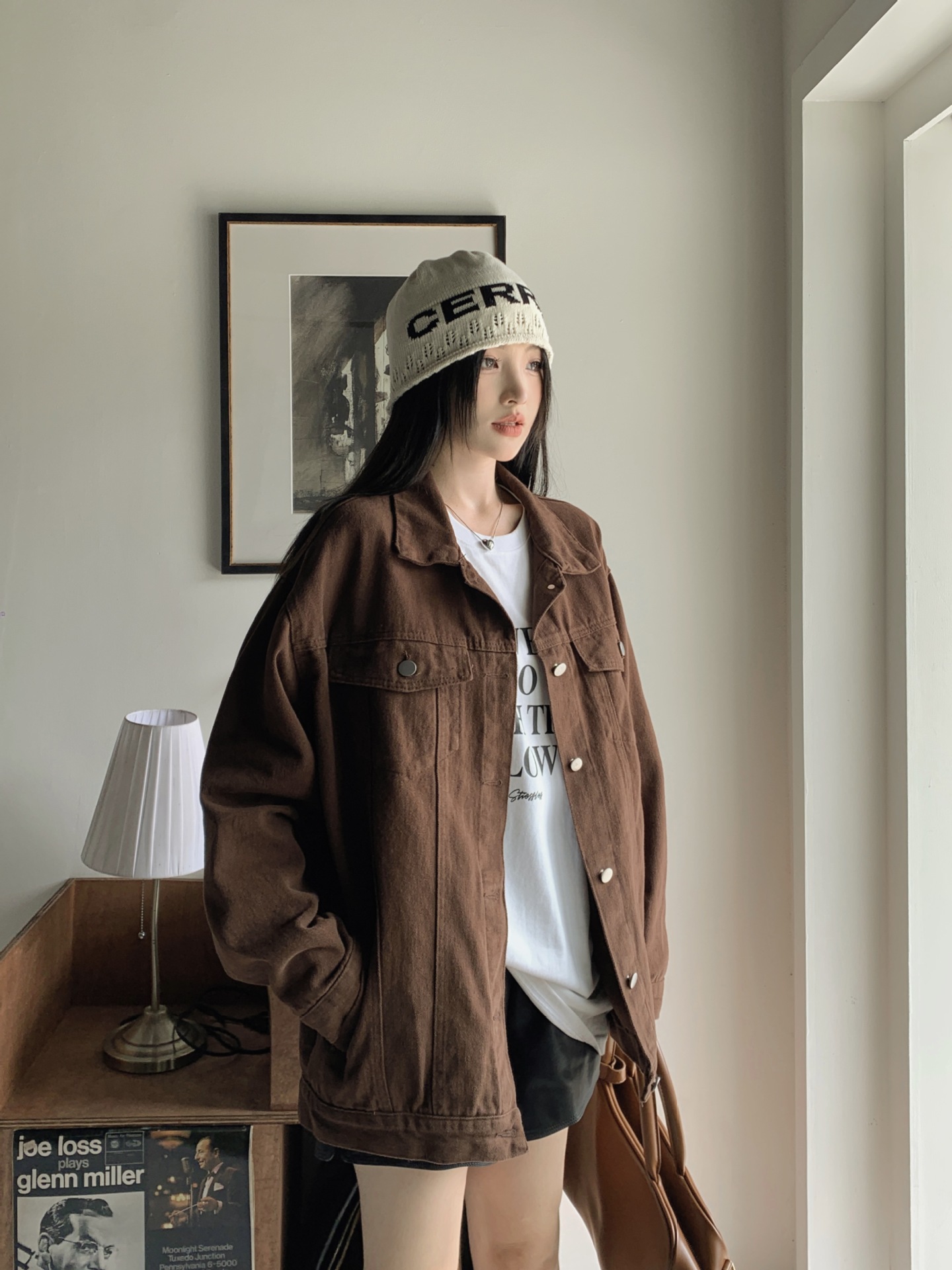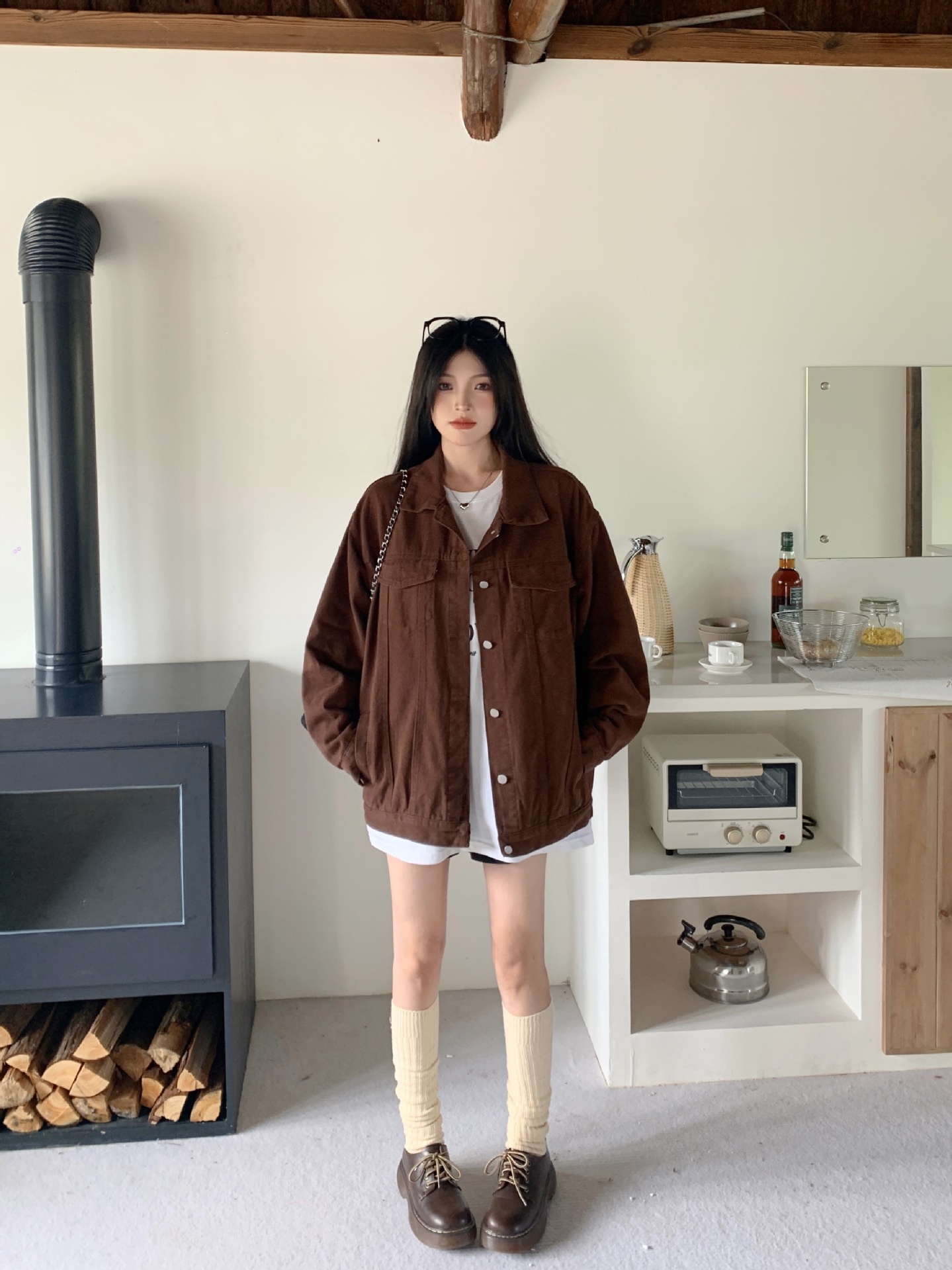 아메리칸 스타일 레트로 다크 브라운 샌딩 데님 코트 여성 봄과 가을 작은 툴링 캐주얼 자켓 랩 느슨한 슬리밍스토어 가기