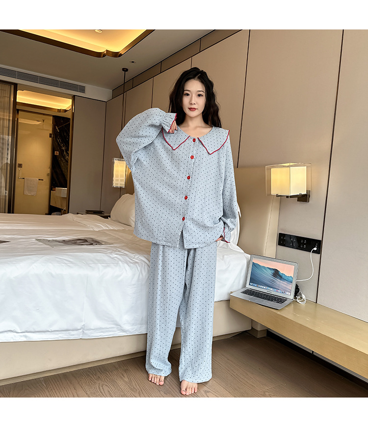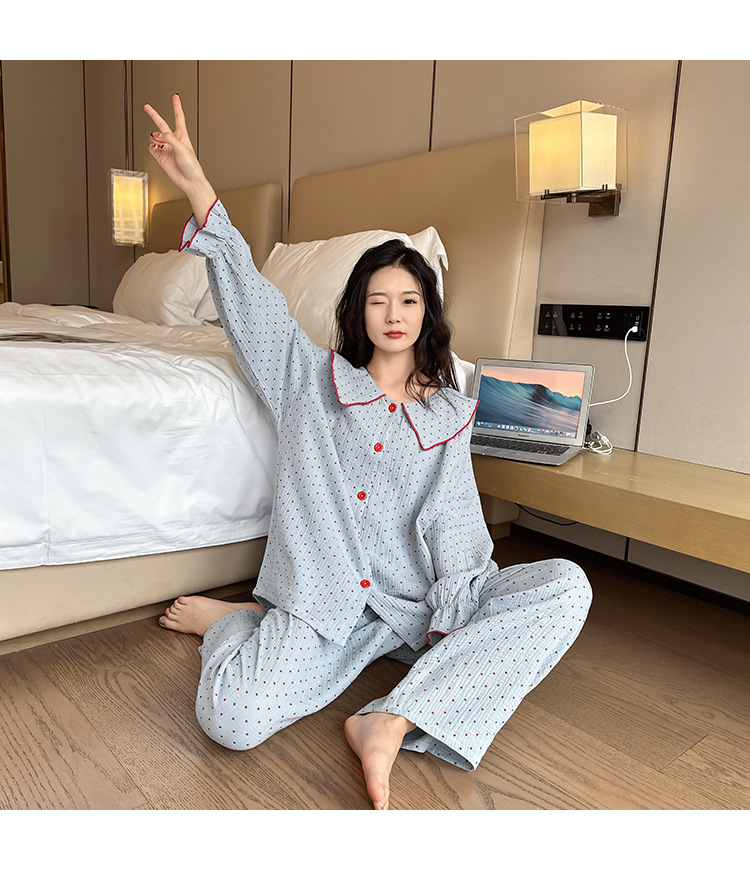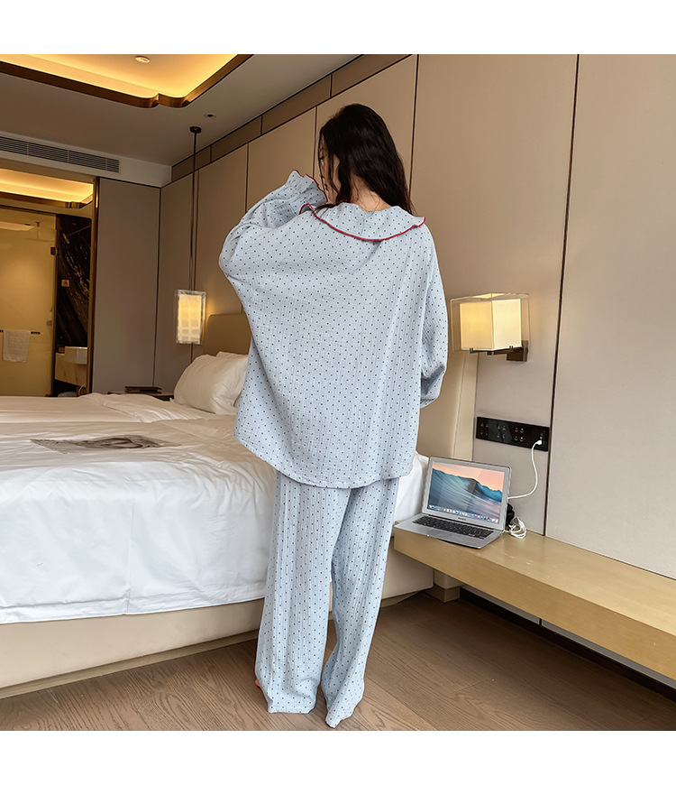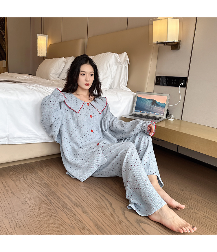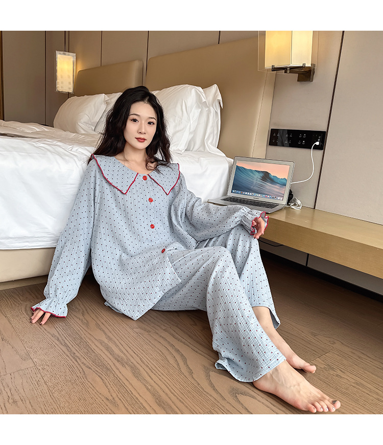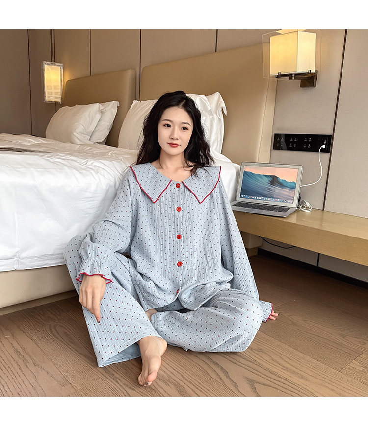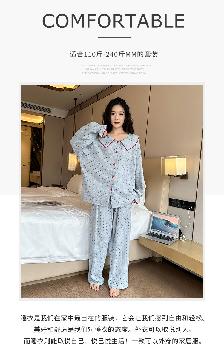 봄, 가을, 겨울용 대형 사이즈 순면 잠옷, 여성용 홈웨어 세트, 뚱뚱한 여성을 위한 물방울 무늬의 달콤한 스타일, 외부에서 착용 가능스토어 가기