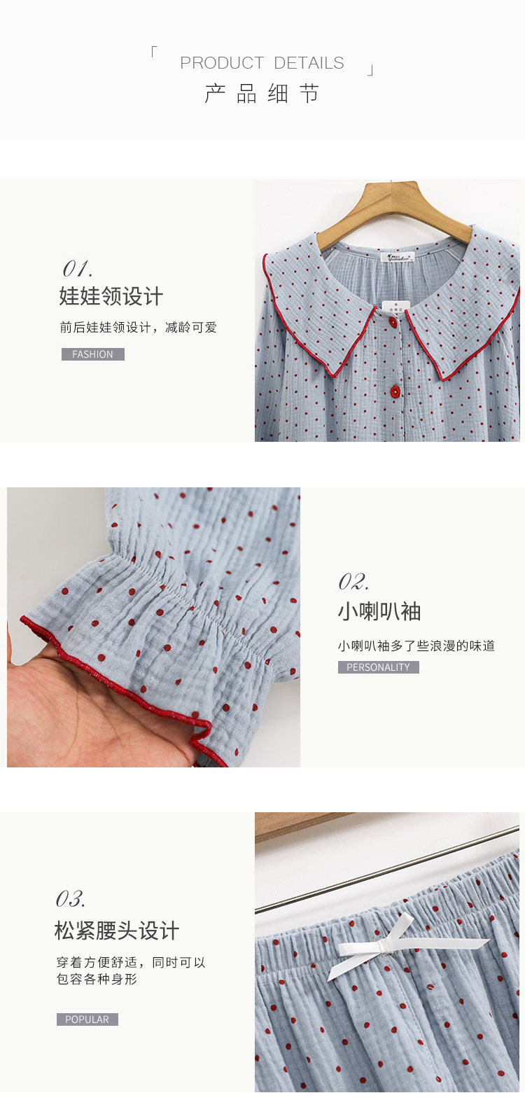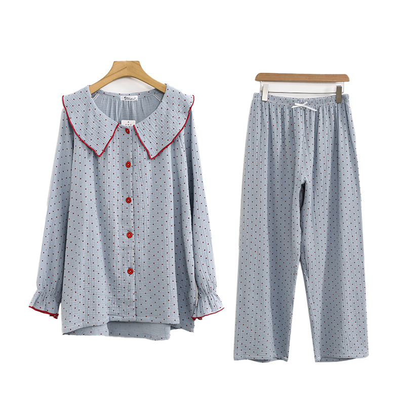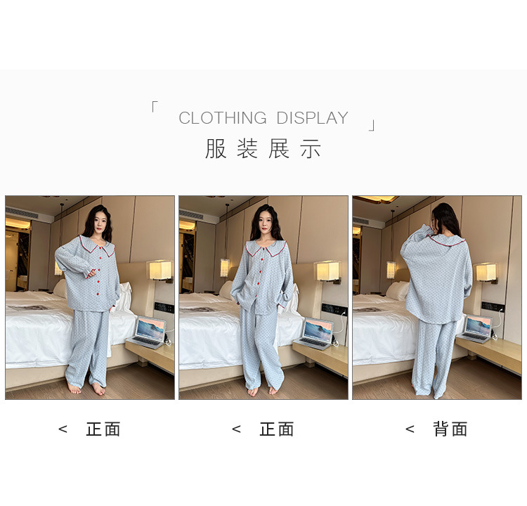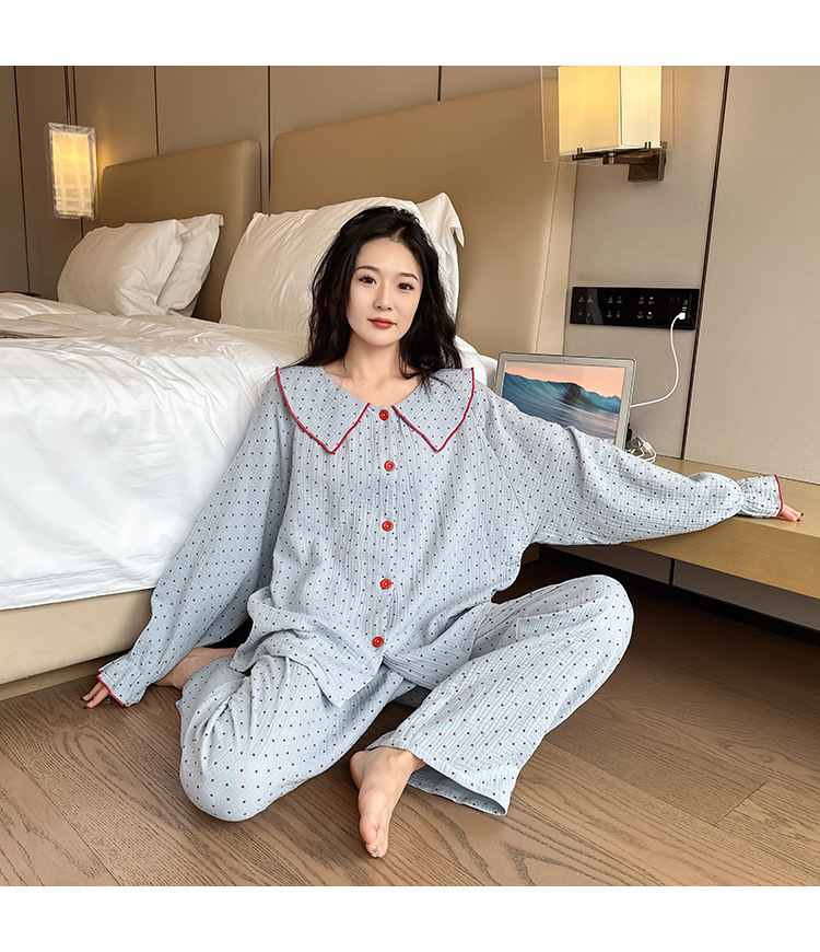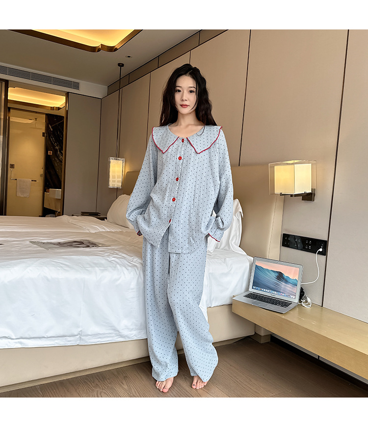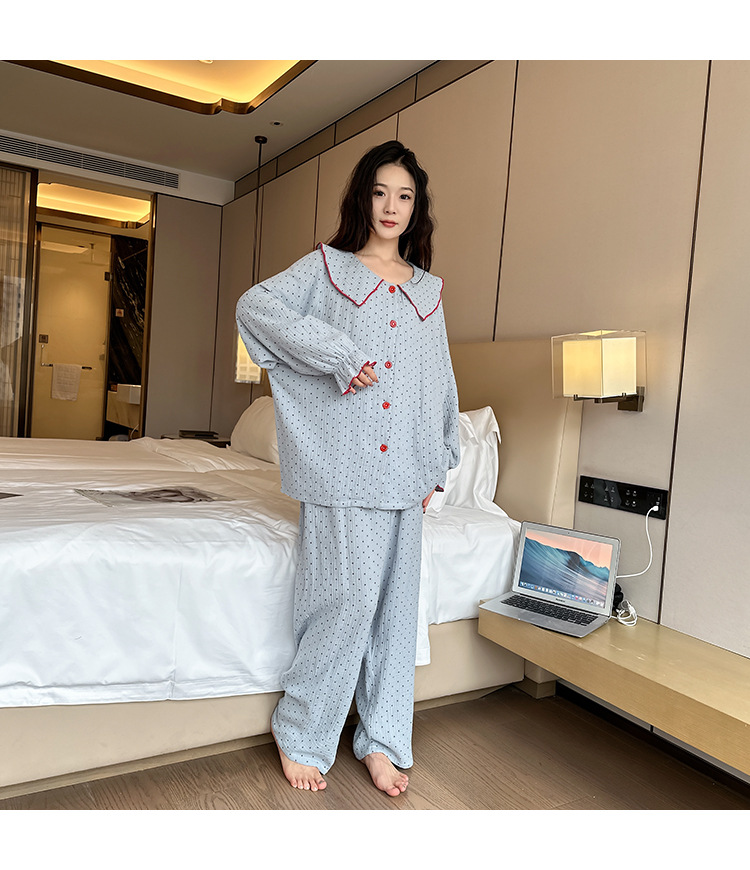 봄, 가을, 겨울용 대형 사이즈 순면 잠옷, 여성용 홈웨어 세트, 뚱뚱한 여성을 위한 물방울 무늬의 달콤한 스타일, 외부에서 착용 가능스토어 가기