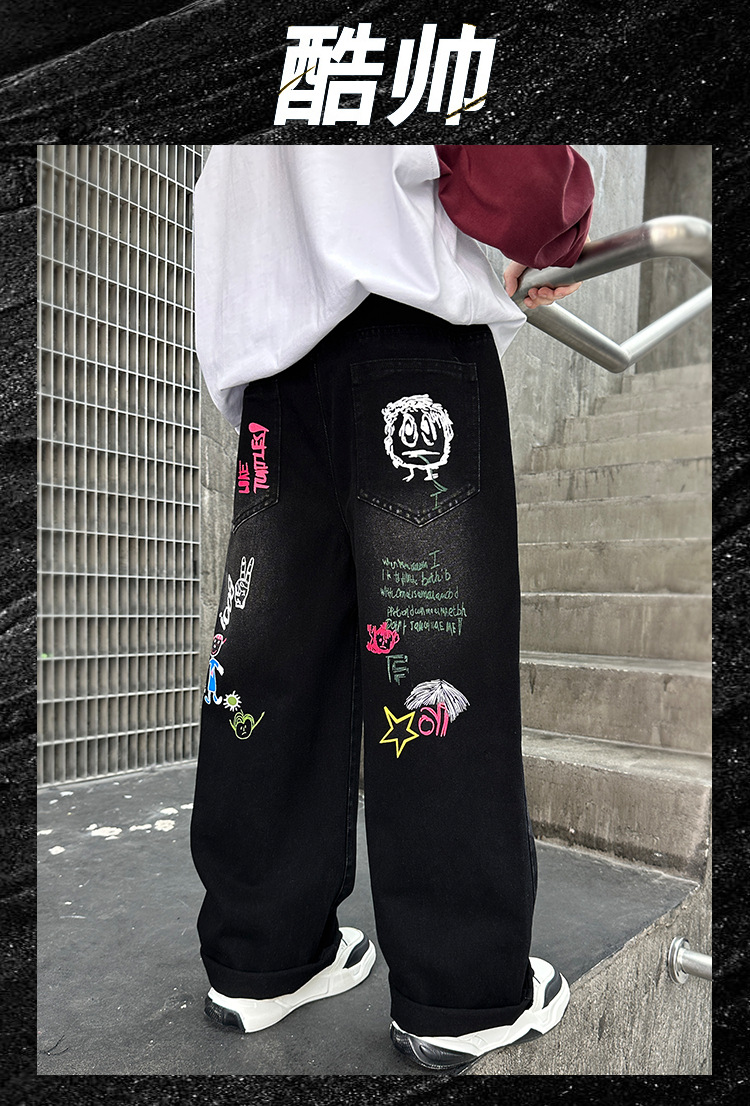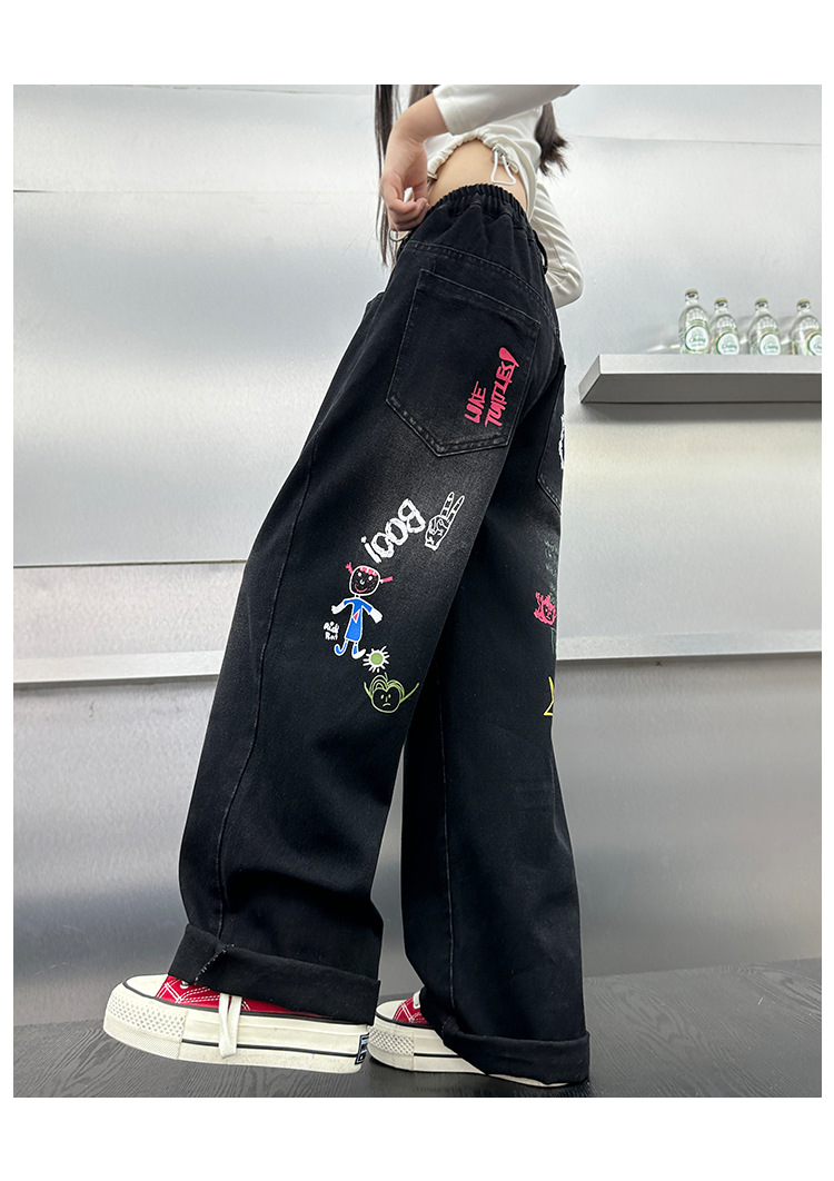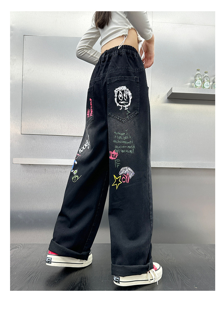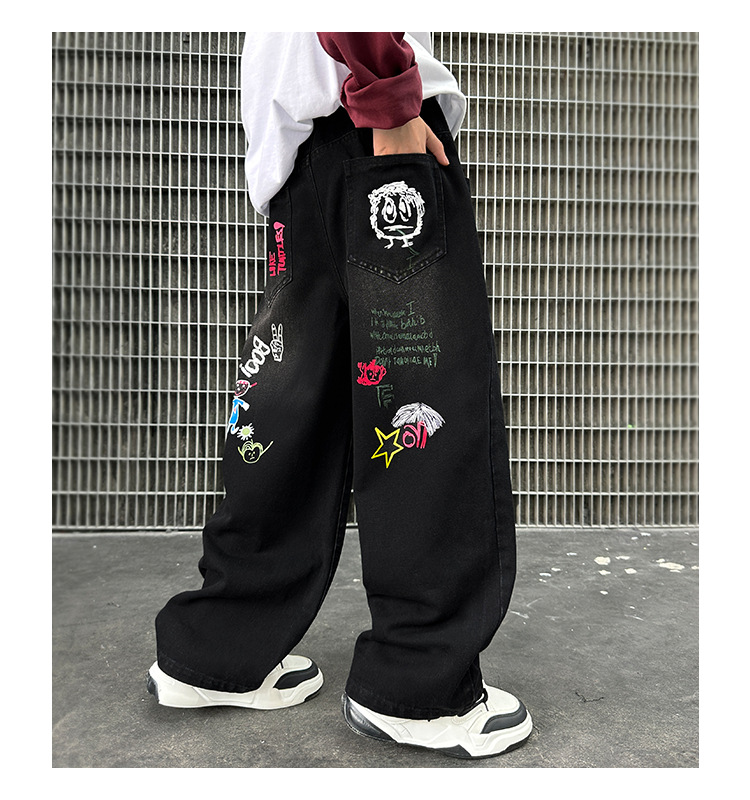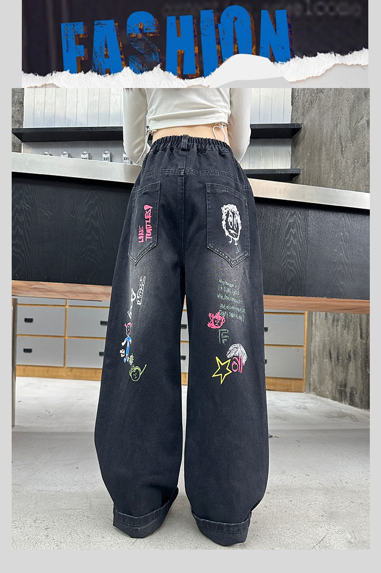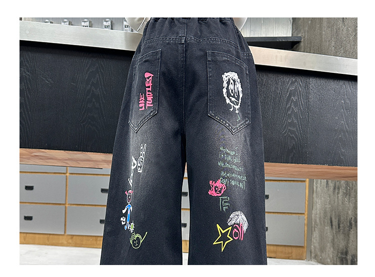 남아 및 여아 청바지, 2025 봄 가을 스타일, 아메리칸 그래피티 프린트 와이드 팬츠, 아동용 스트리트 스타일 루즈 스트레이트 팬츠