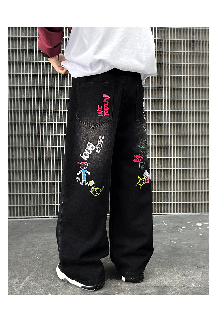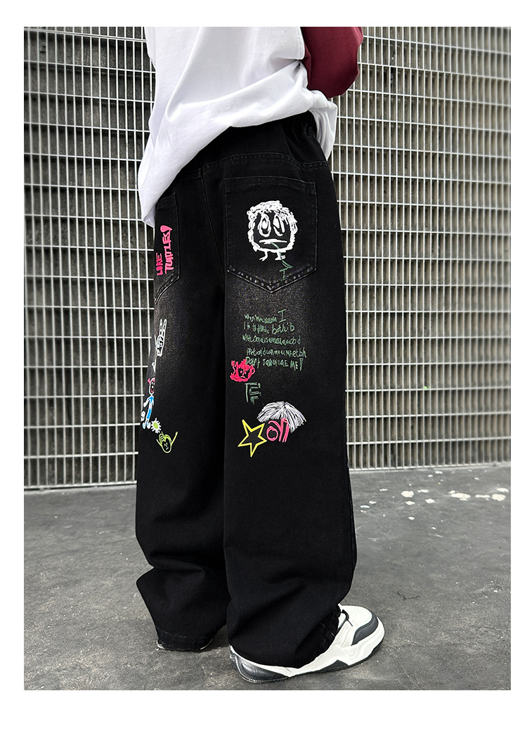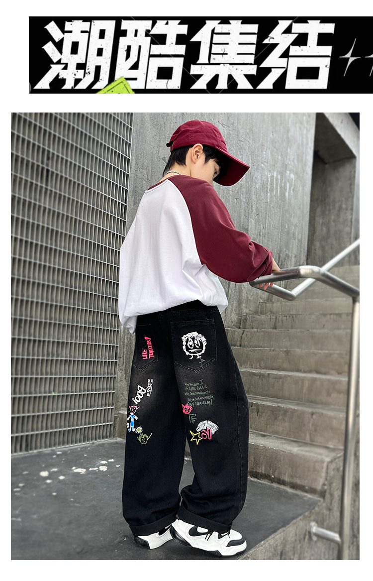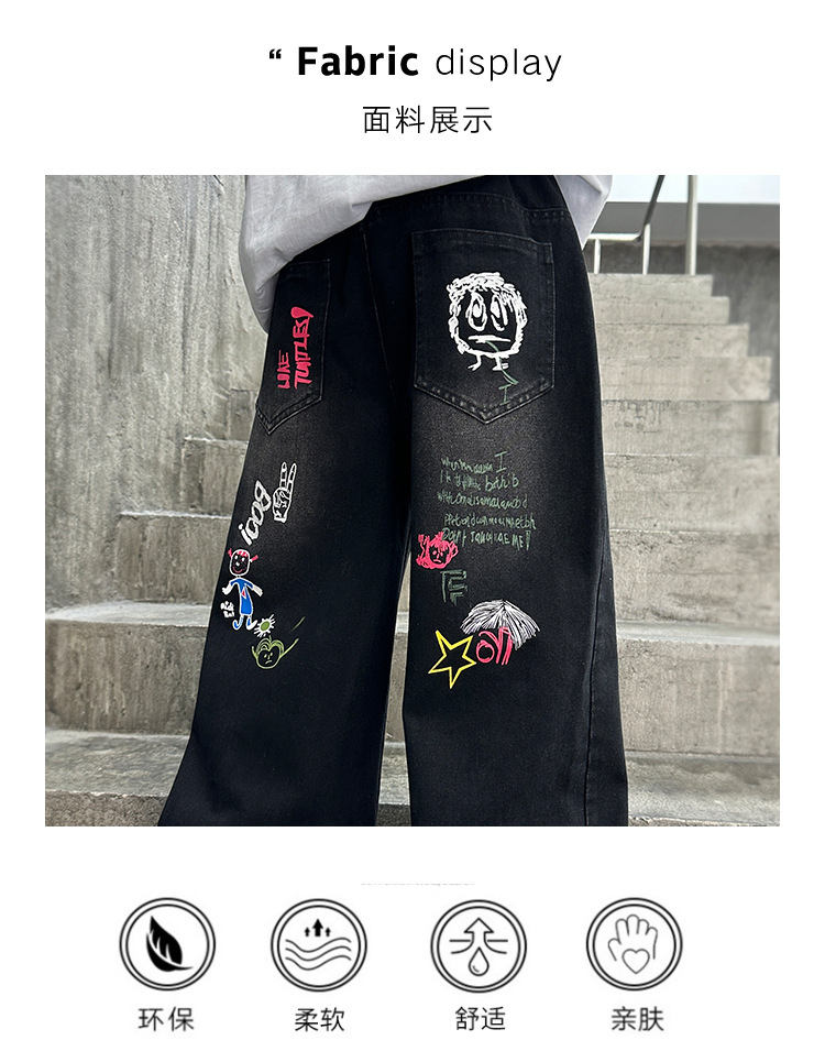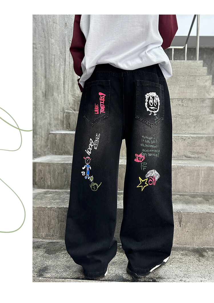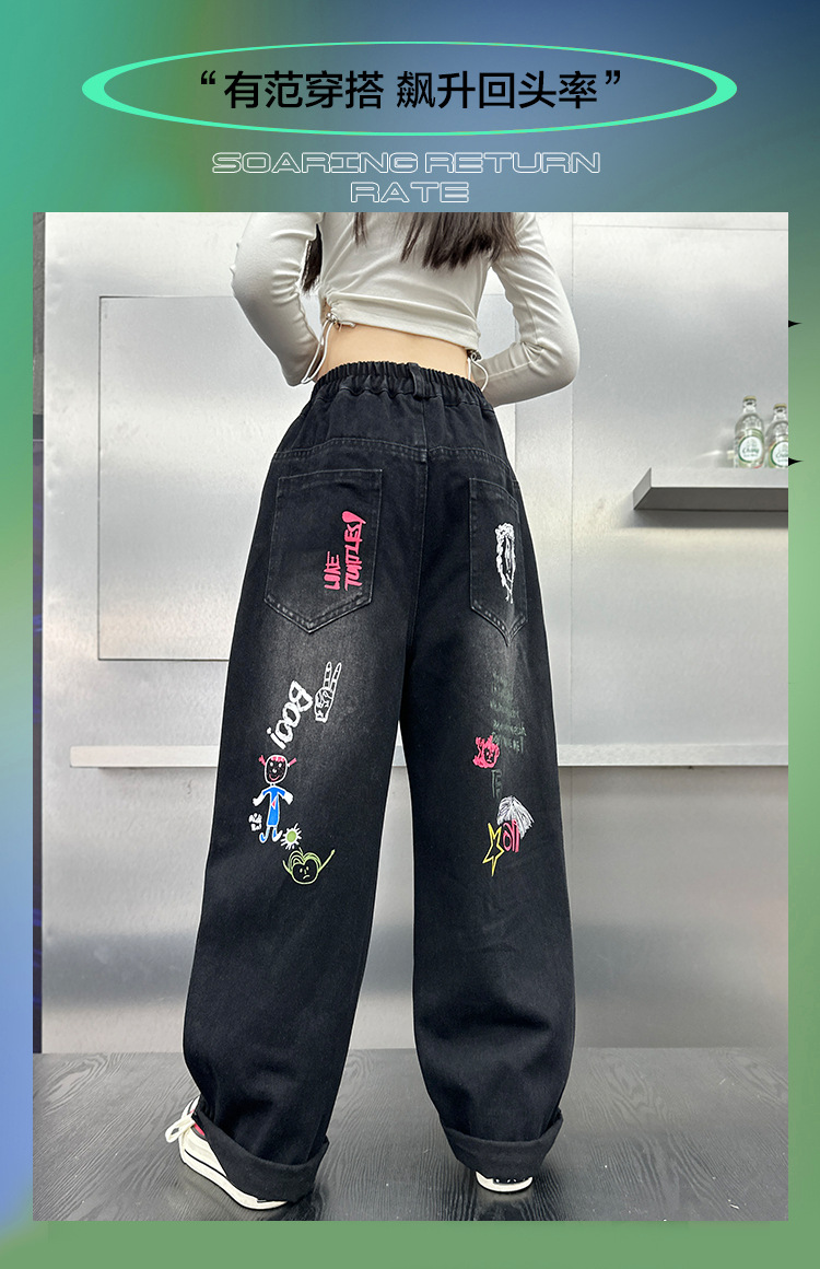 남아 및 여아 청바지, 2025 봄 가을 스타일, 아메리칸 그래피티 프린트 와이드 팬츠, 아동용 스트리트 스타일 루즈 스트레이트 팬츠