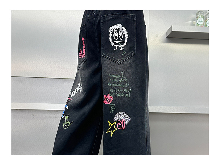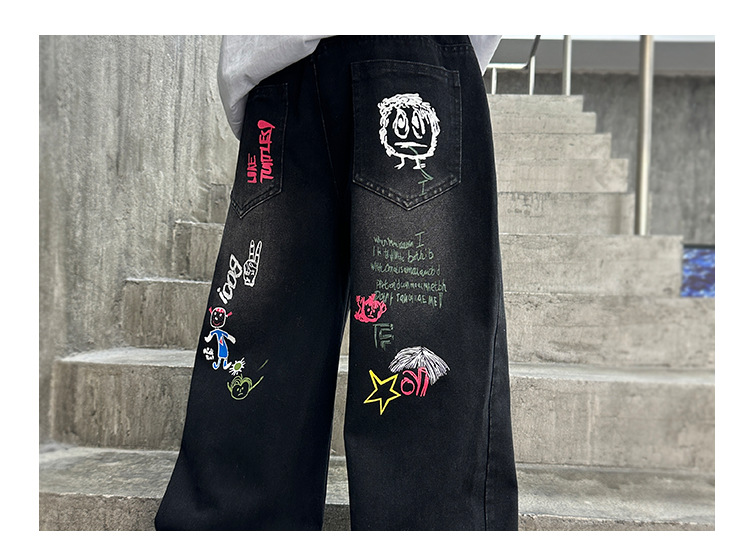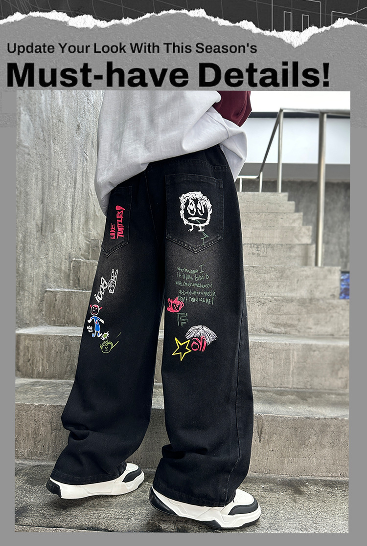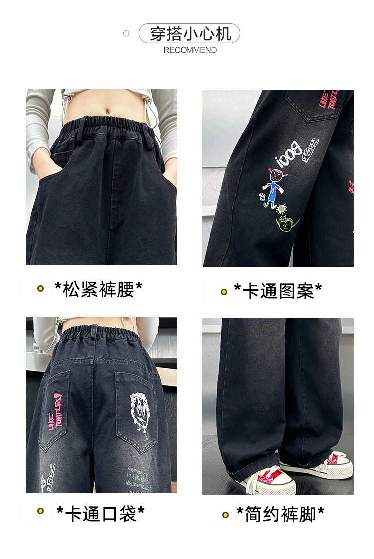 남아 및 여아 청바지, 2025 봄 가을 스타일, 아메리칸 그래피티 프린트 와이드 팬츠, 아동용 스트리트 스타일 루즈 스트레이트 팬츠스토어 가기
