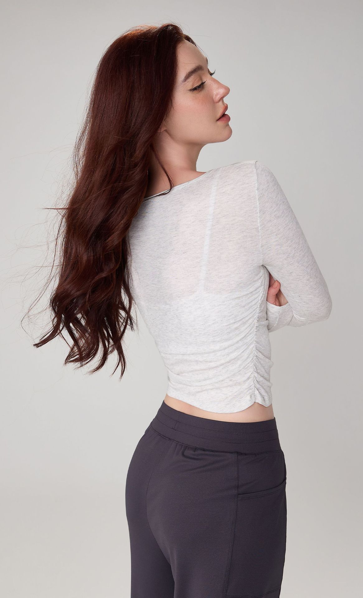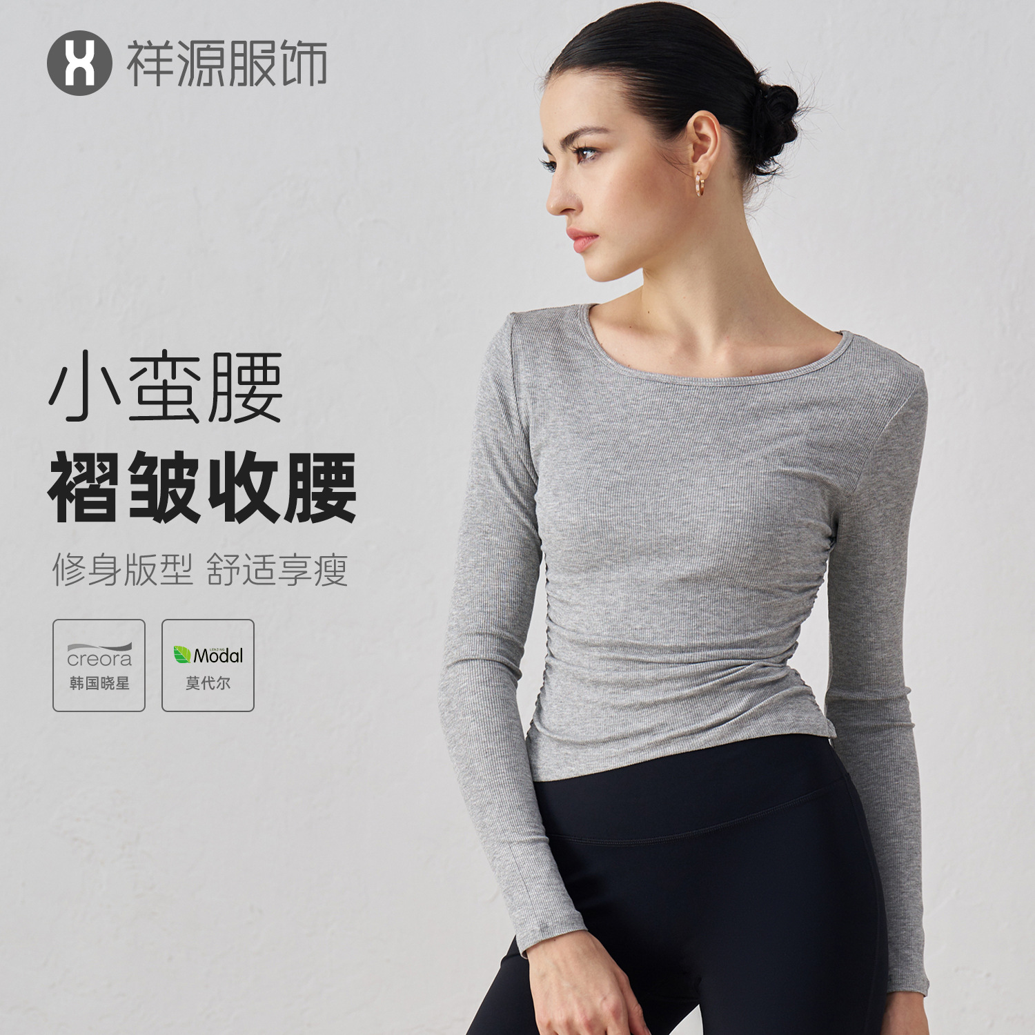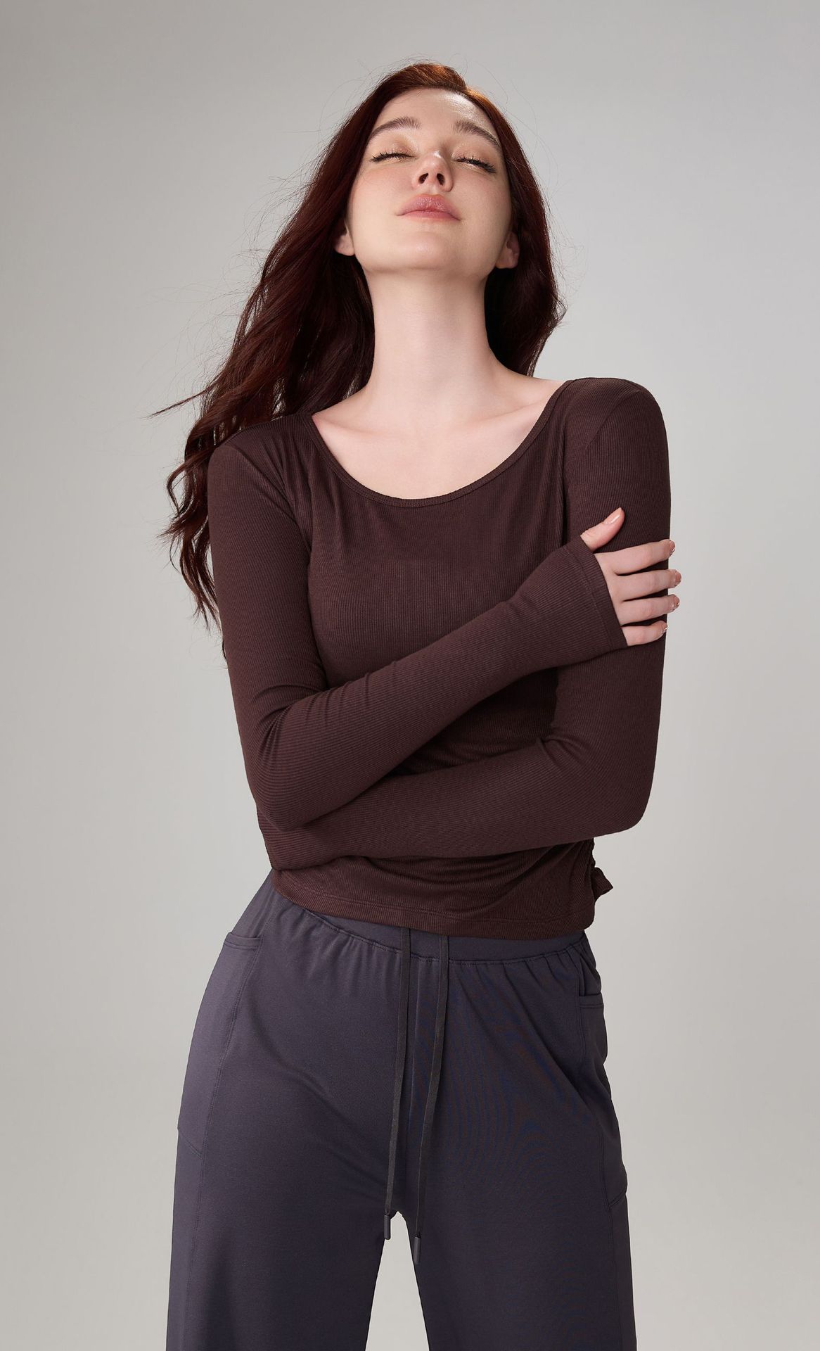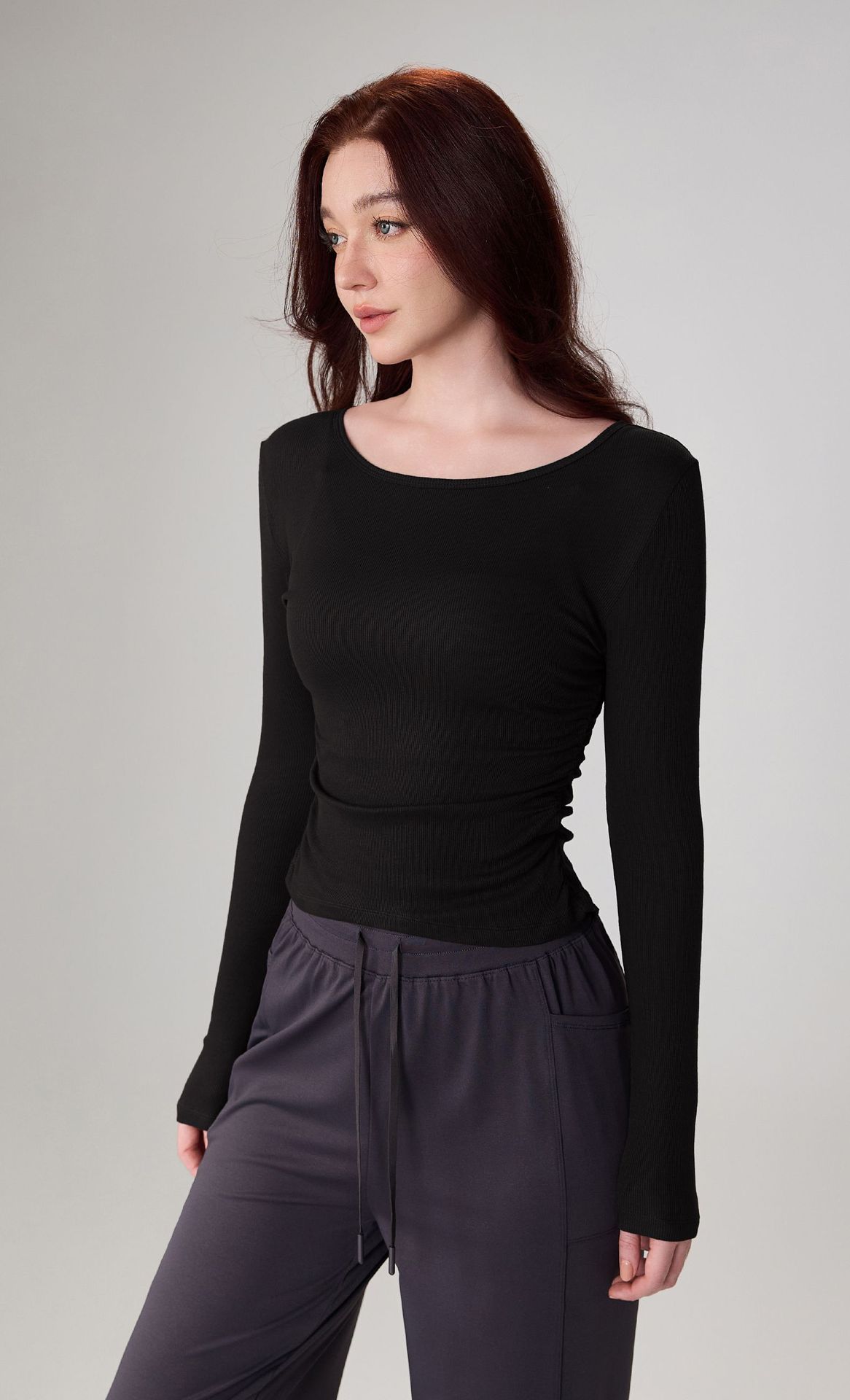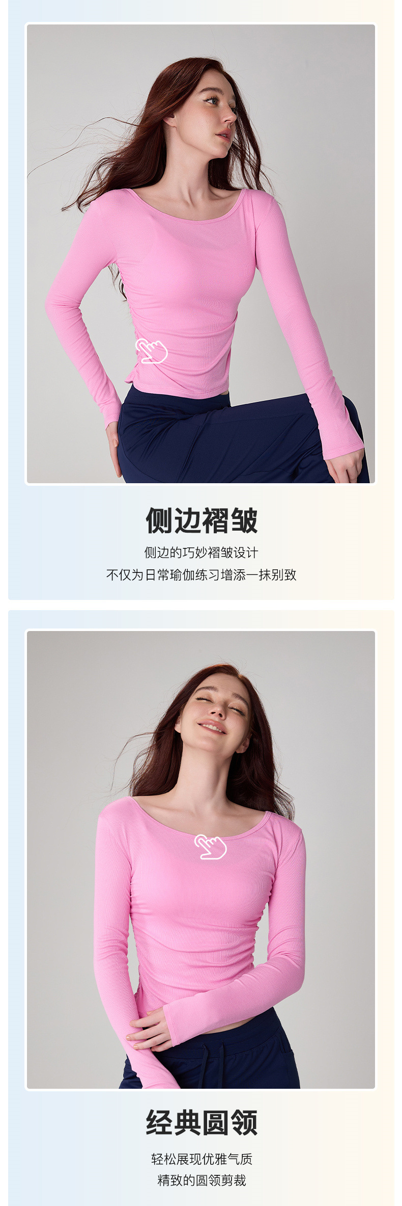 가을 알몸 요가 옷 플리츠 슬림 핏 크루 넥 스포츠 탑 여성용 손가락 커버 필라테스 러닝 피트니스 긴 소매스토어 가기
