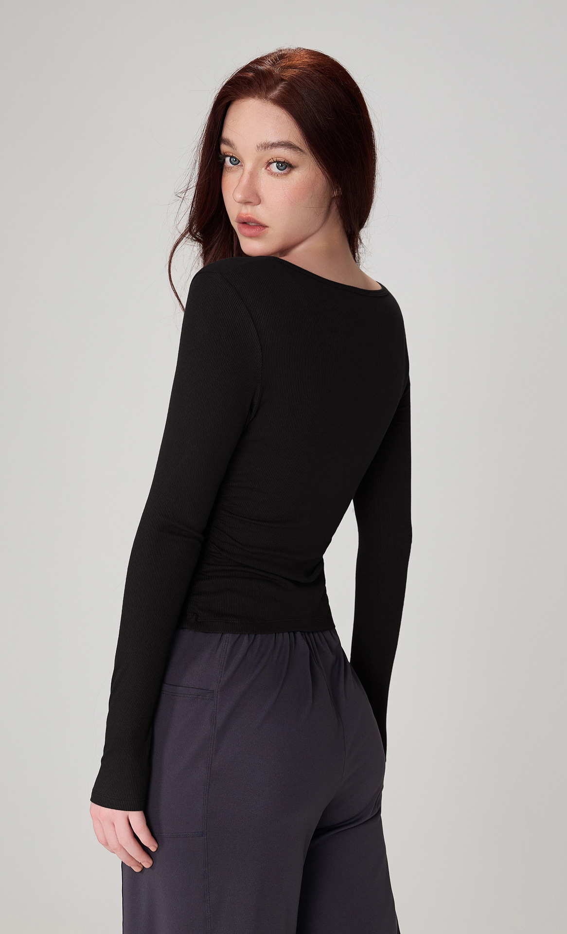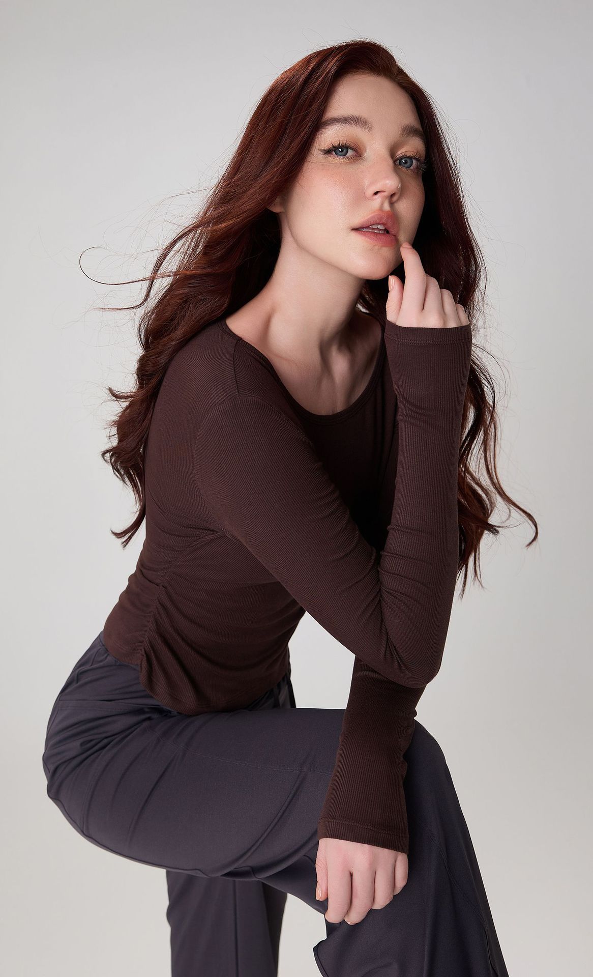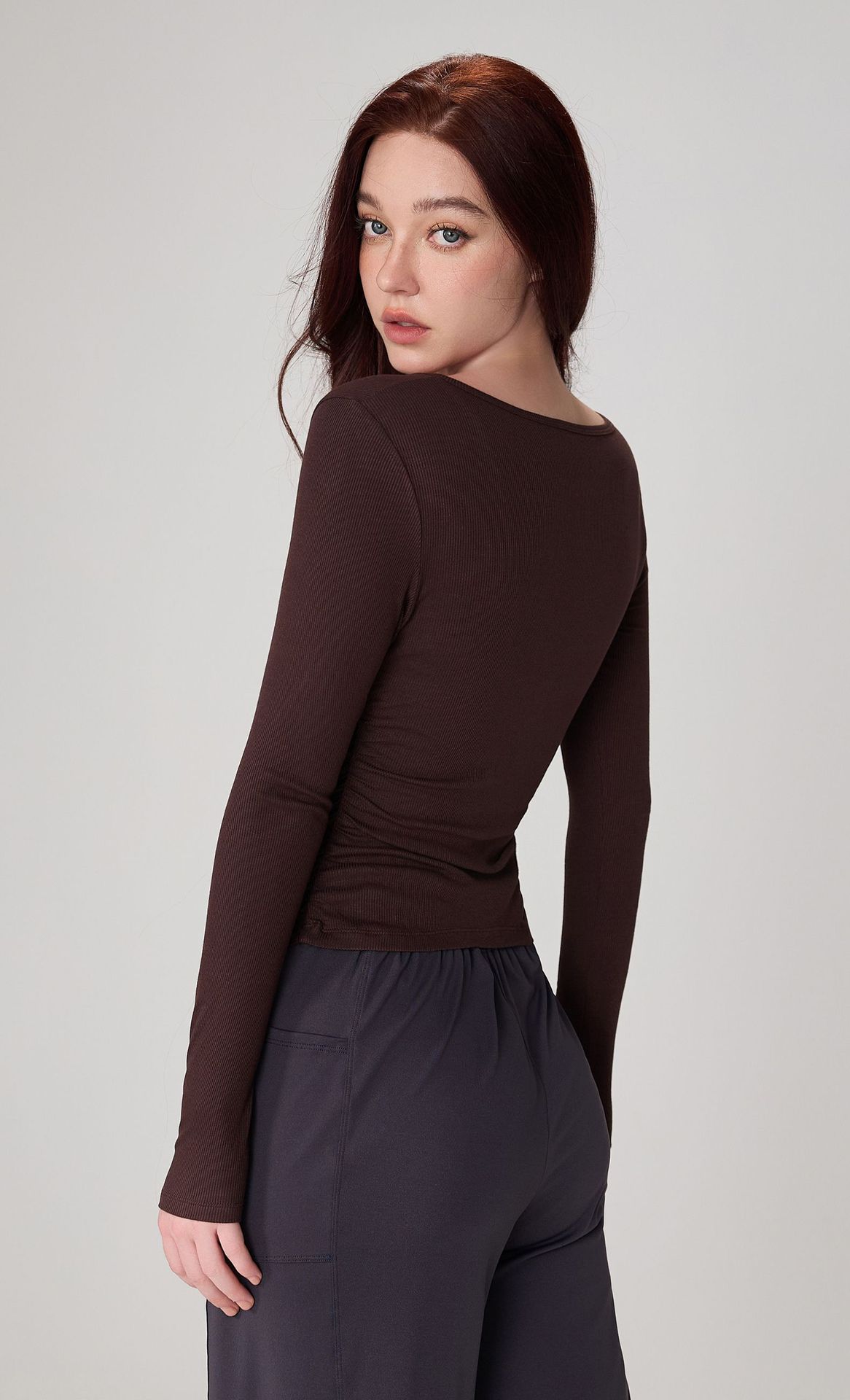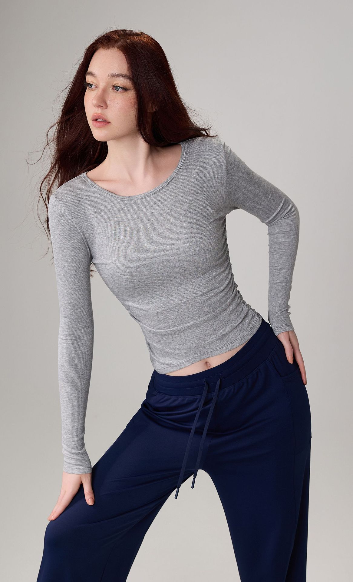 가을 알몸 요가 옷 플리츠 슬림 핏 크루 넥 스포츠 탑 여성용 손가락 커버 필라테스 러닝 피트니스 긴 소매스토어 가기