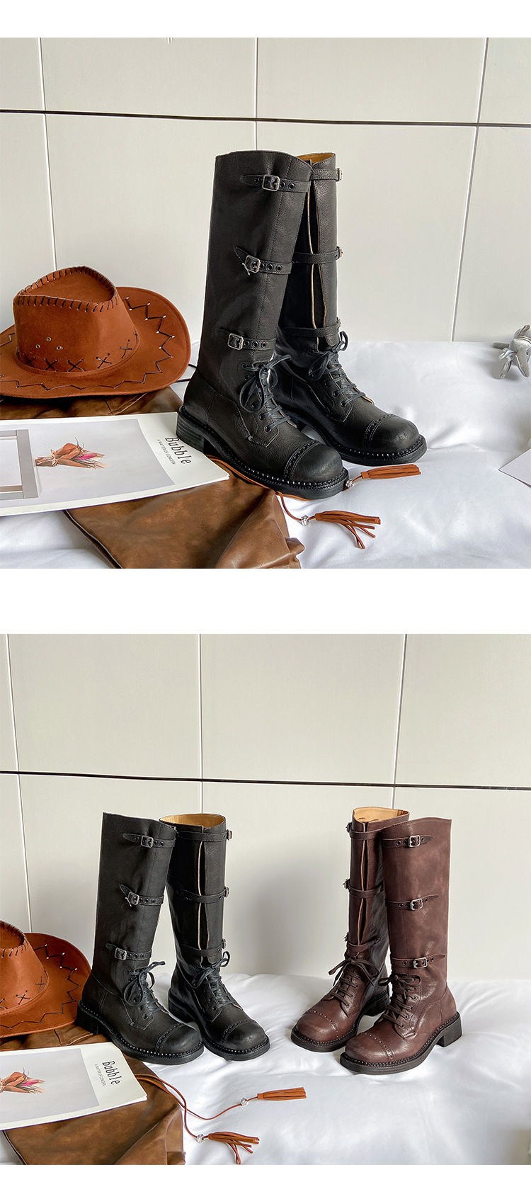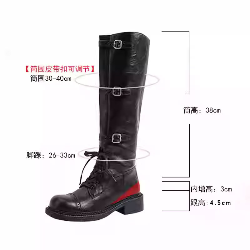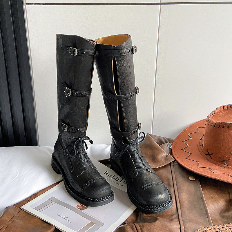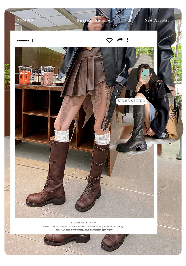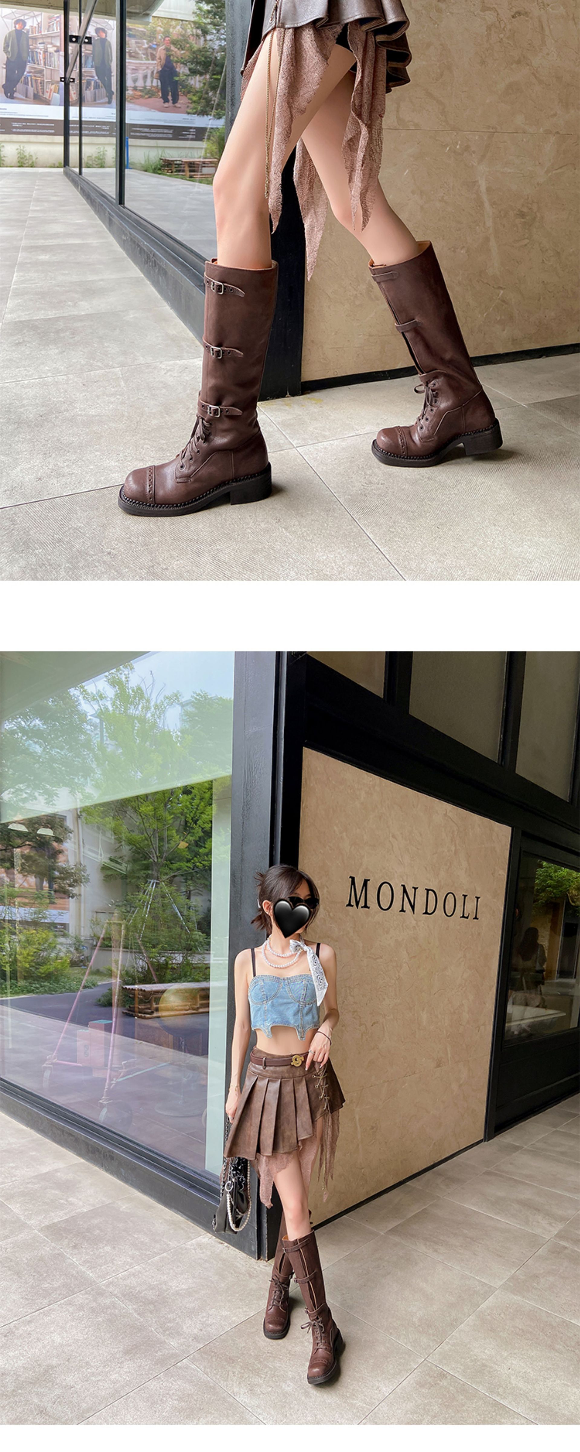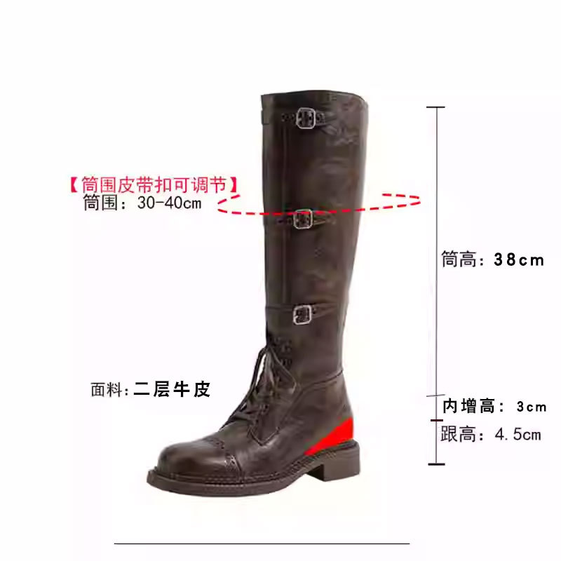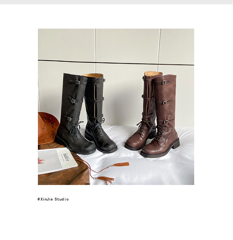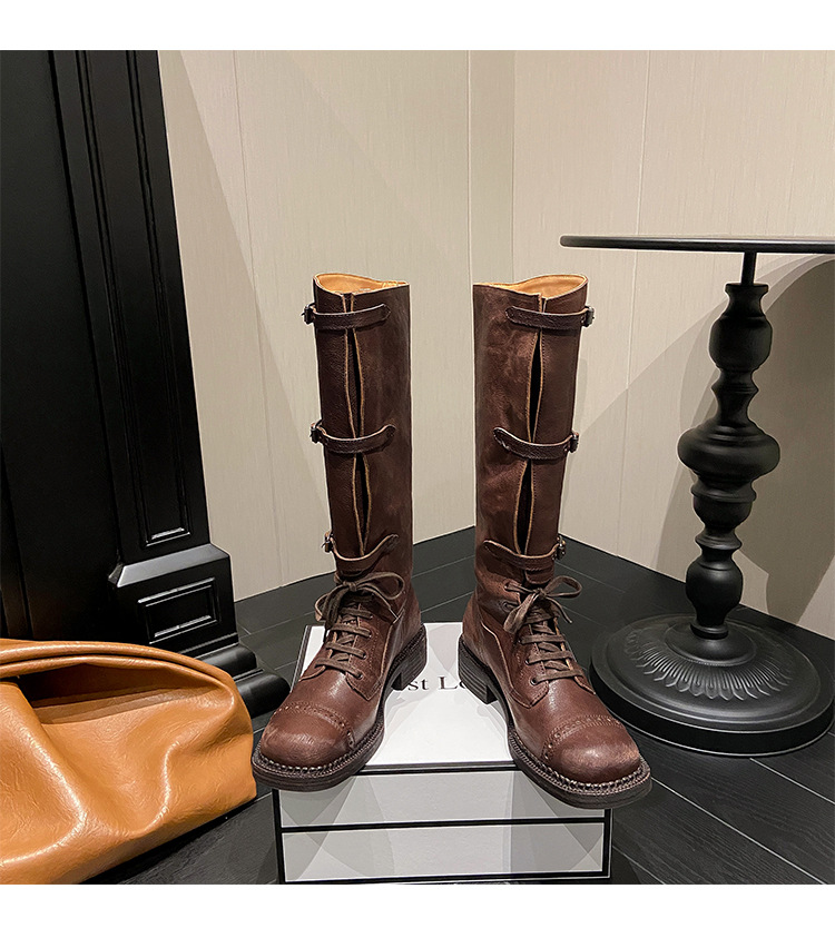 miu美拉德棕色高筒长筒靴女绑带真皮复古做旧辣妹西部牛仔骑士靴
