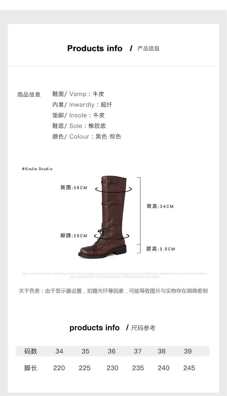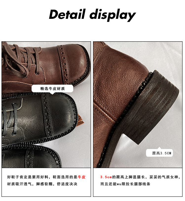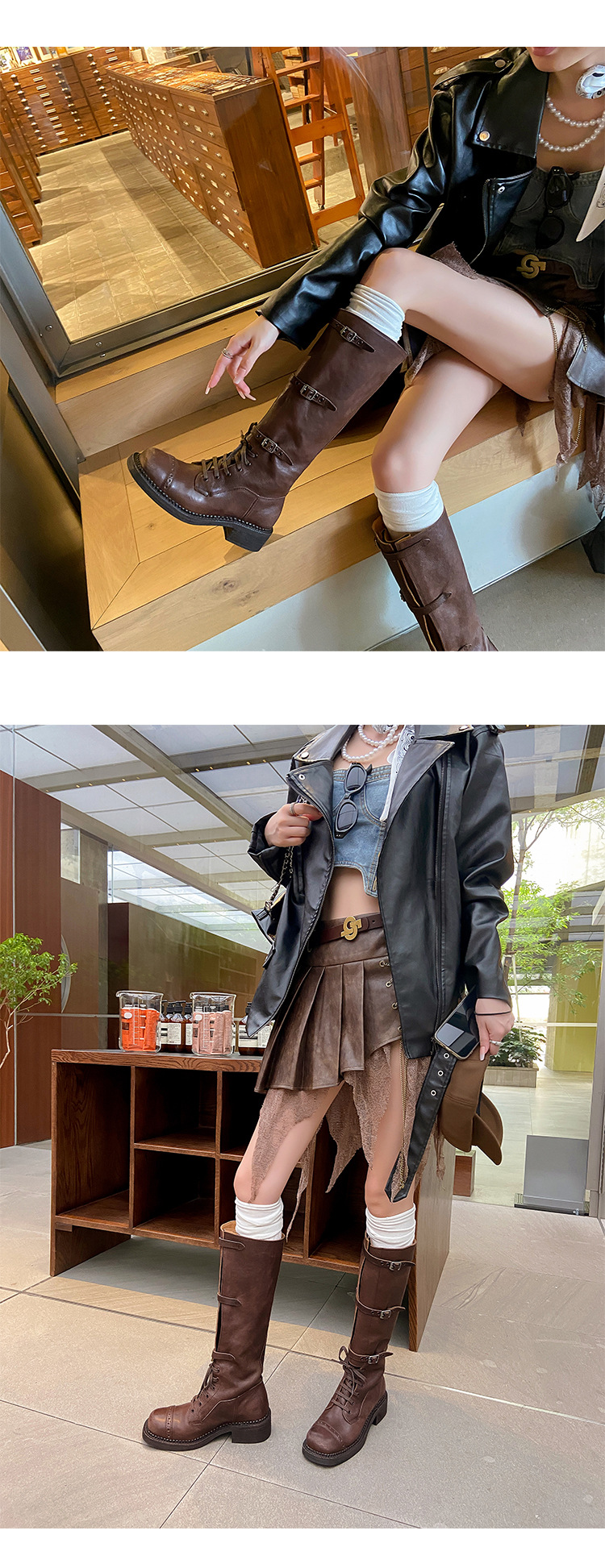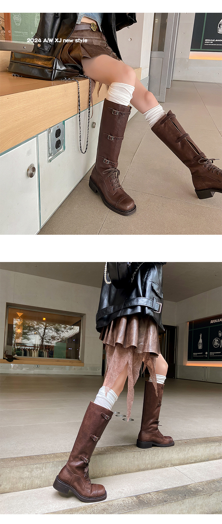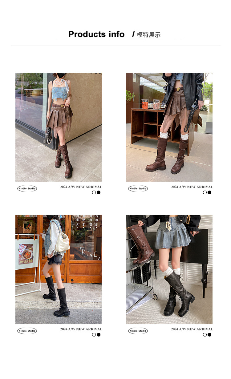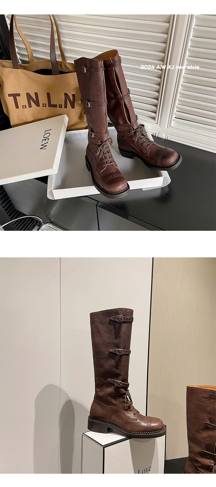 miu美拉德棕色高筒长筒靴女绑带真皮复古做旧辣妹西部牛仔骑士靴