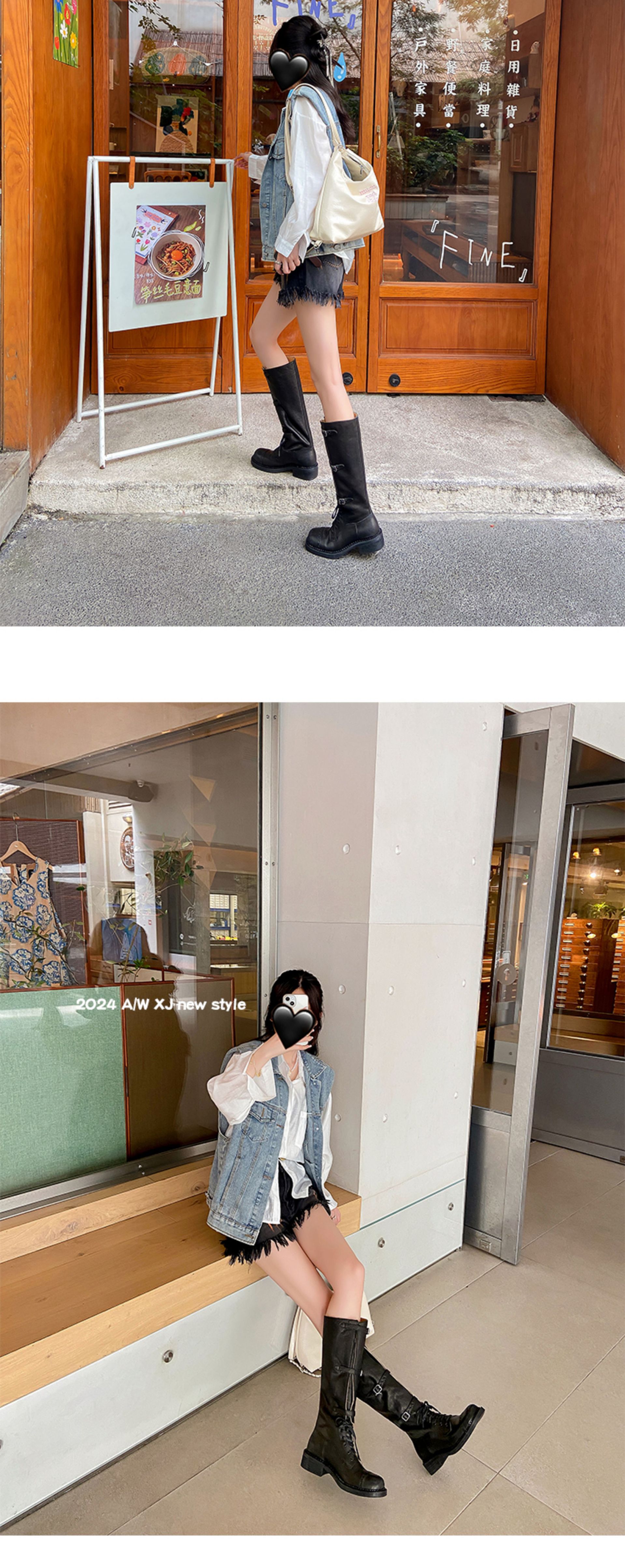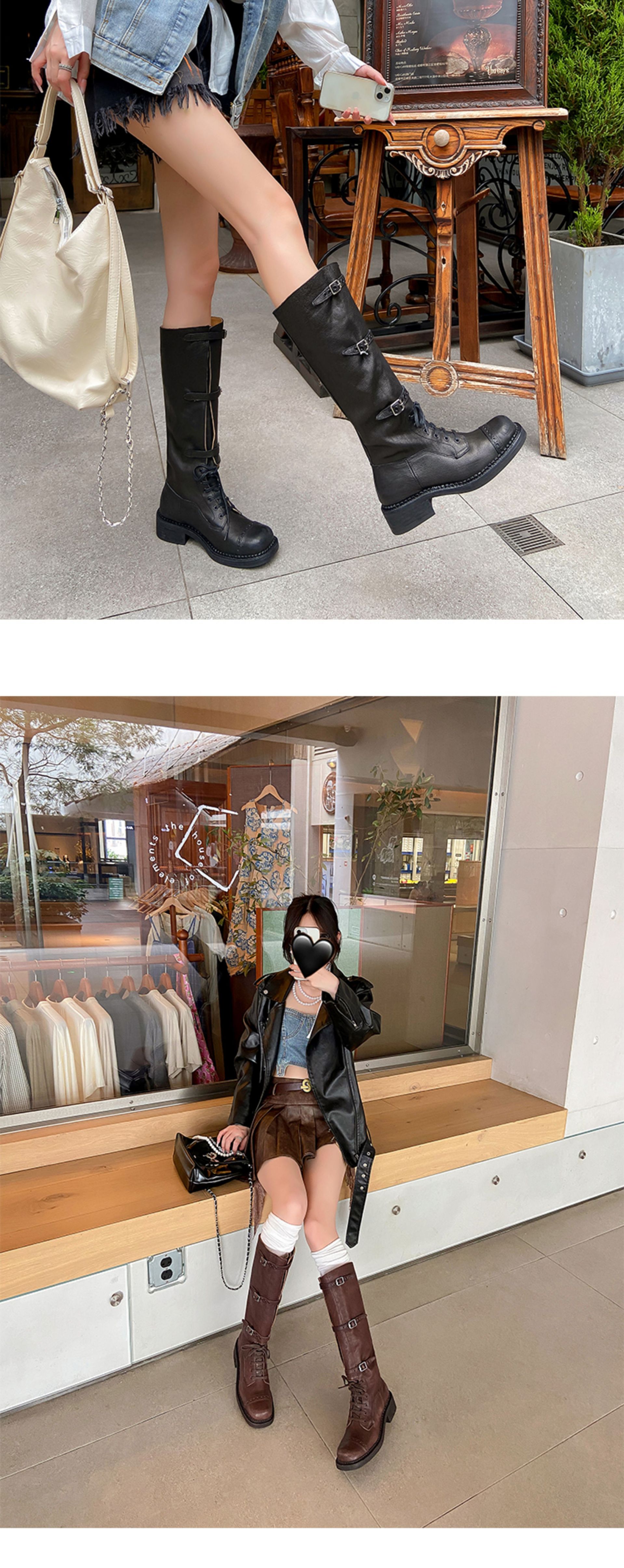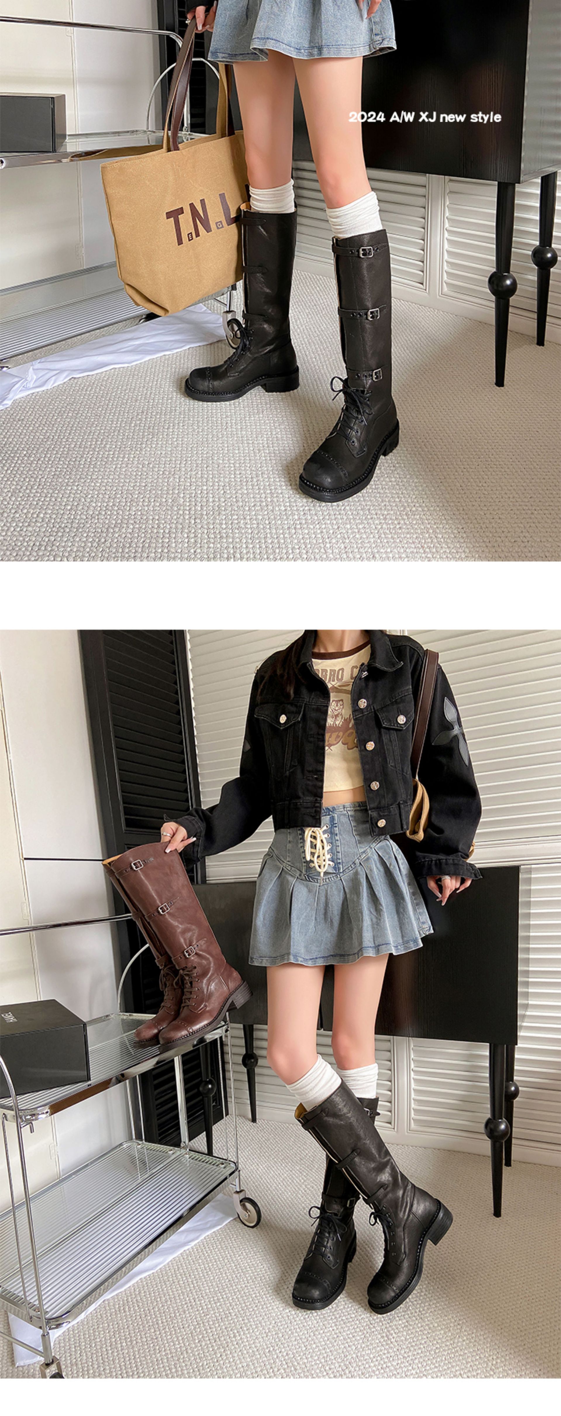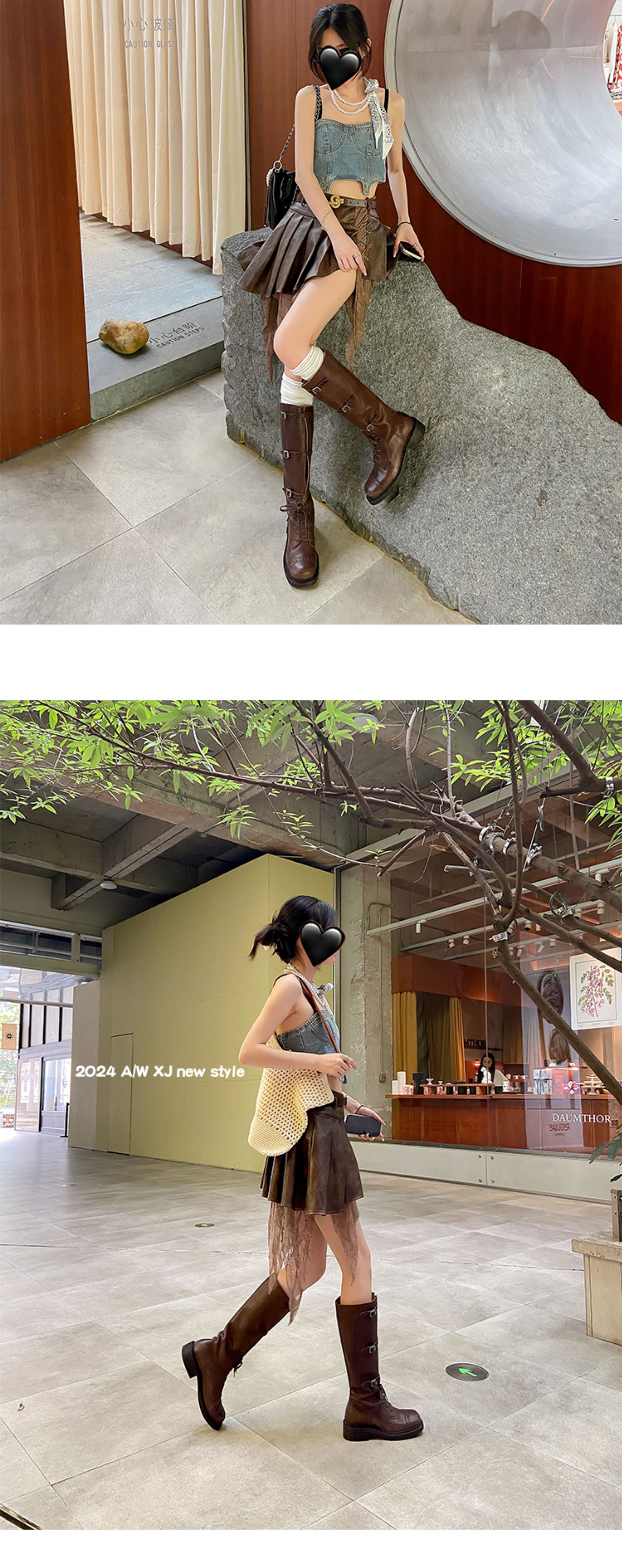Miu Maillard 다크 브라운 하이 부츠 여성용 스트랩 가죽 레트로 앤티크 스파이스 걸스 웨스턴 데님 나이트 부츠스토어 가기