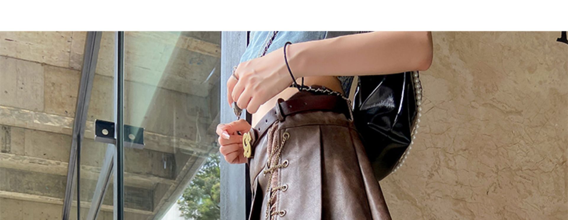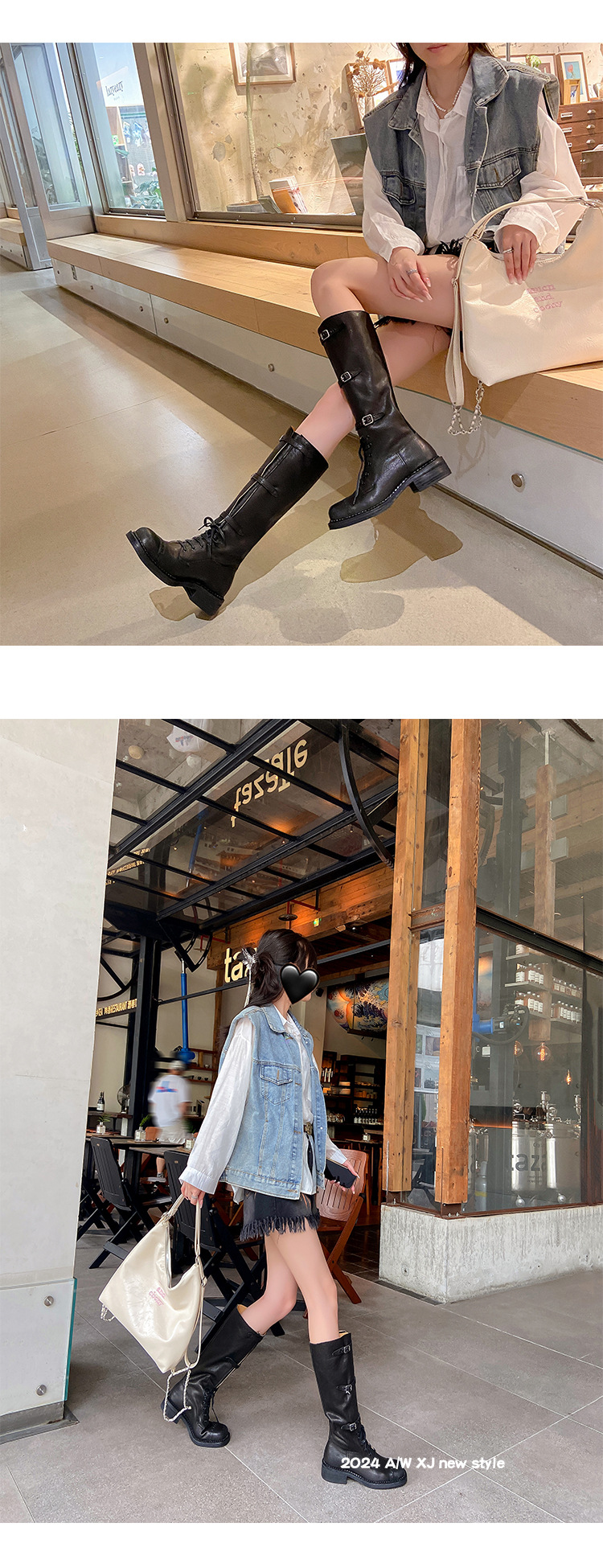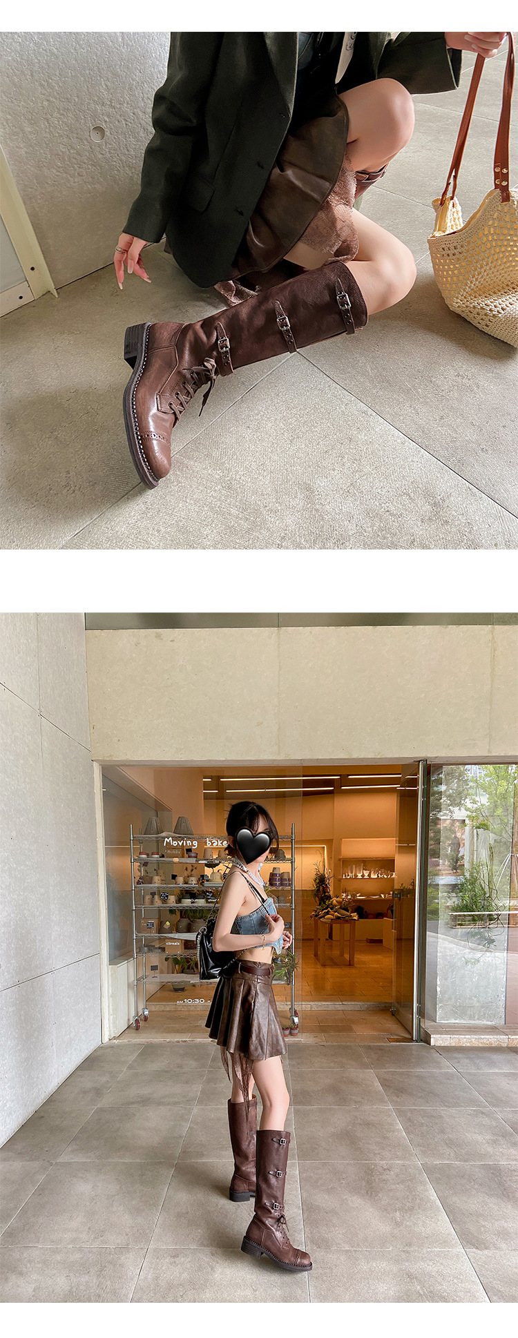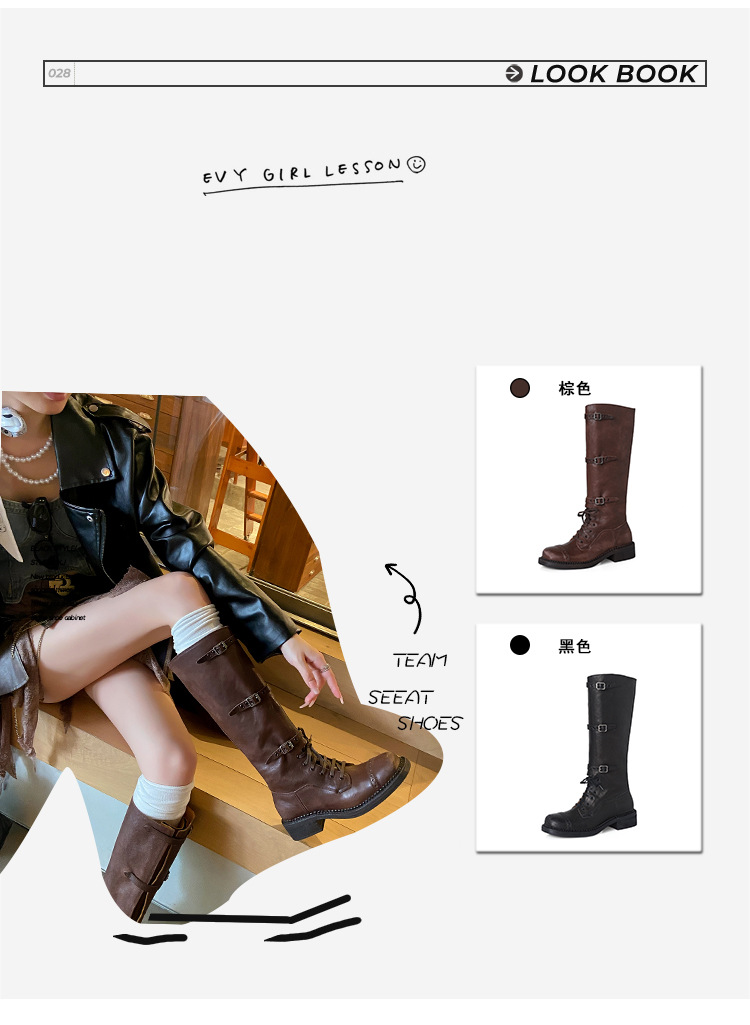 Miu Maillard 다크 브라운 하이 부츠 여성용 스트랩 가죽 레트로 앤티크 스파이스 걸스 웨스턴 데님 나이트 부츠스토어 가기