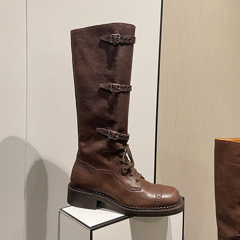 Miu Maillard 다크 브라운 하이 부츠 여성용 스트랩 가죽 레트로 앤티크 스파이스 걸스 웨스턴 데님 나이트 부츠
