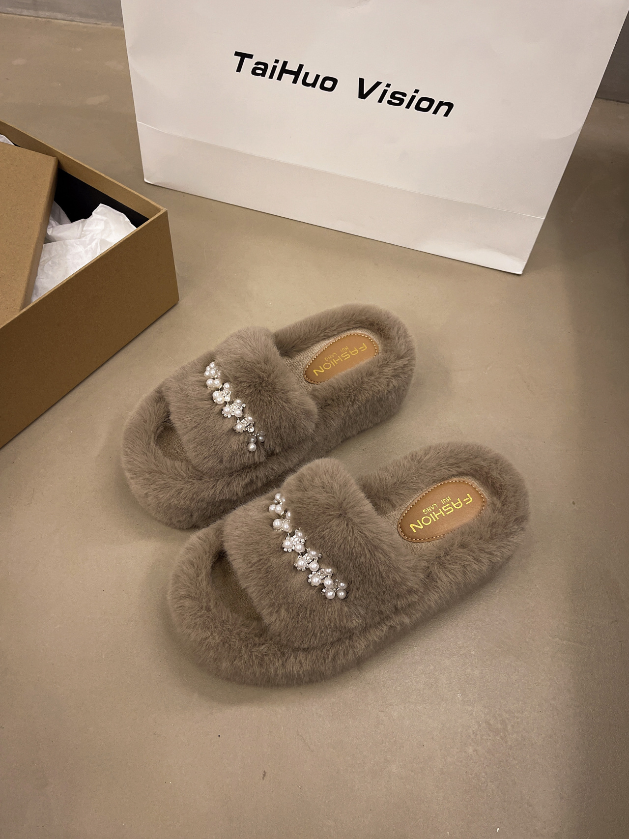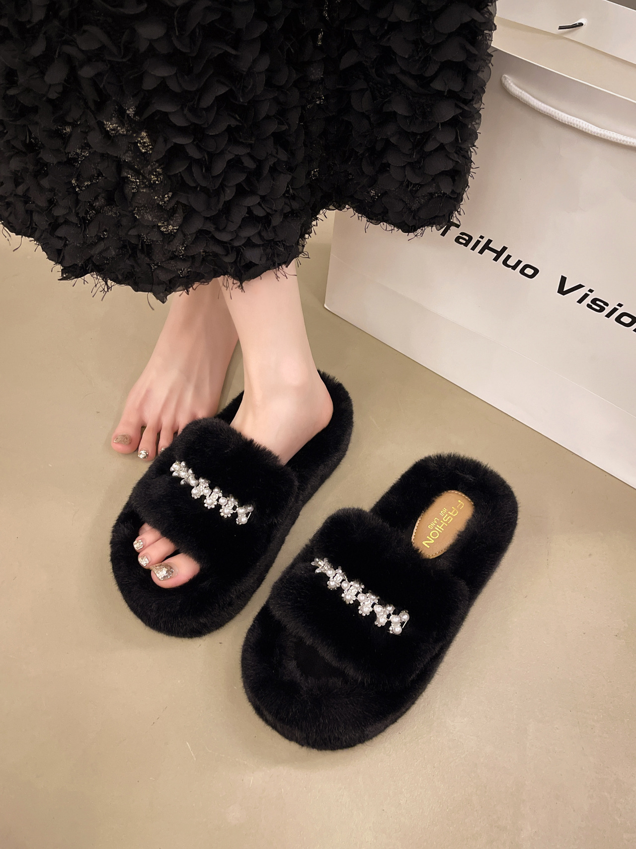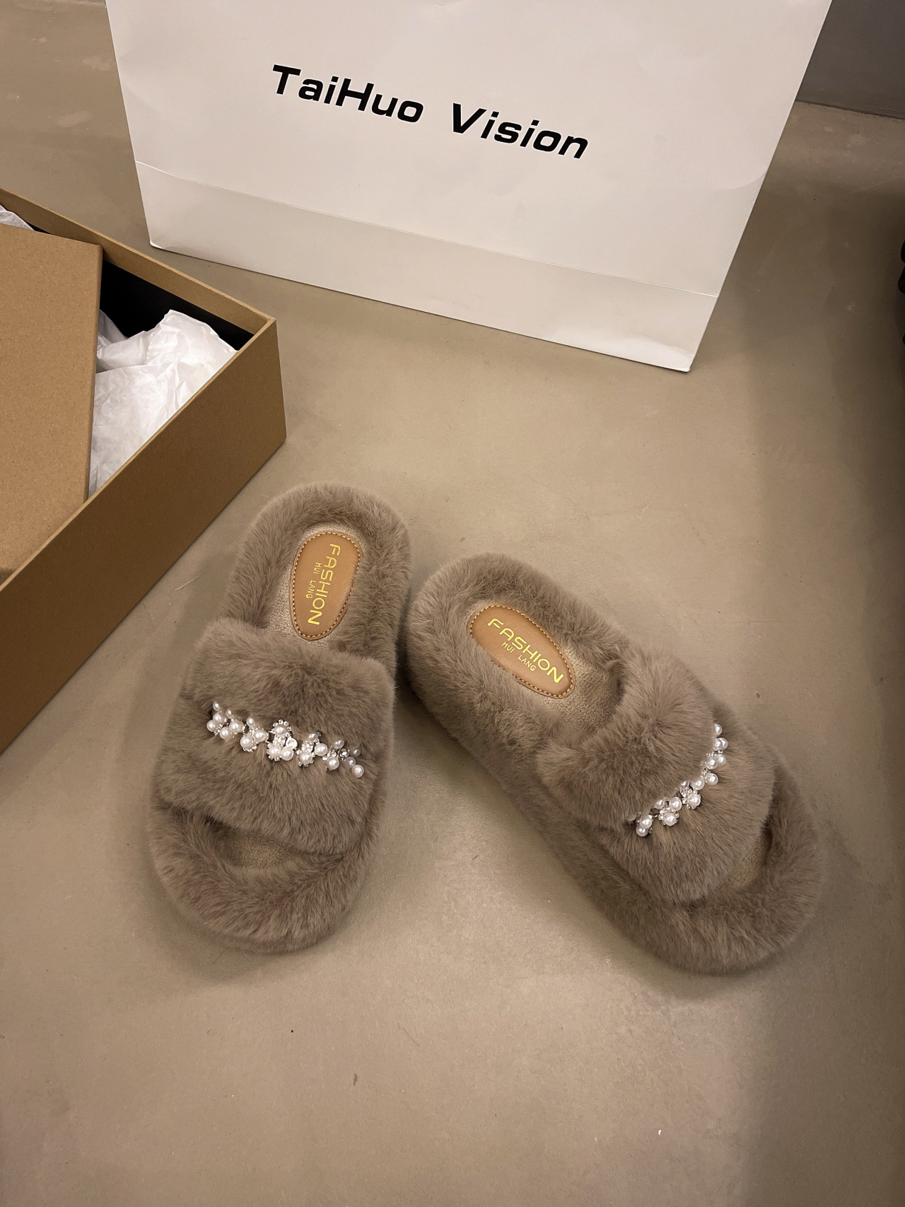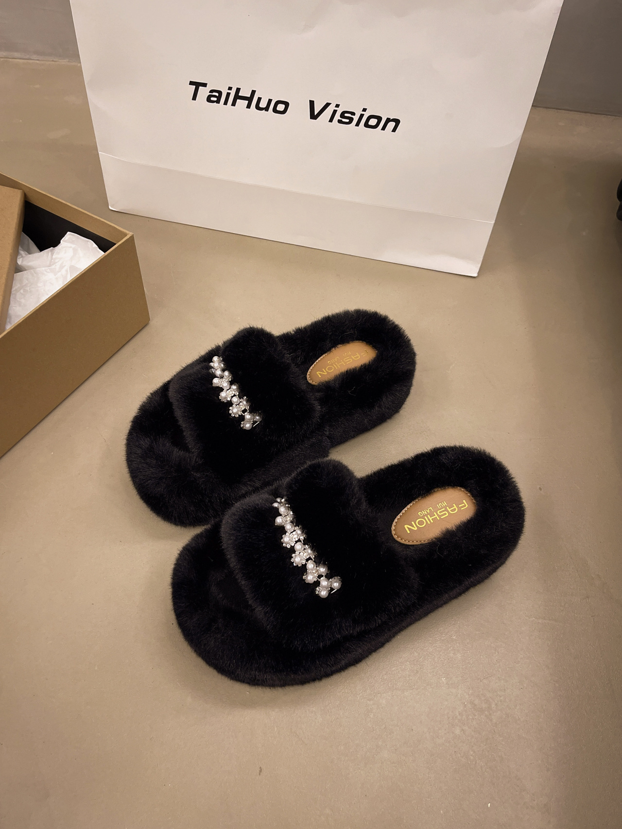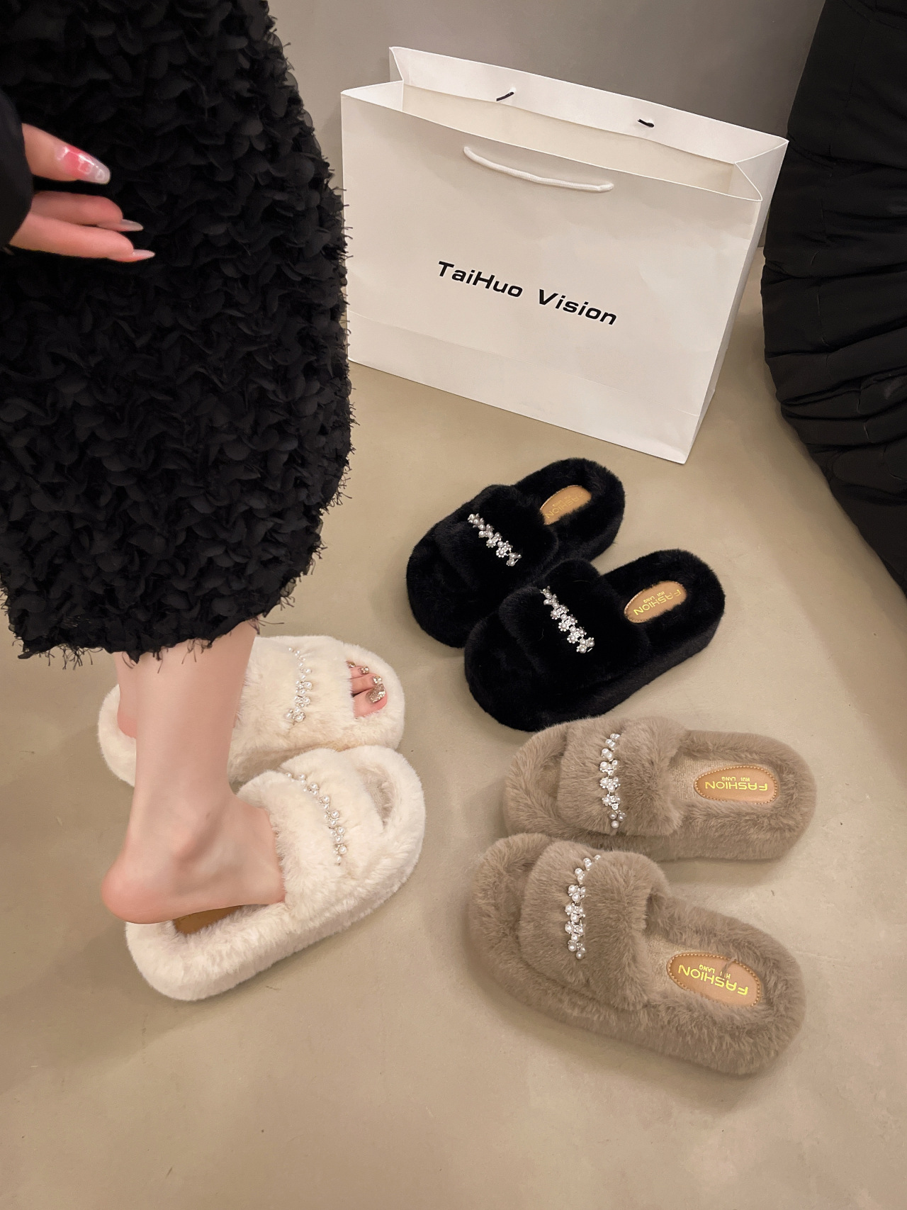 인터넷 레드 펄 한 단어 마오 마오 슬리퍼 여성 외부 착용 2024 새로운 가을과 겨울 요정 스타일 두꺼운 바닥 봉제 면 슬리퍼스토어 가기