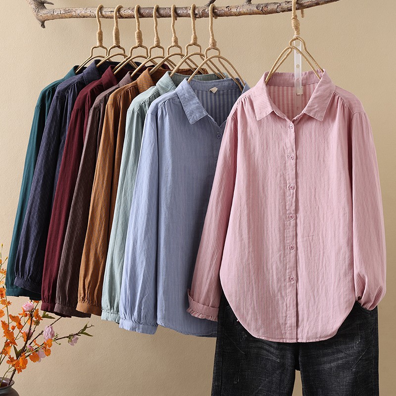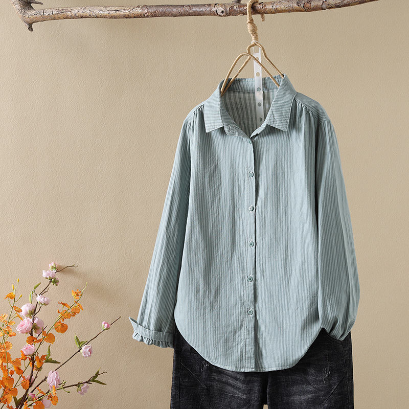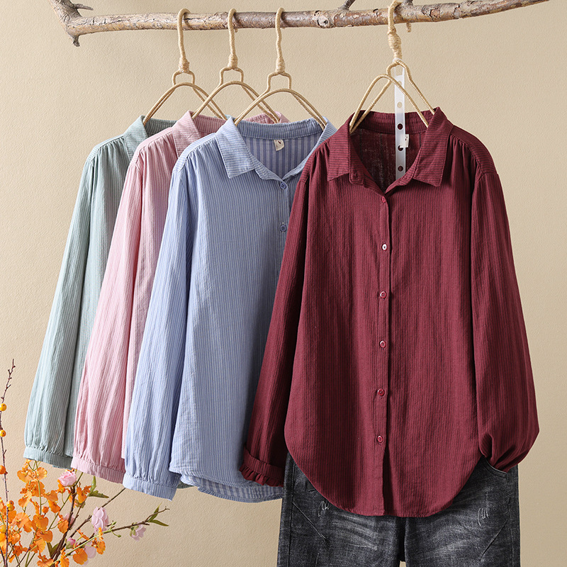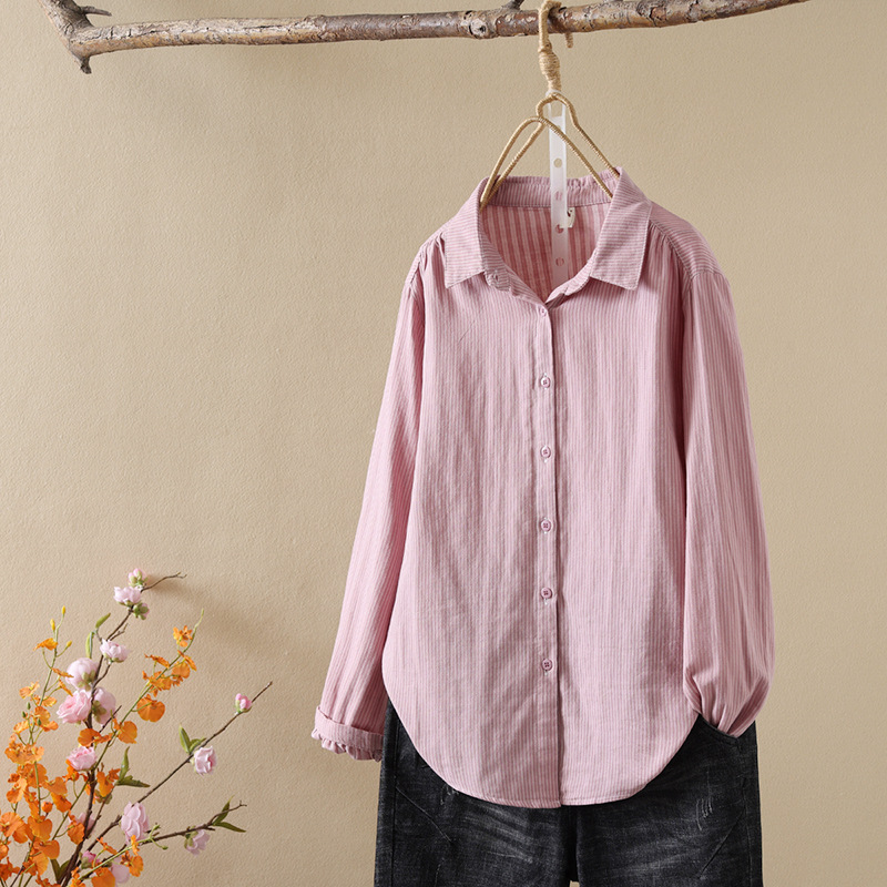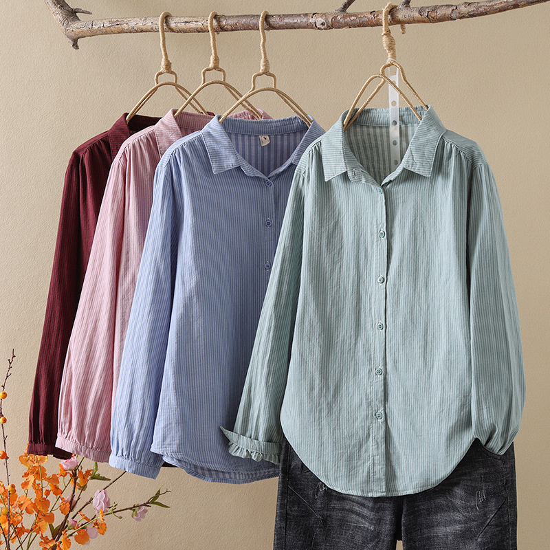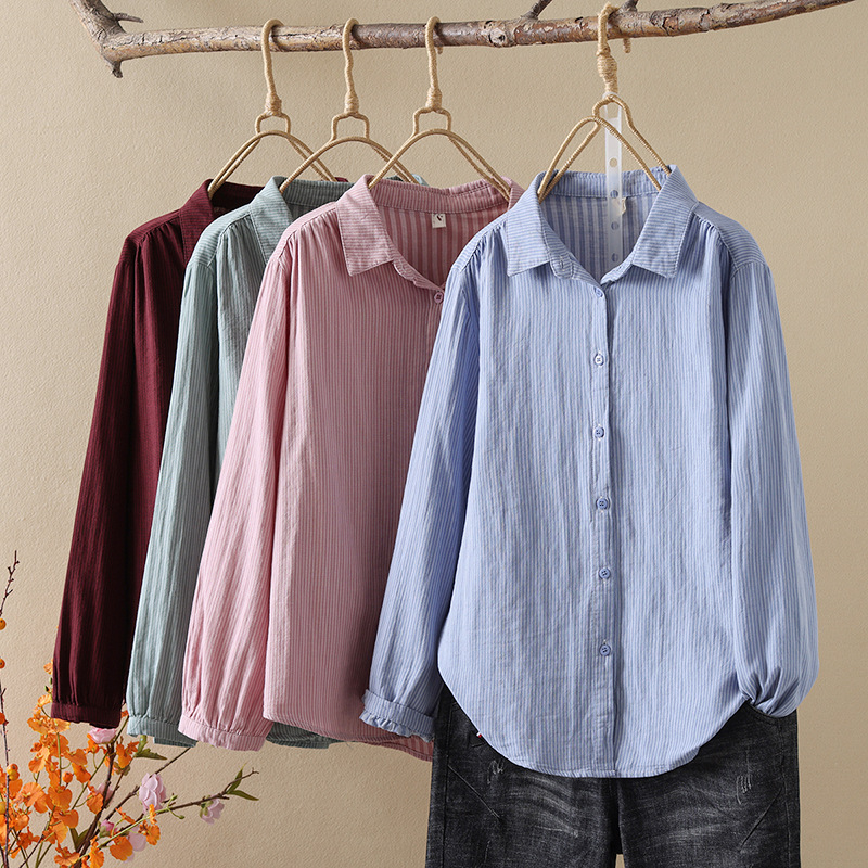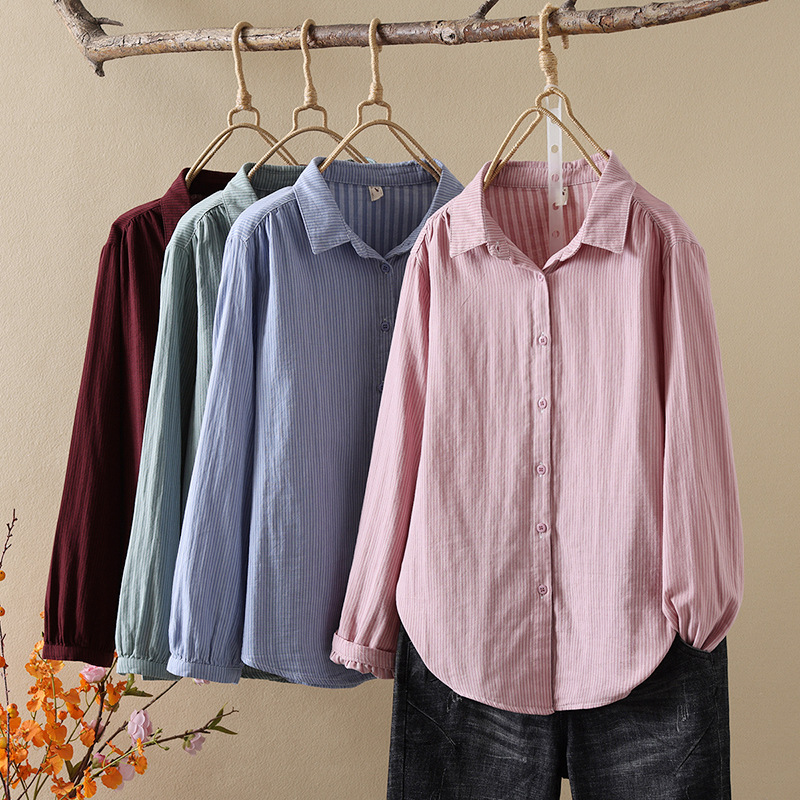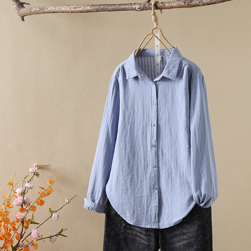 한국식 신형 면 셔츠 여성용 긴팔 줄무늬 셔츠 루즈 여성용 더블 레이어 코튼 원사 긴팔 캐주얼 탑스토어 가기