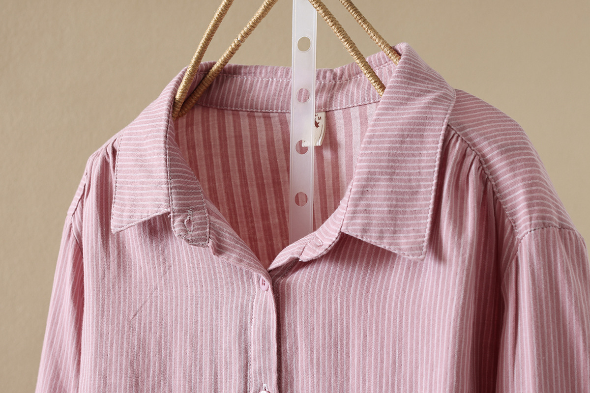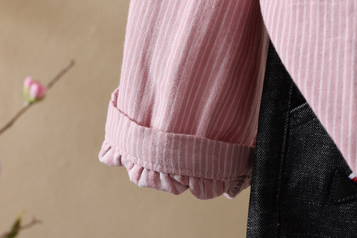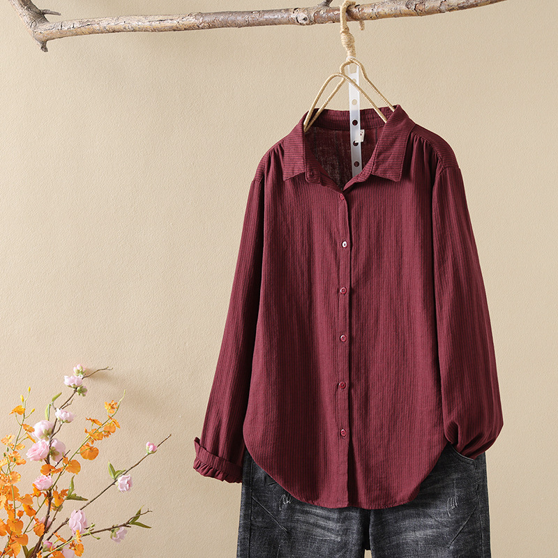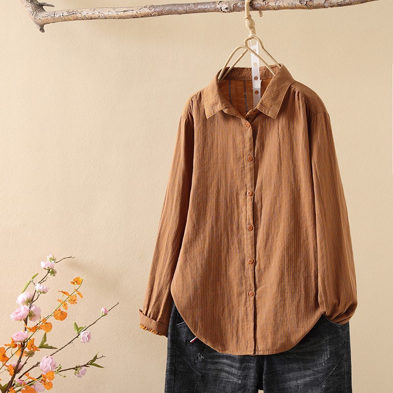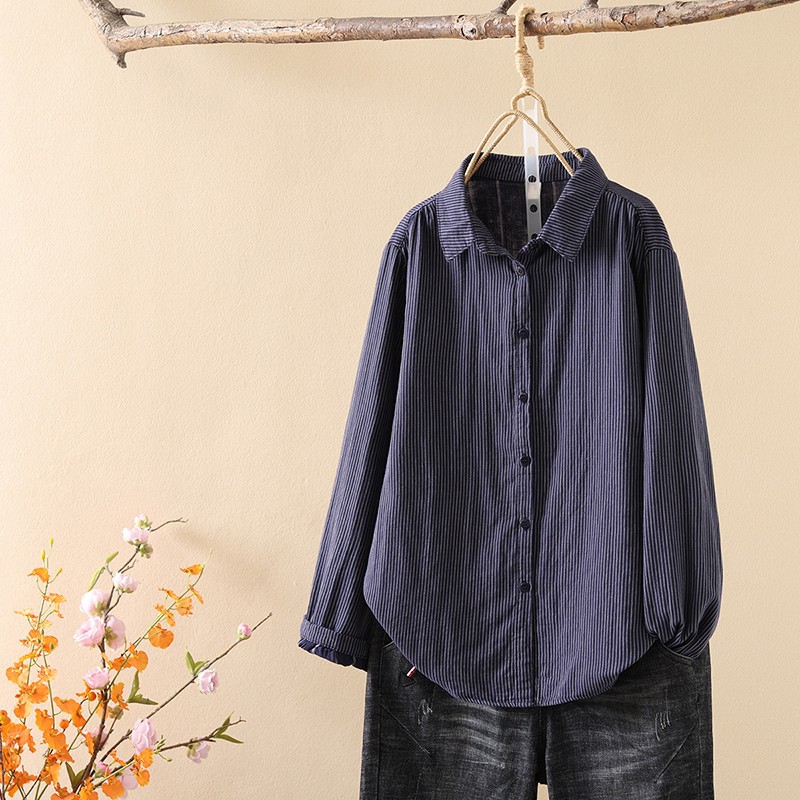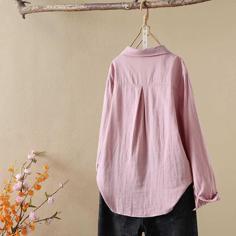 한국식 신형 면 셔츠 여성용 긴팔 줄무늬 셔츠 루즈 여성용 더블 레이어 코튼 원사 긴팔 캐주얼 탑스토어 가기