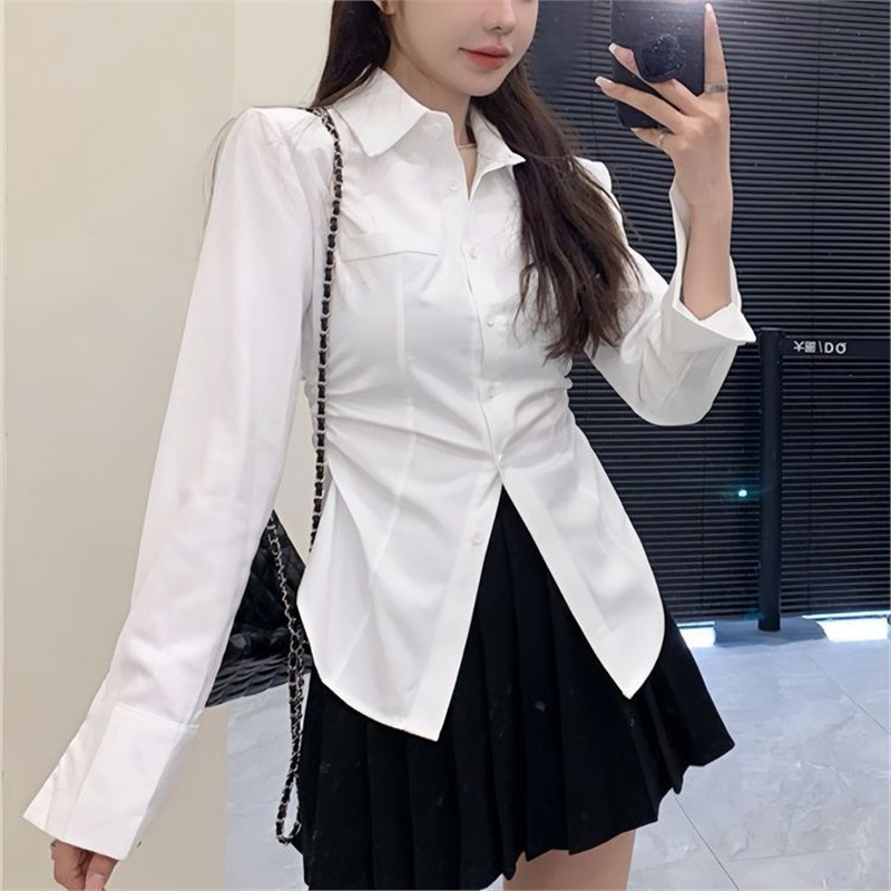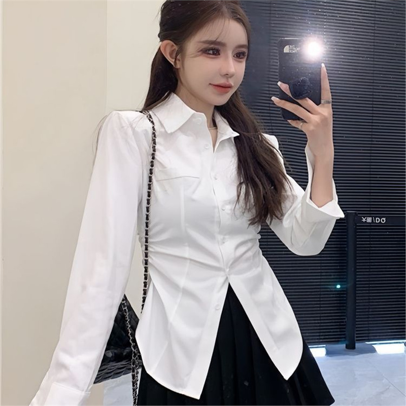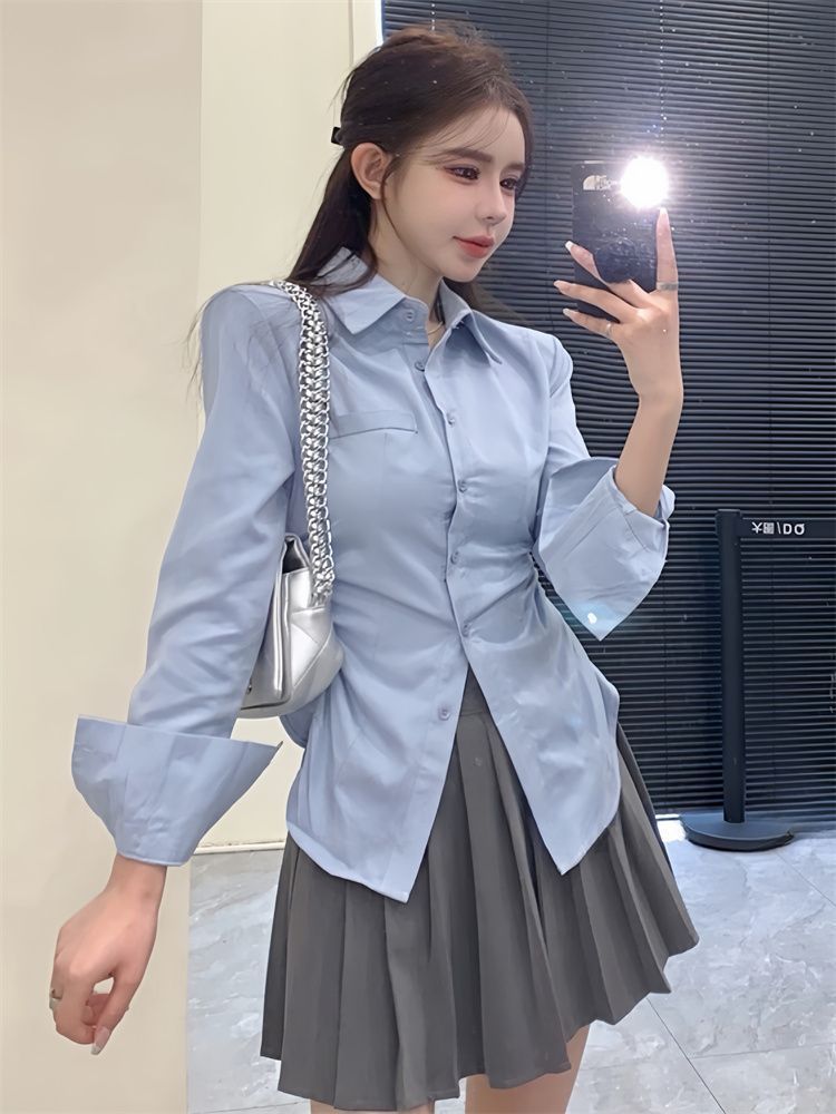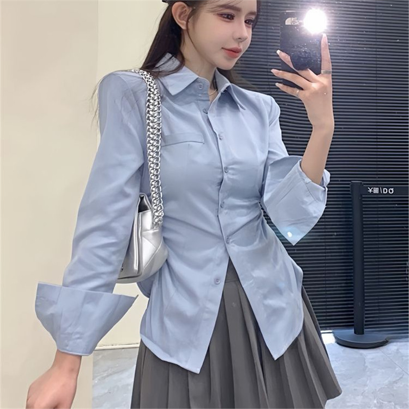 대학 스타일 블루 긴 소매 셔츠 여성의 2024 새로운 가을 디자인 센스 틈새 타이트 허리 슬리밍 세련된 탑스토어 가기