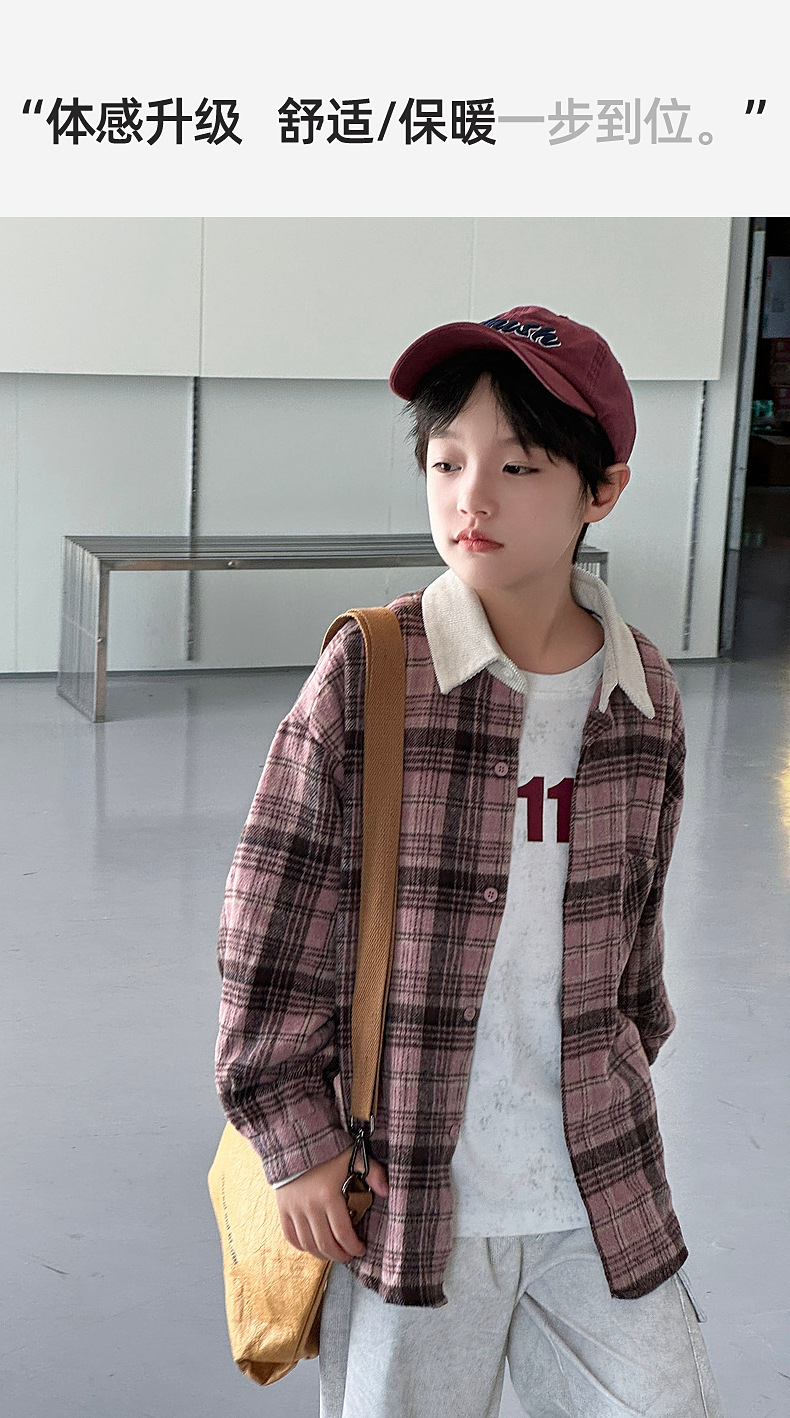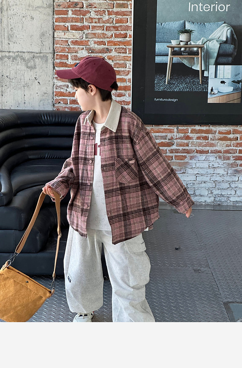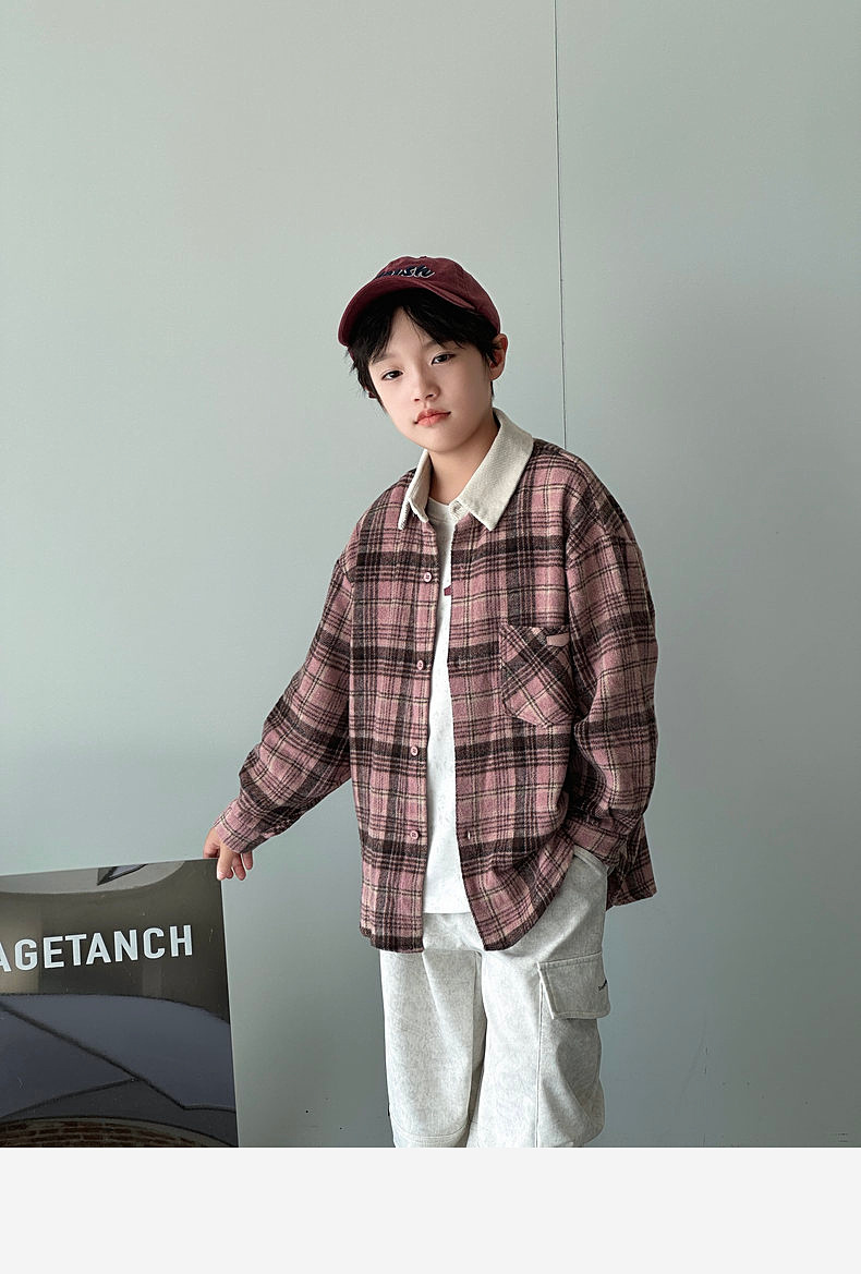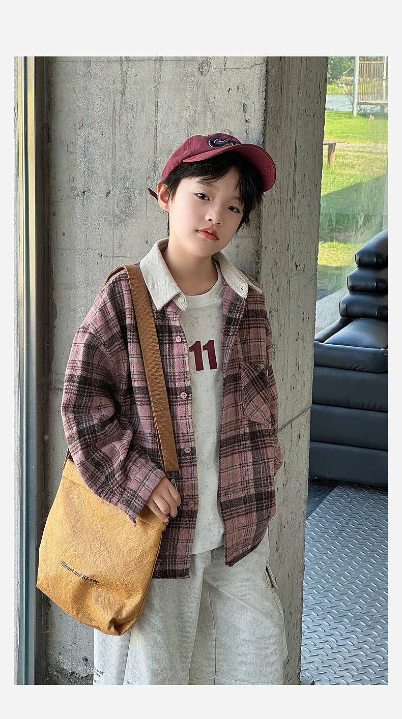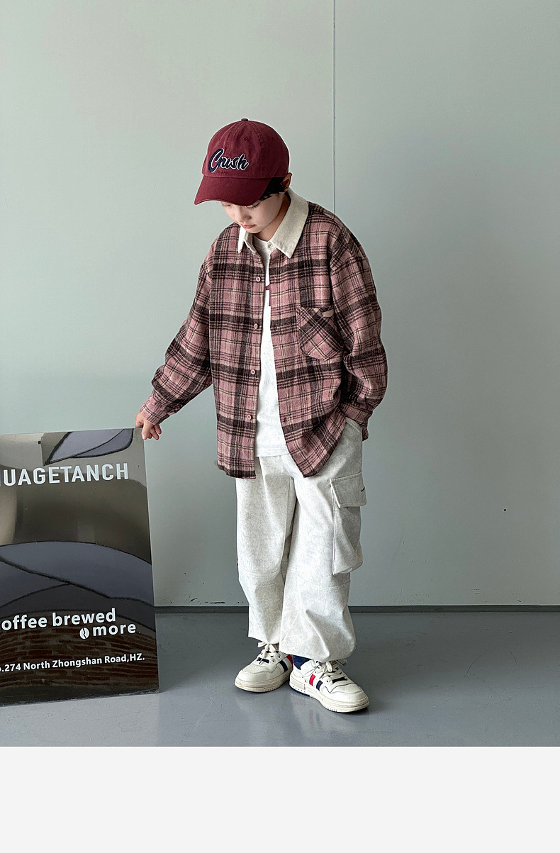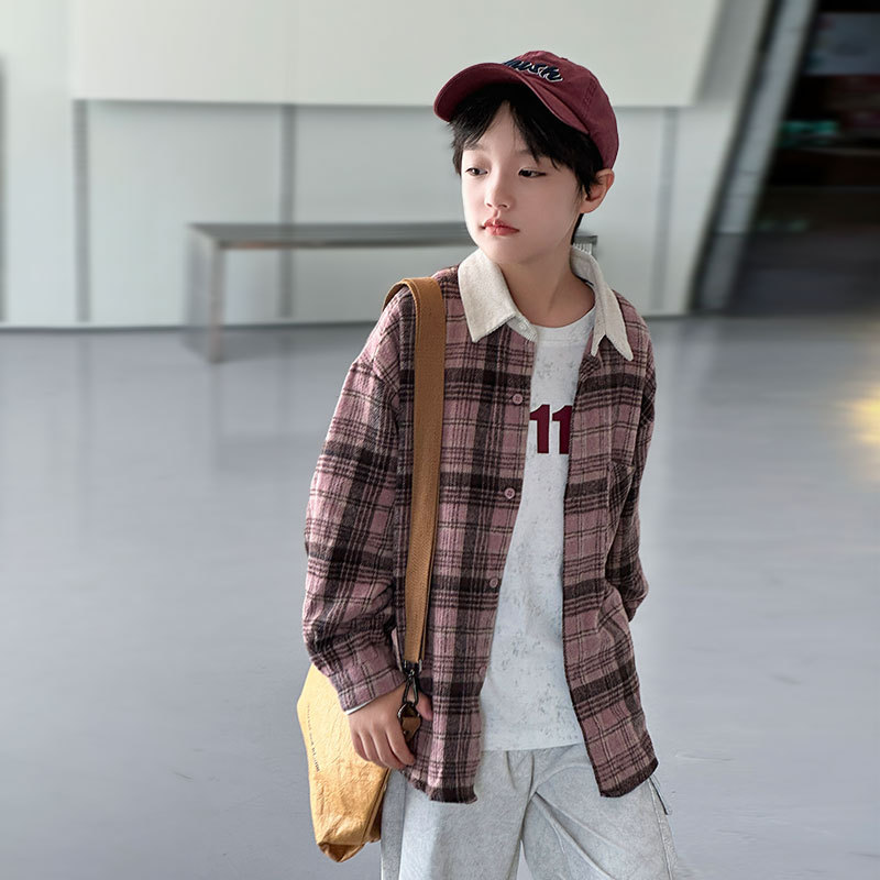 2024 새로운 따뜻한 양모 소년 격자 무늬 셔츠 재킷 판다 Yuanyuan 어린이 가을 모직 셔츠스토어 가기