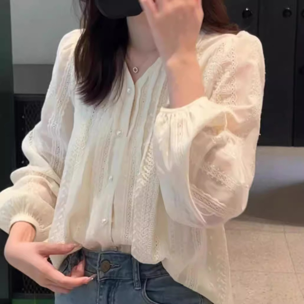 2026년 신상 자수 랜턴 소매 프렌치 스타일 긴팔 셔츠 여성 봄옷
