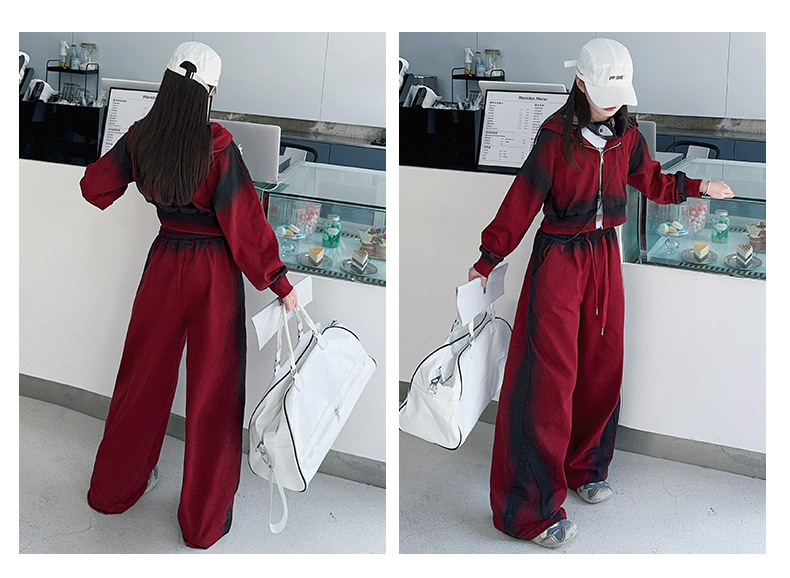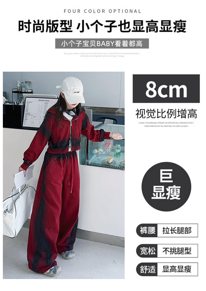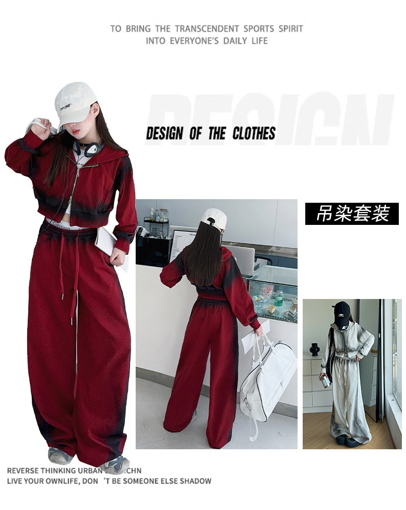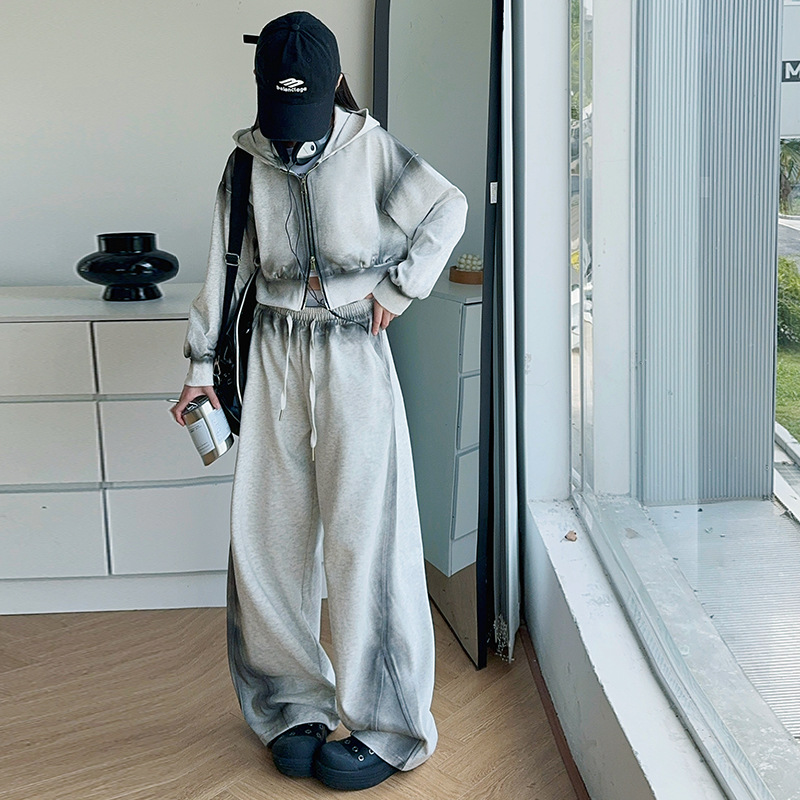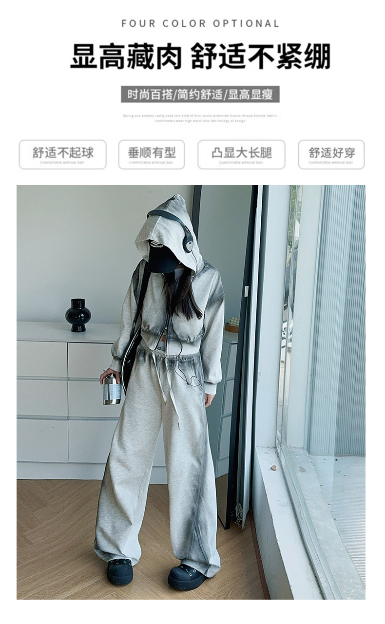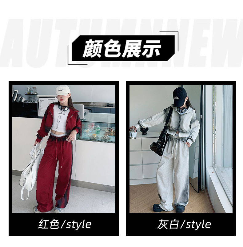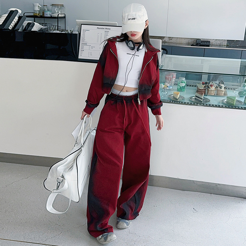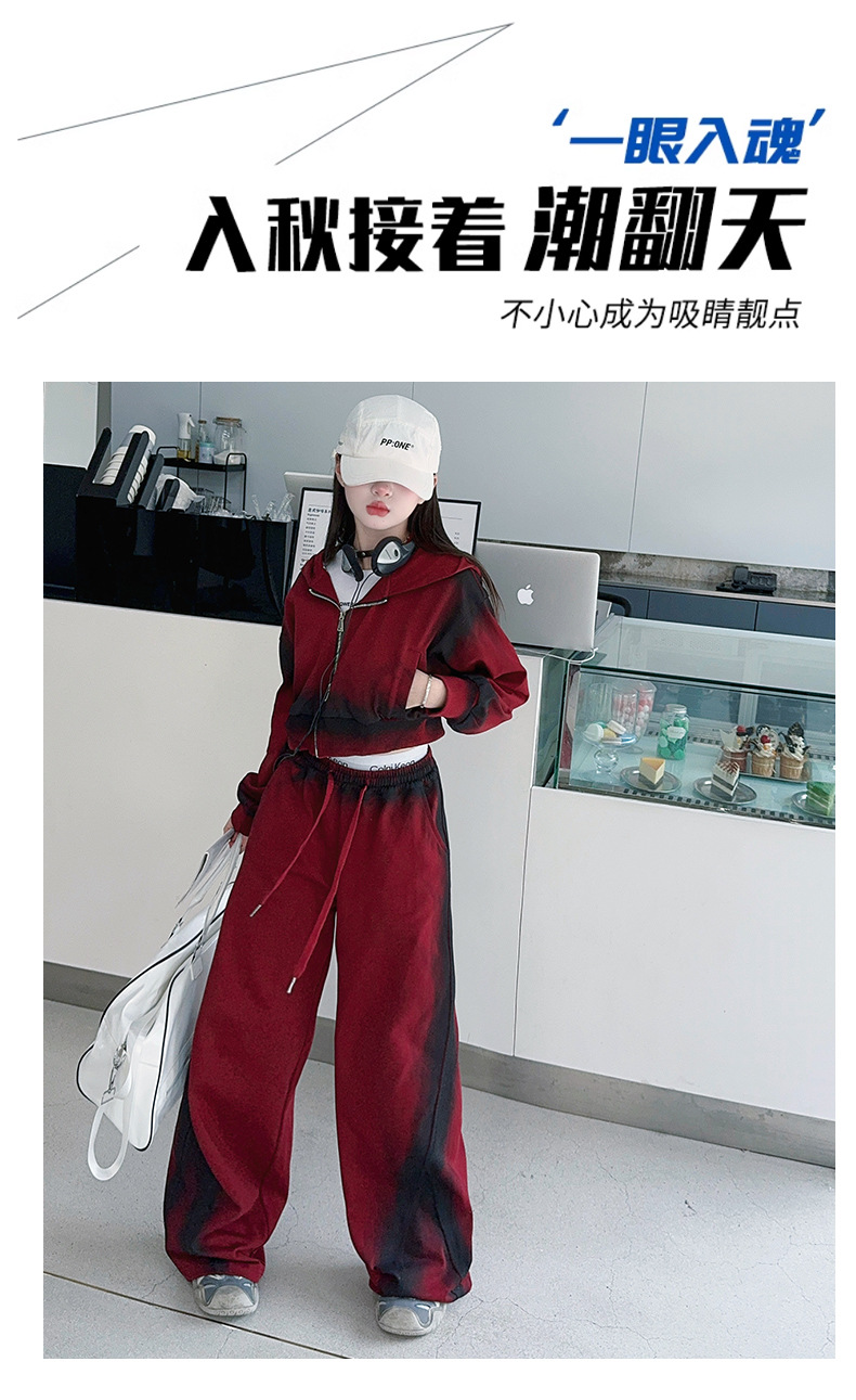 소녀 가을 세트 2024 새로운 패션 소녀 한국 스타일 어린이 매달린 염료 후드 땀 넓은 다리 바지 세트스토어 가기