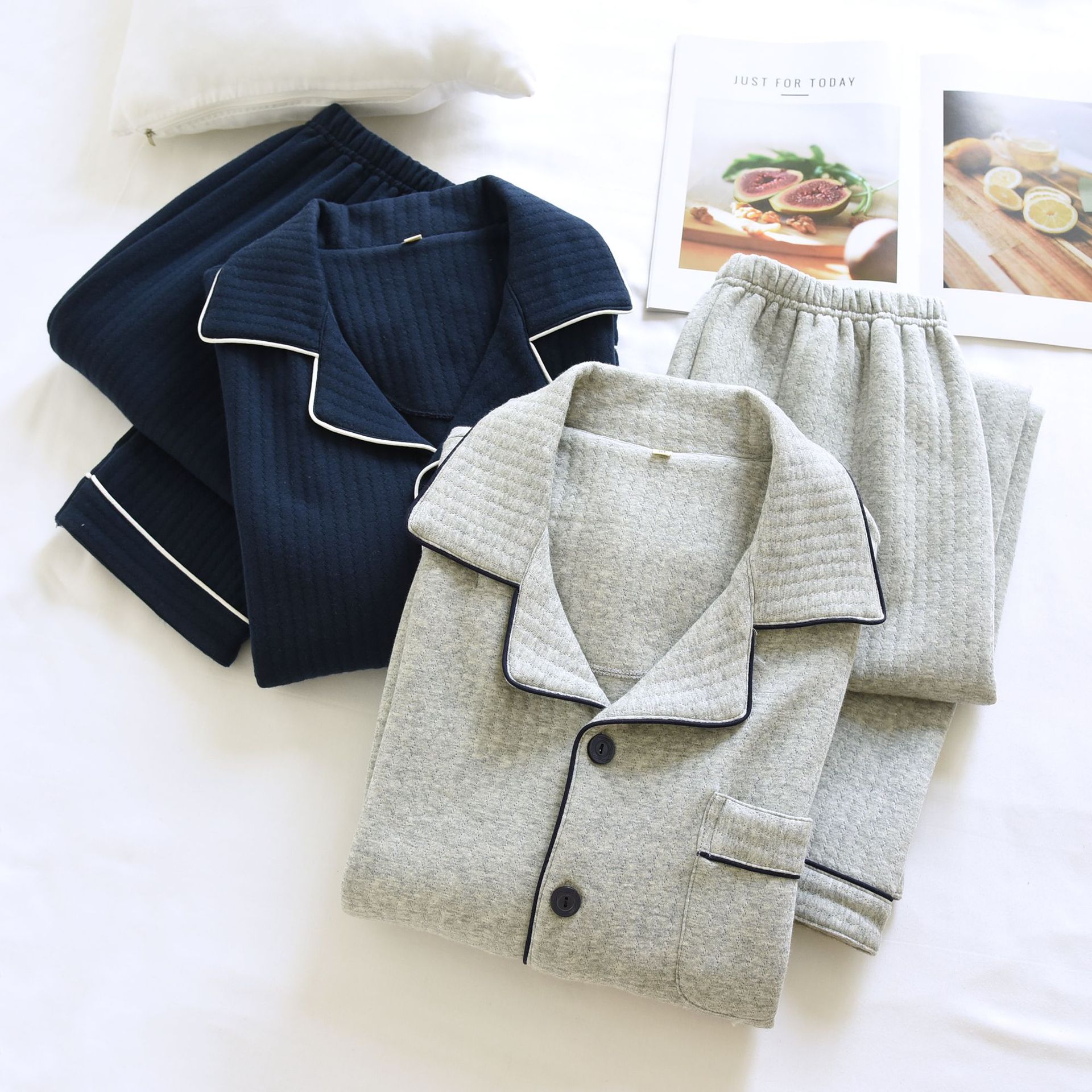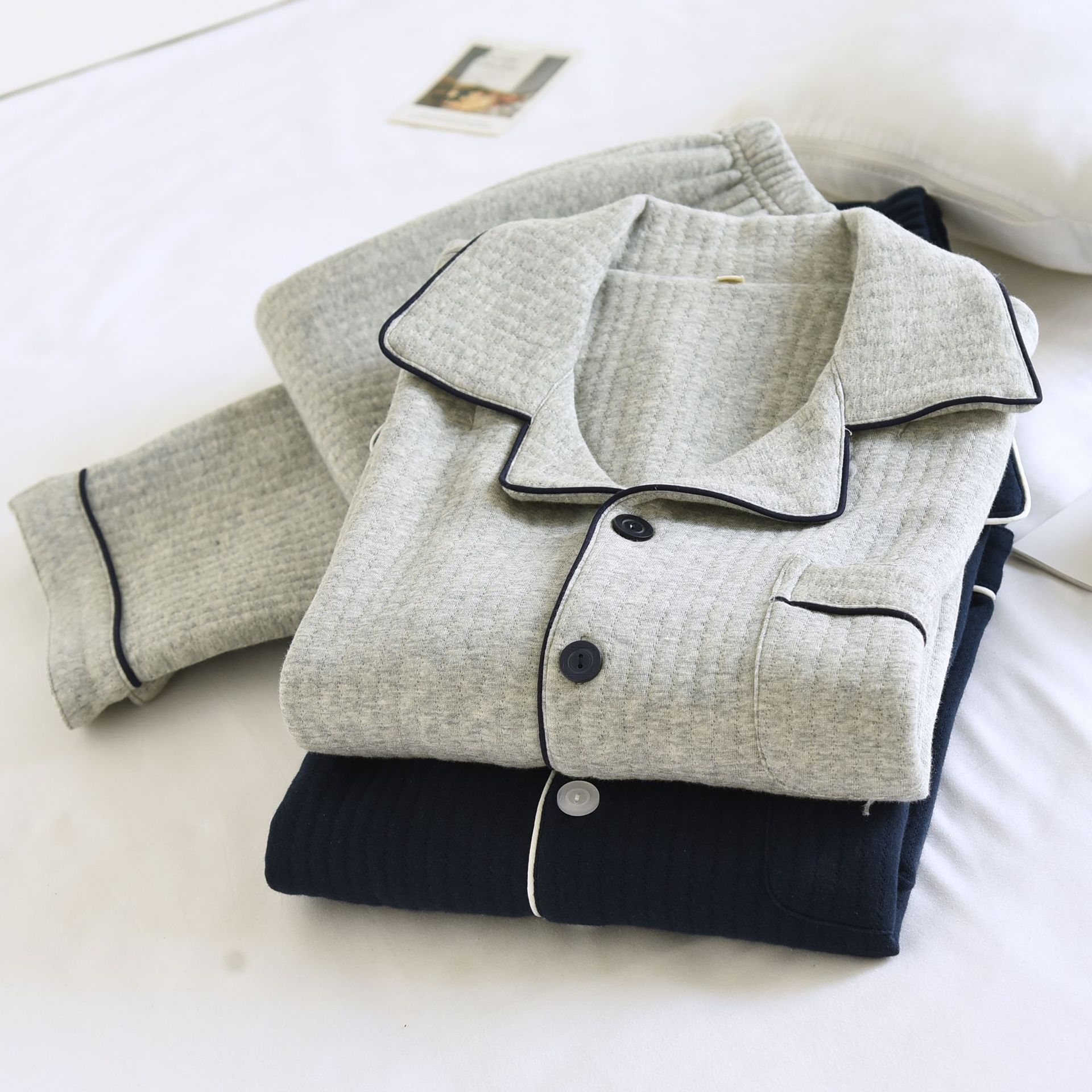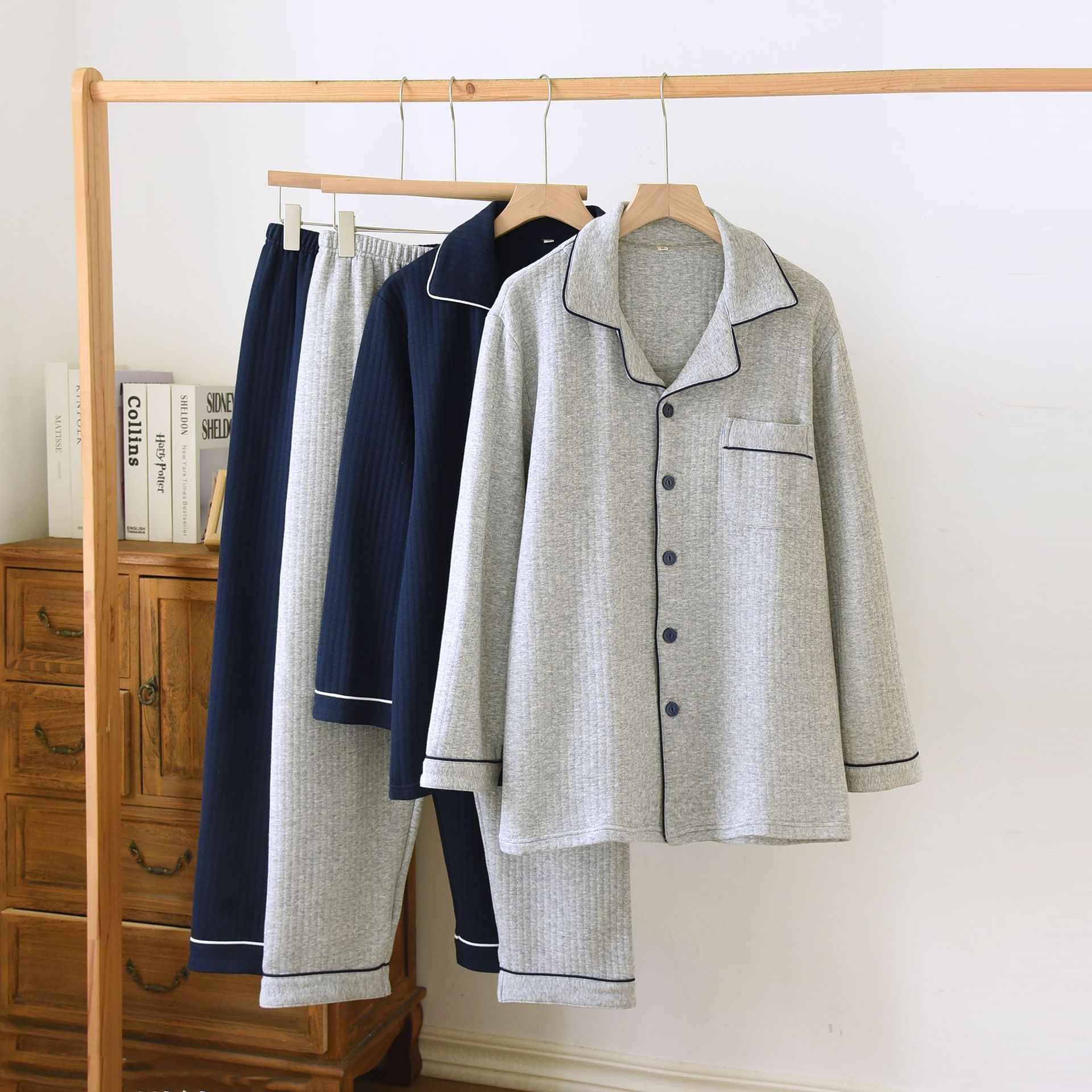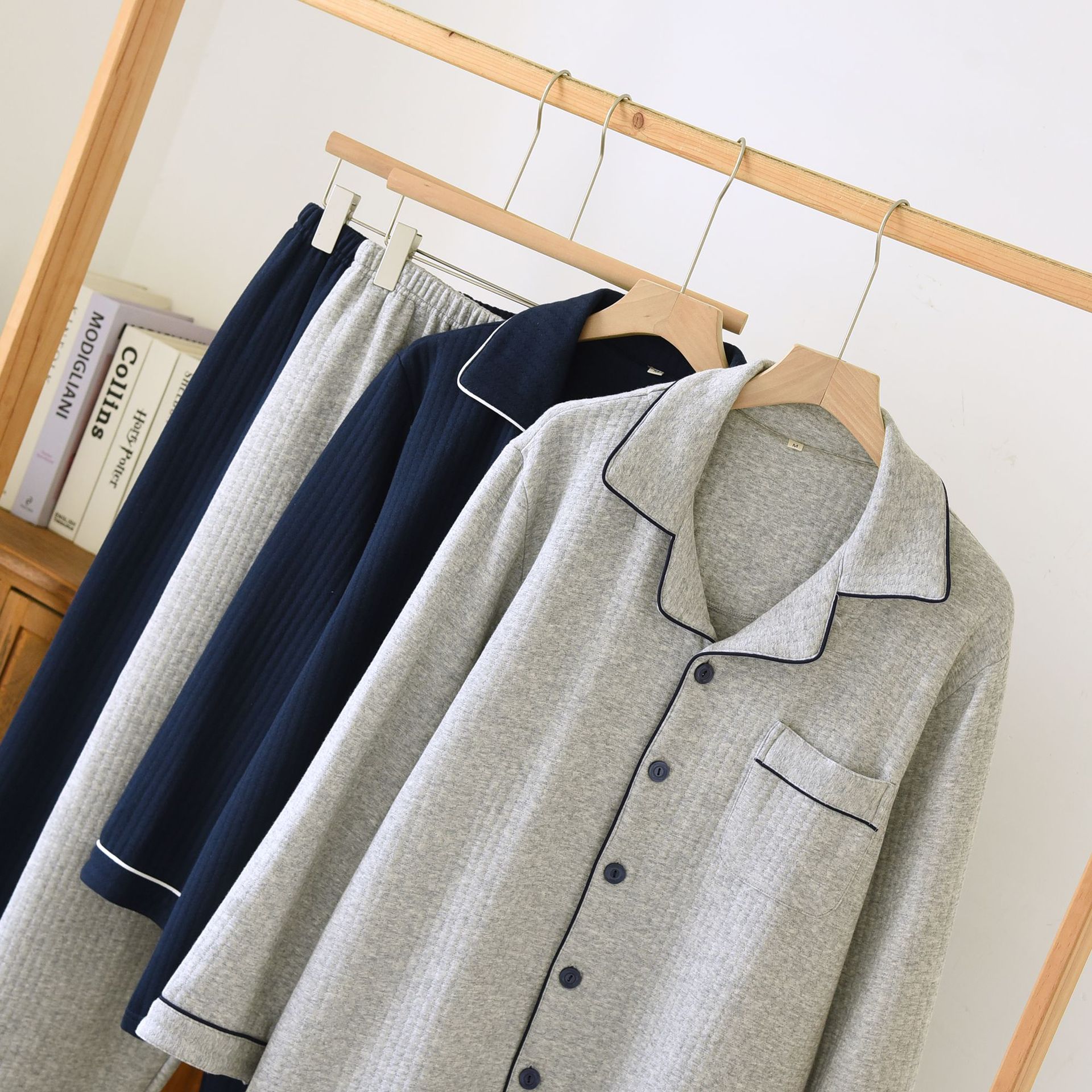 가을과 겨울 면화 남성용 잠옷 다크 스트립 에어 레이어 플러스 사이즈 파자마 긴팔 바지 면화 홈 옷 중간 두께의 단순스토어 가기