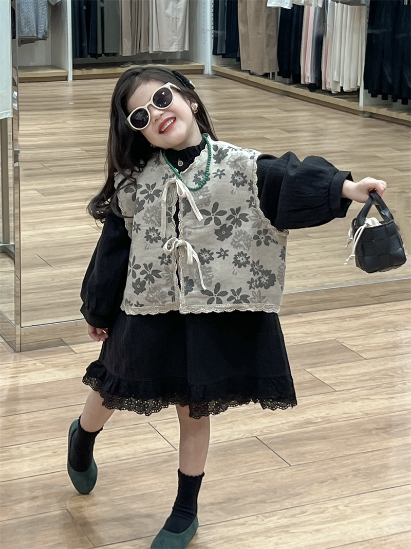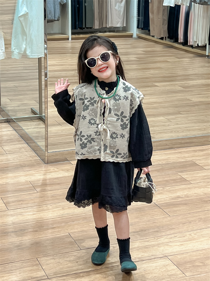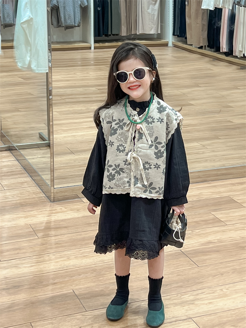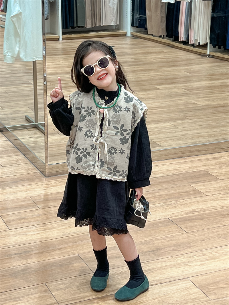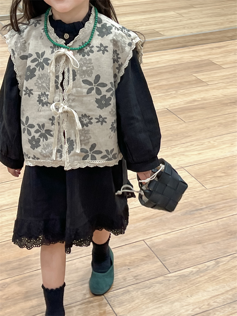 한국 아동복 소녀 모리 플로랄 빈티지 레이스 업 카디건 민소매 레이스 외부 착용 리넨 조끼