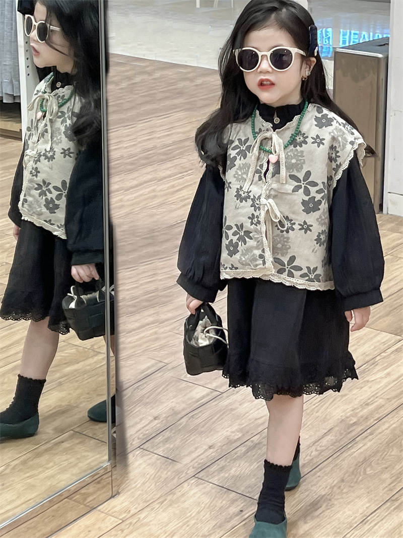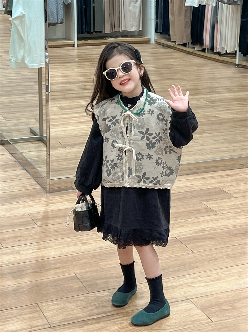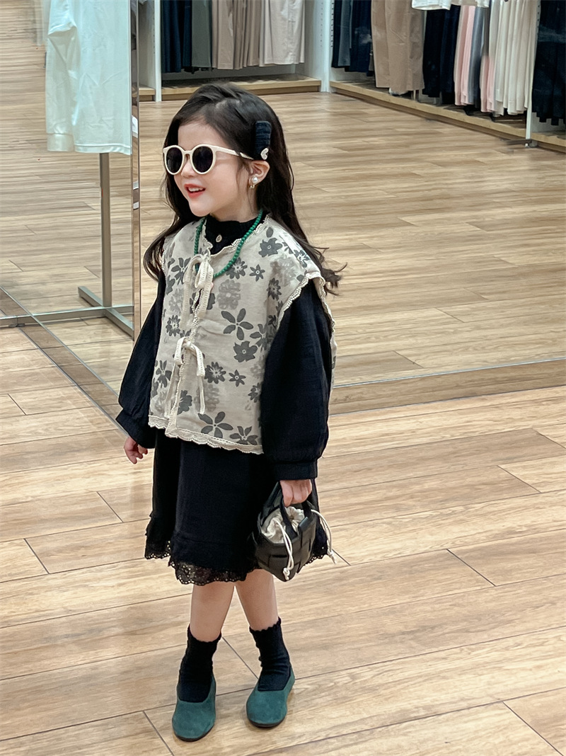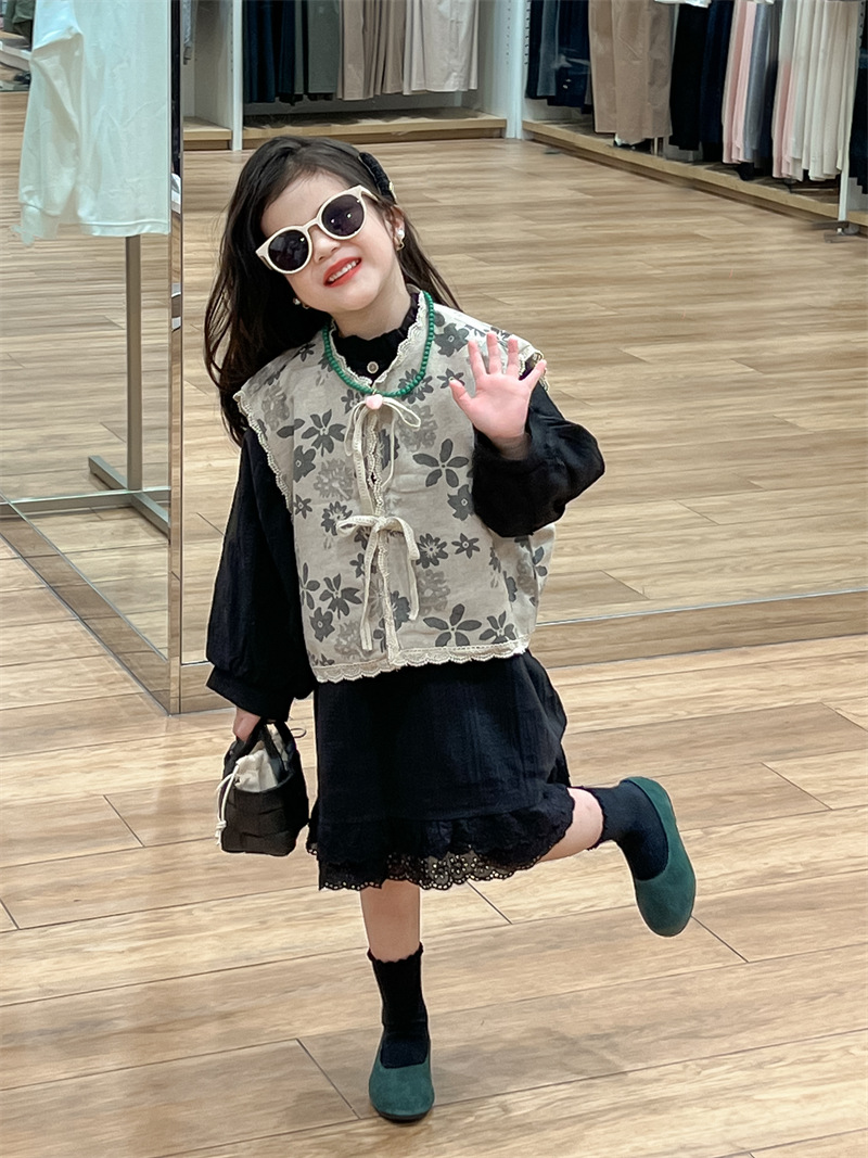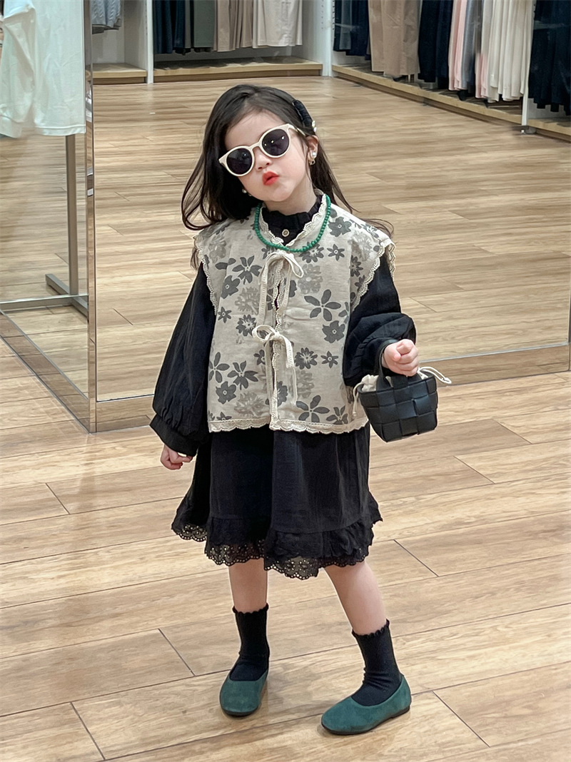 한국 아동복 소녀 모리 플로랄 빈티지 레이스 업 카디건 민소매 레이스 외부 착용 리넨 조끼