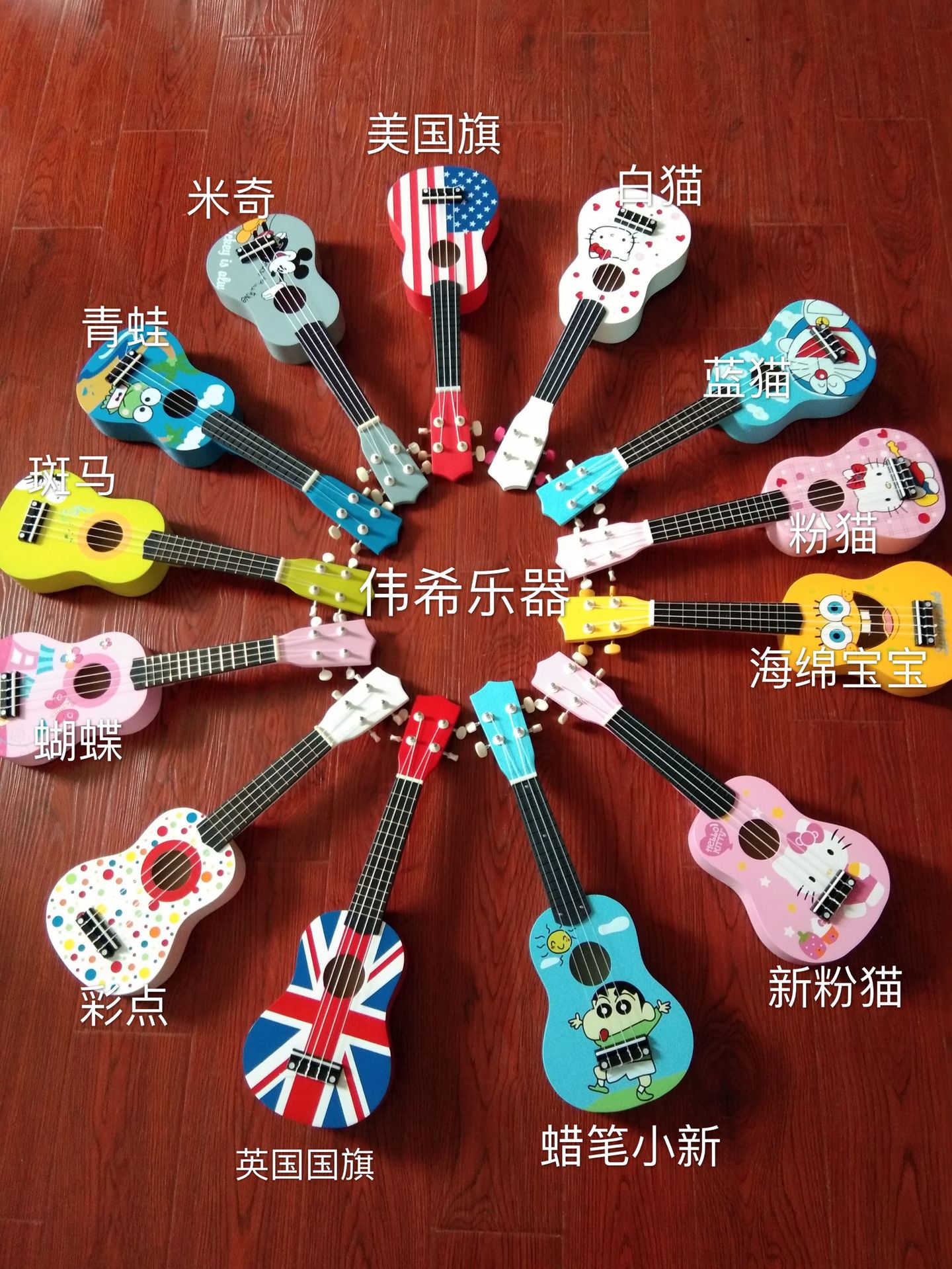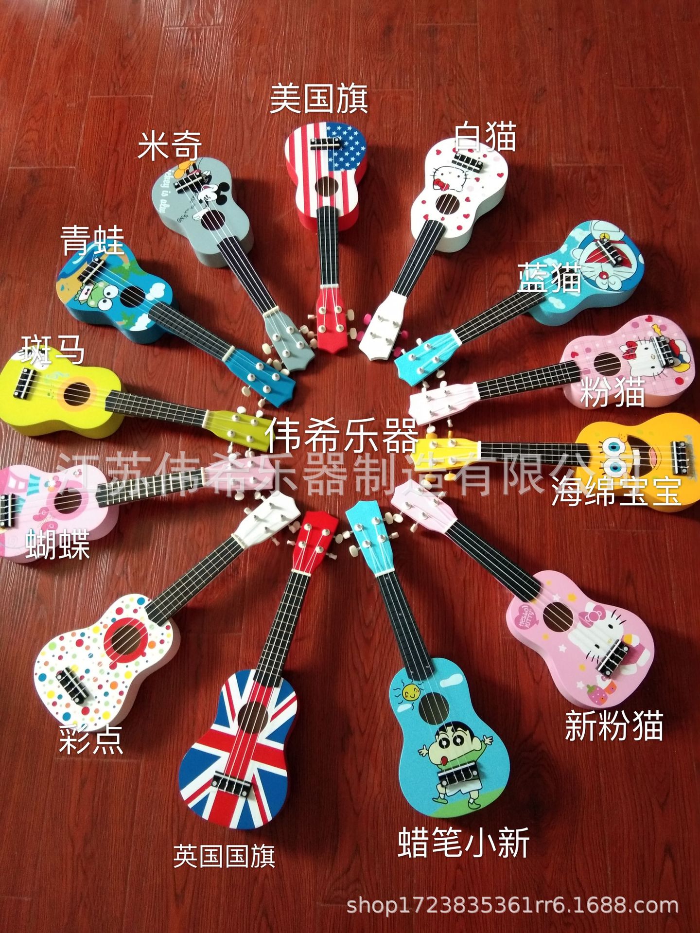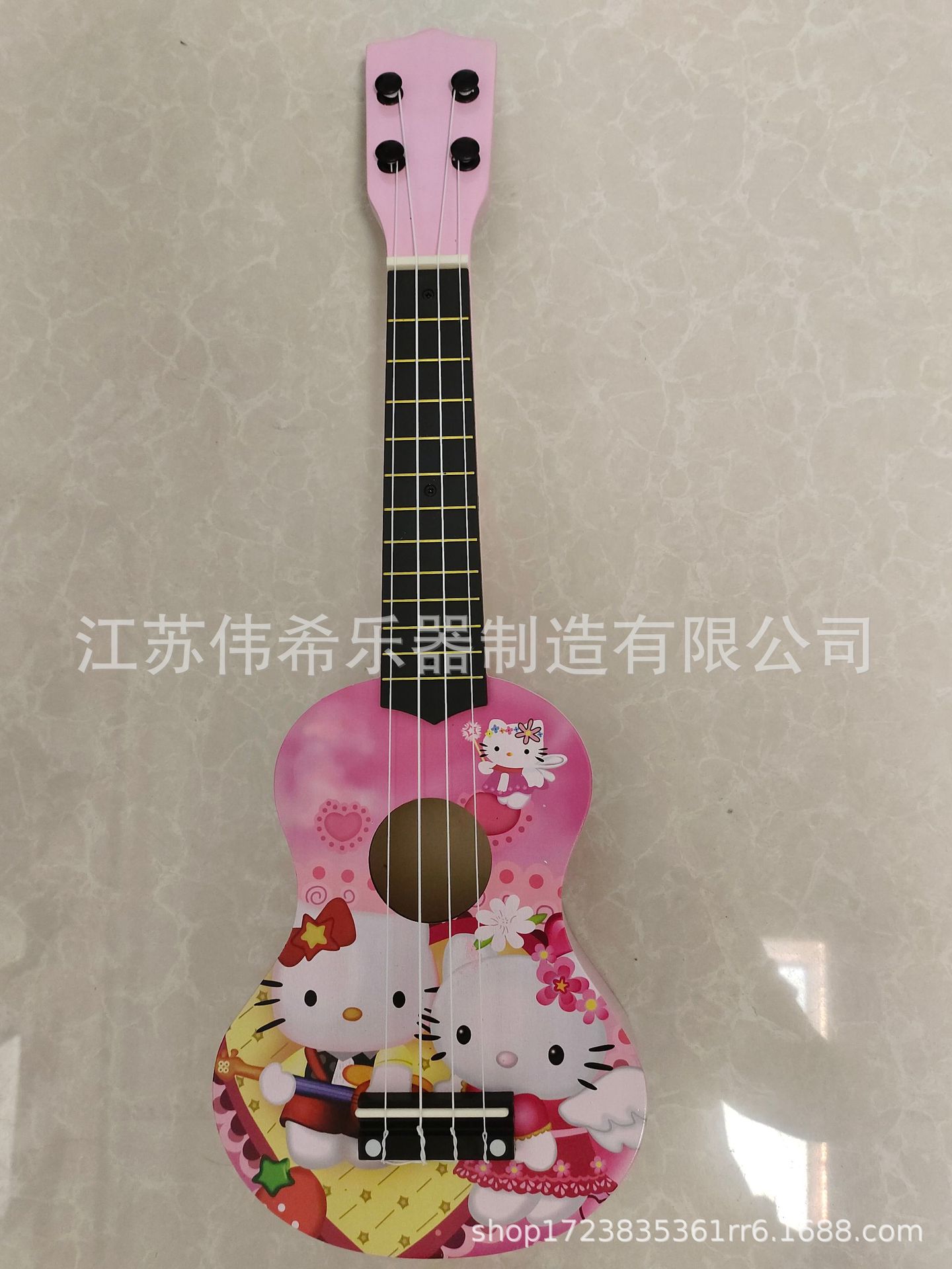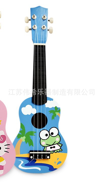만화 패턴 우쿨렐레 나무 장난감 깨달음 조기 교육은 어린이 기타 악기 제조 업체를 재생할 수 있습니다 도매