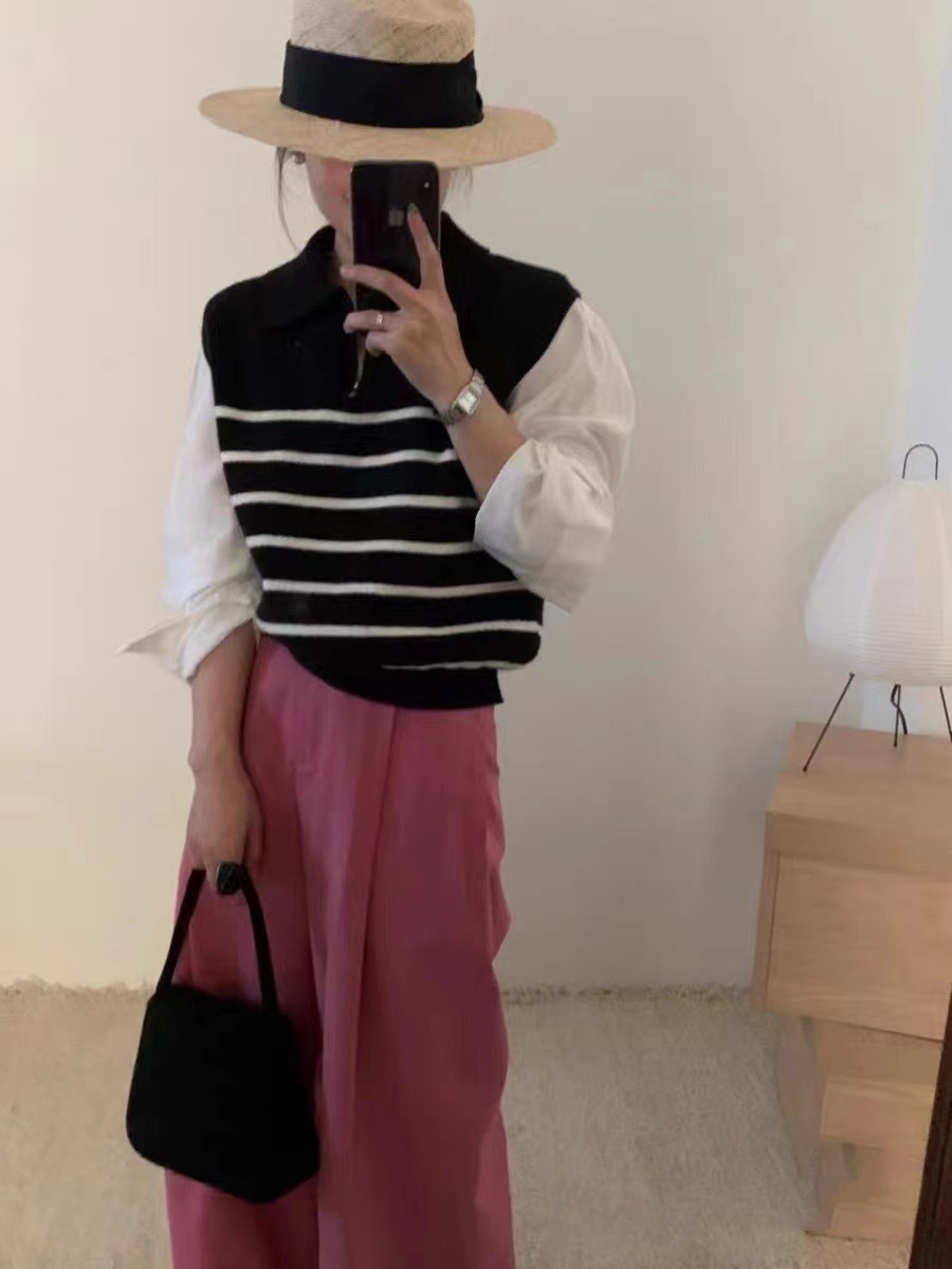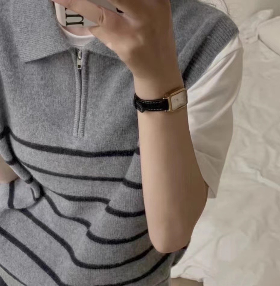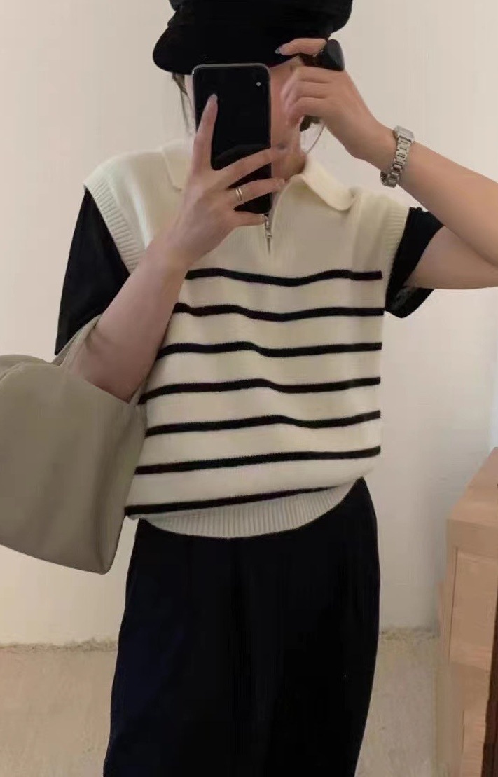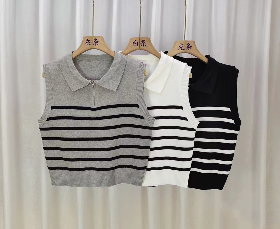 가을 새로운 한국 스타일 여성 지퍼 스트라이프 니트 조끼 민소매 탑 스웨터 여성스러운 컬러 매칭 다용도스토어 가기
