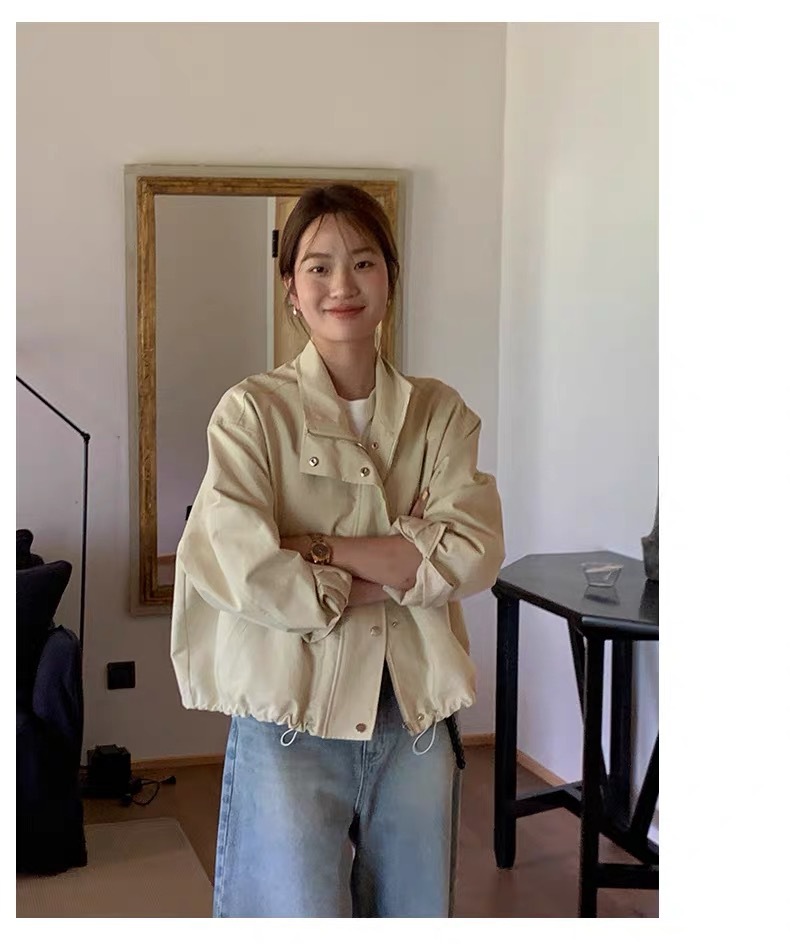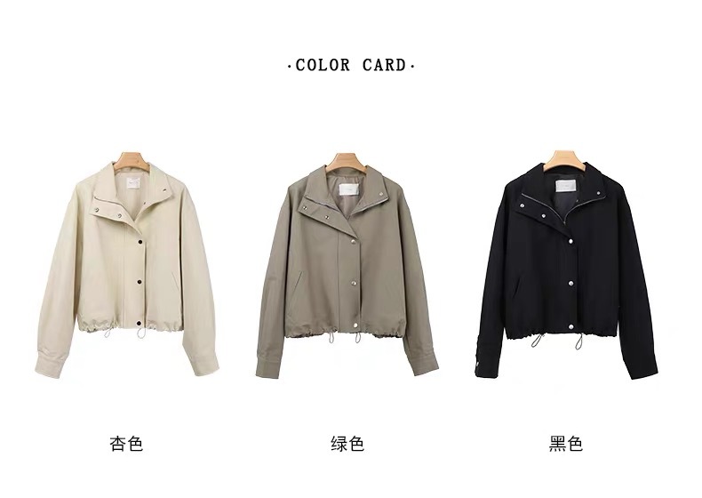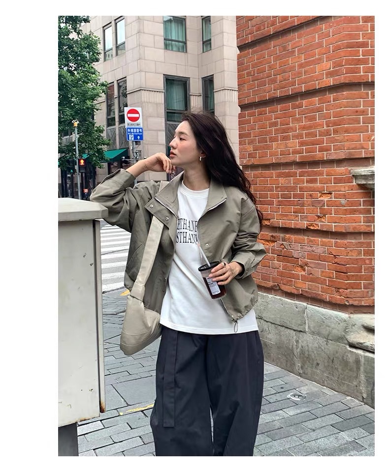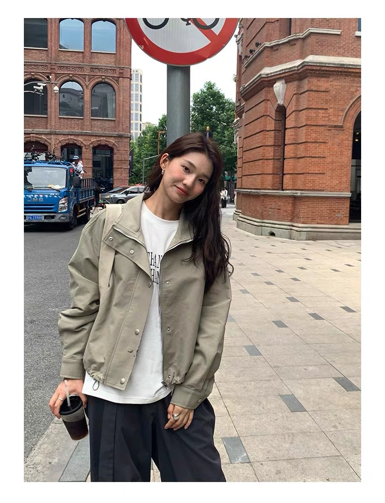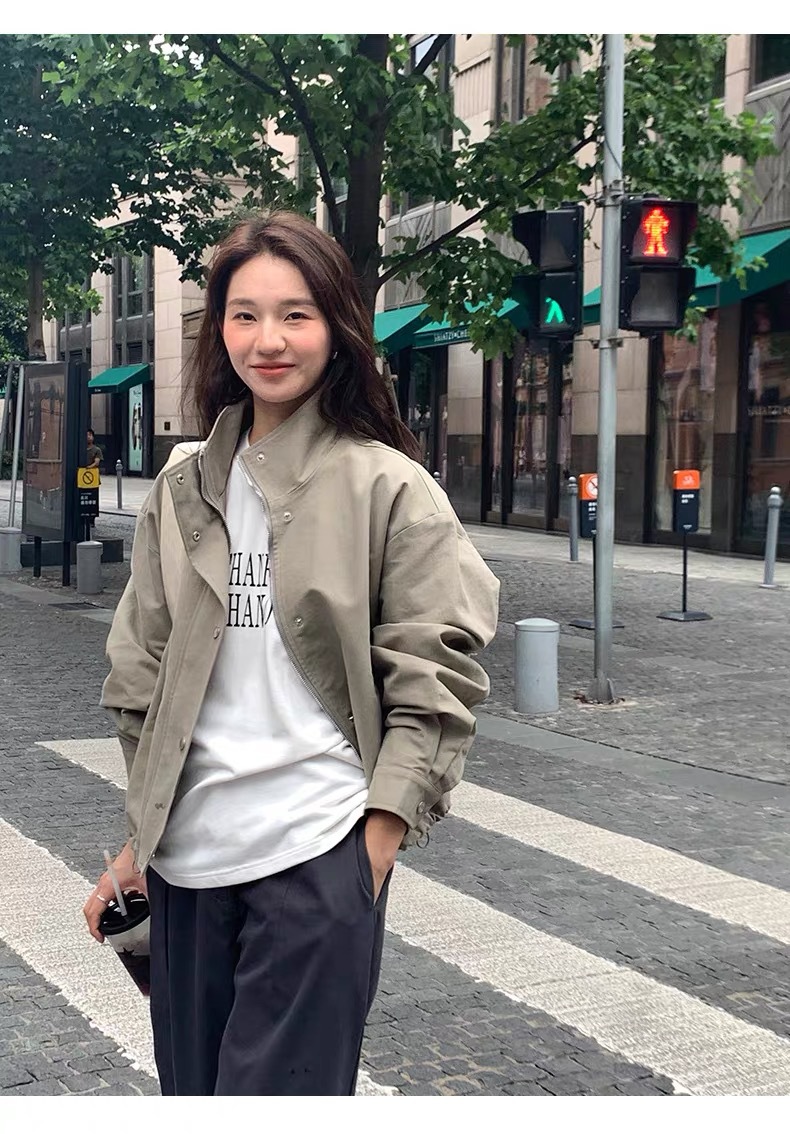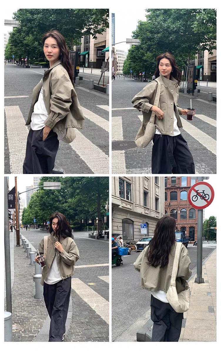 여자 쇼트 윈드브레이커 재킷, 세로 칼라 올매치 한국식 슬림 가을 · 겨울 새 스타일 쁘띠 2024 재킷 카키스토어 가기