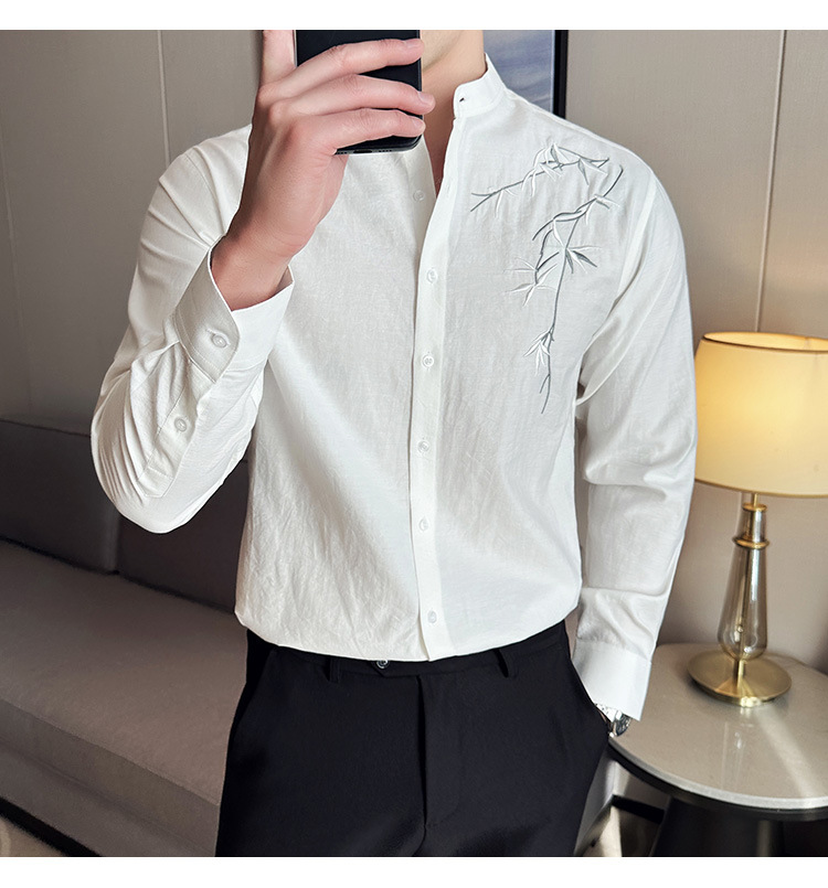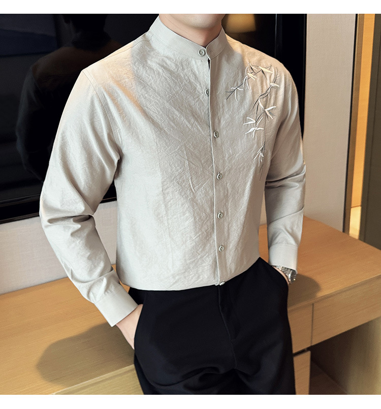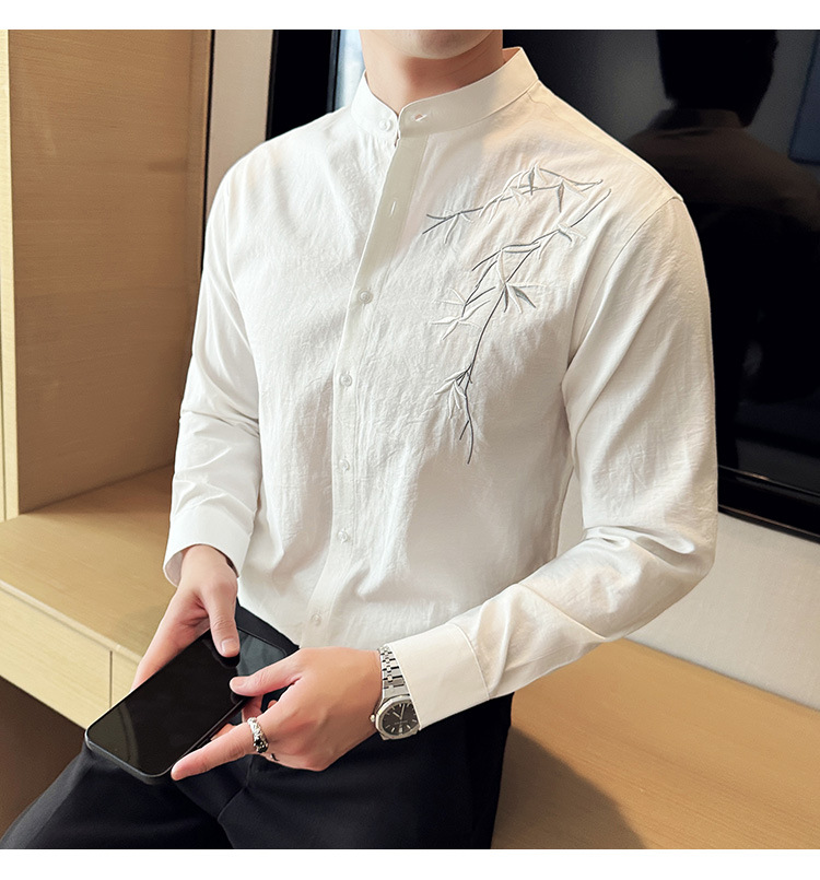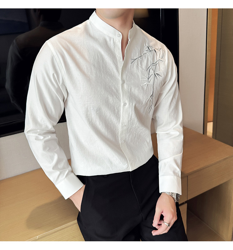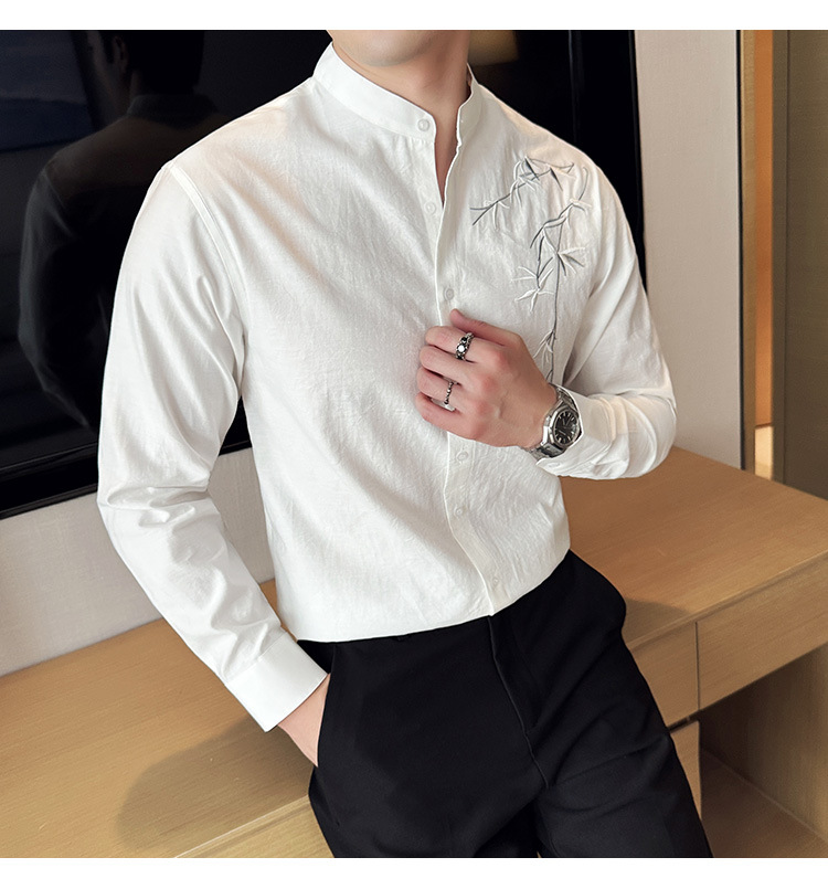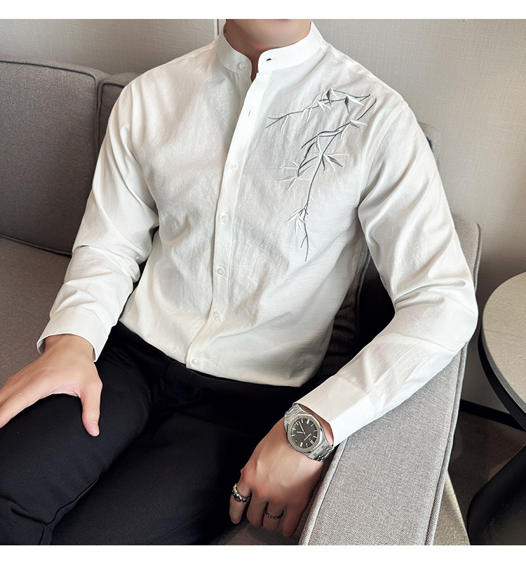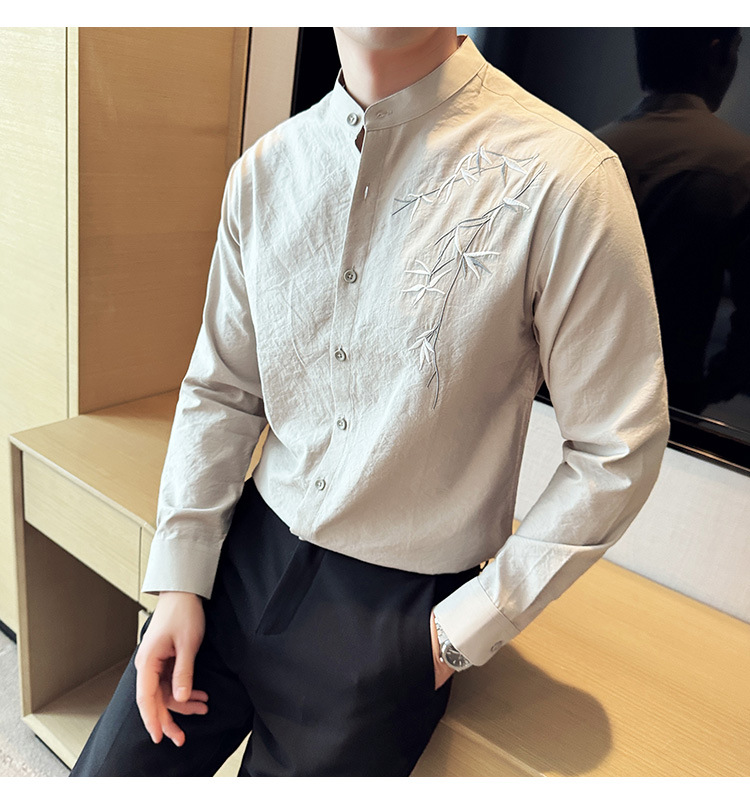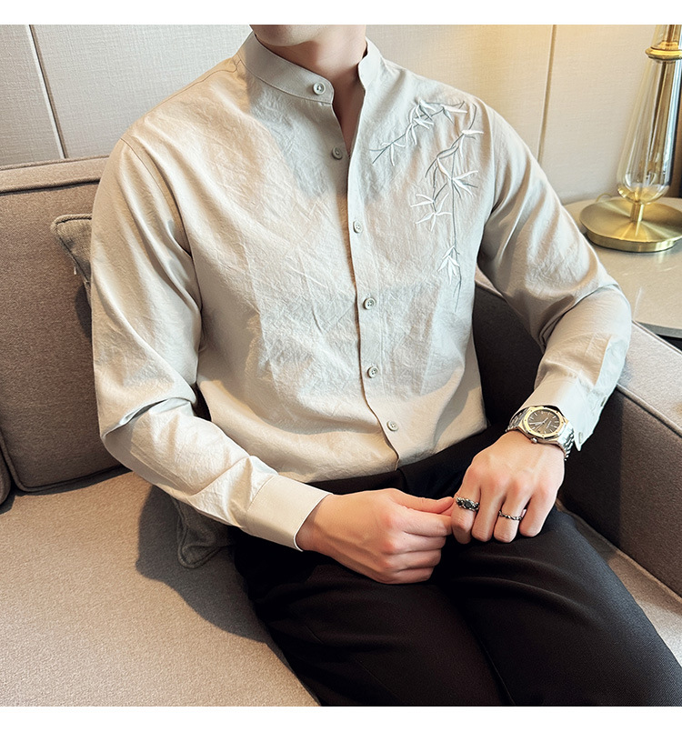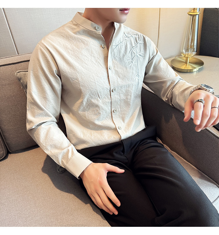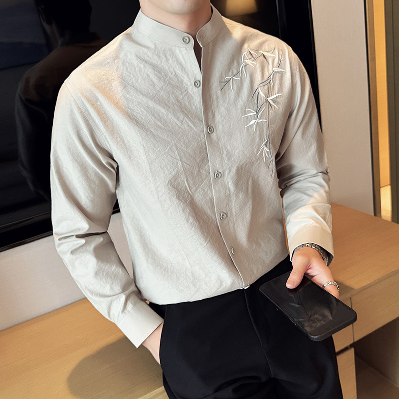 중국 스타일 새로운 도착 남성 긴팔 셔츠 하이 스타일 스탠딩 칼라 국가 스타일 자수 새로운 중국 스타일 코튼 리넨 긴팔 셔츠