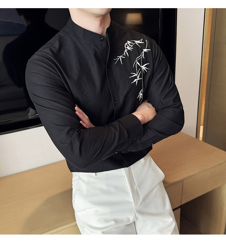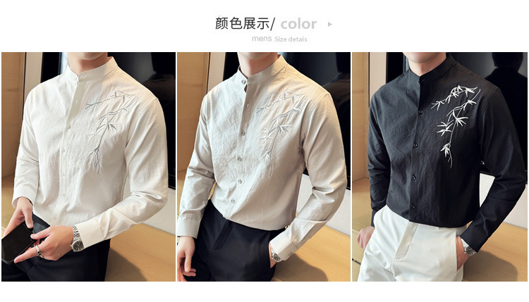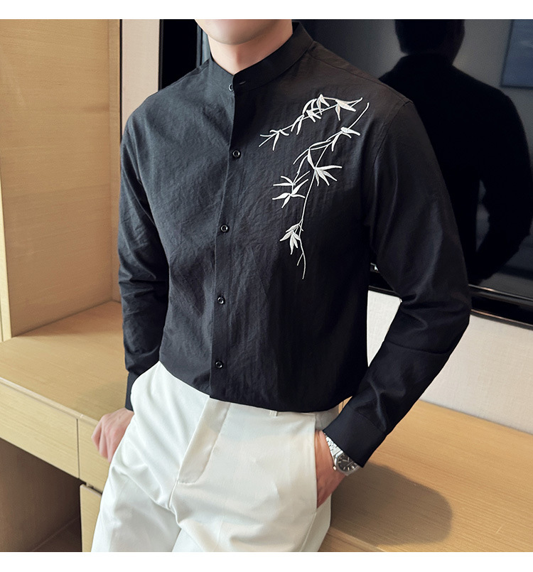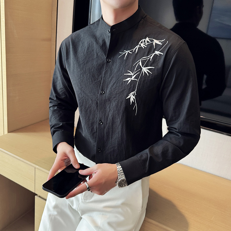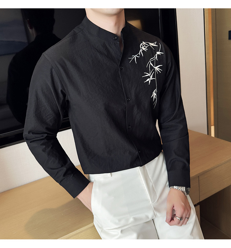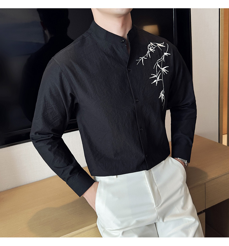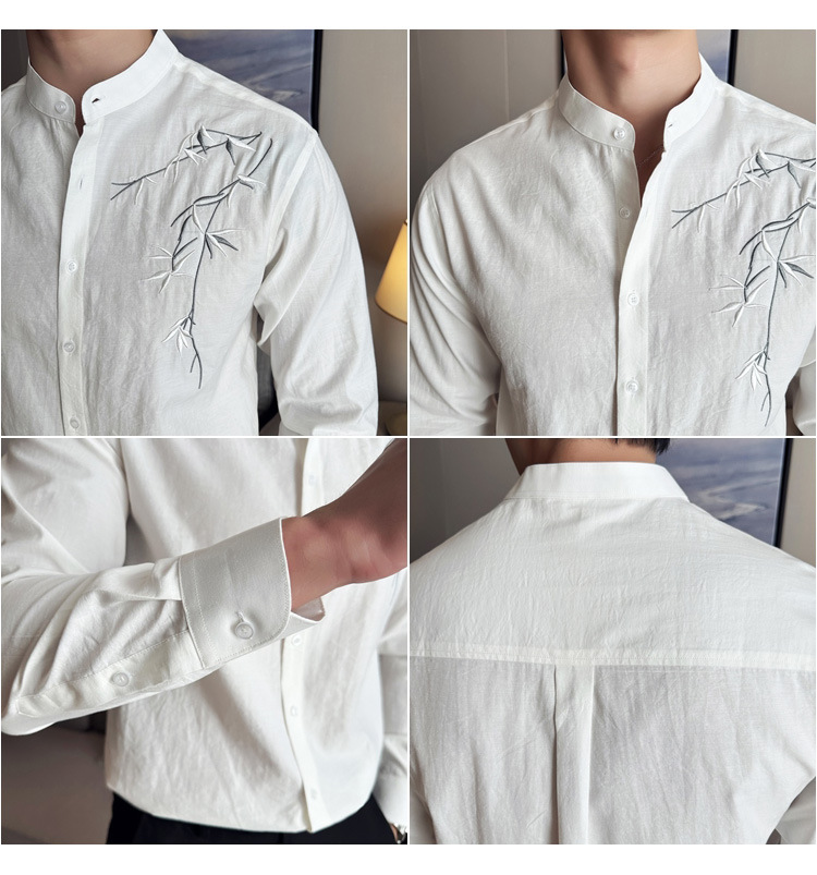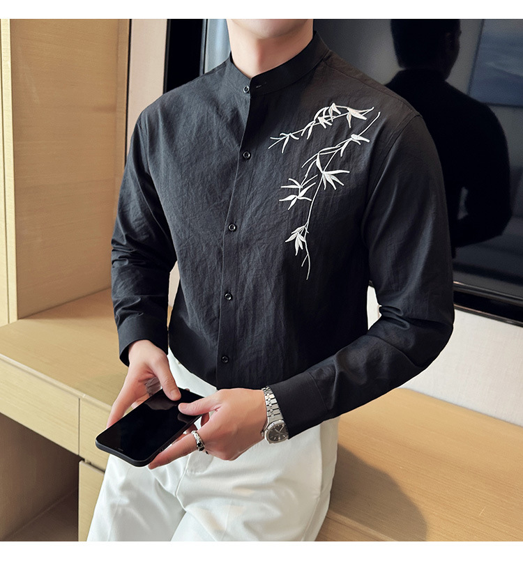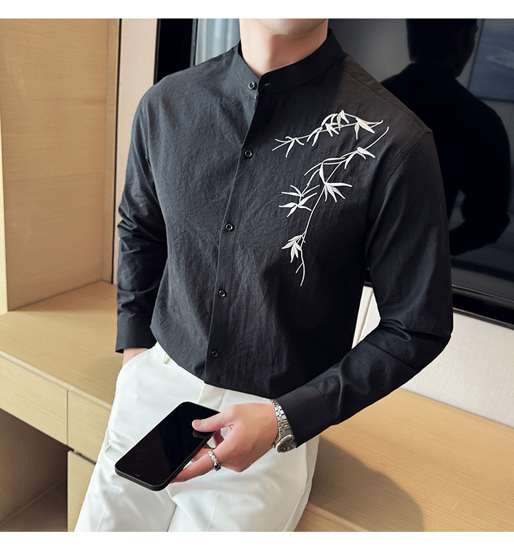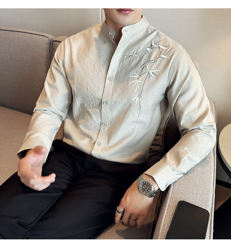 중국 스타일 새로운 도착 남성 긴팔 셔츠 하이 스타일 스탠딩 칼라 국가 스타일 자수 새로운 중국 스타일 코튼 리넨 긴팔 셔츠