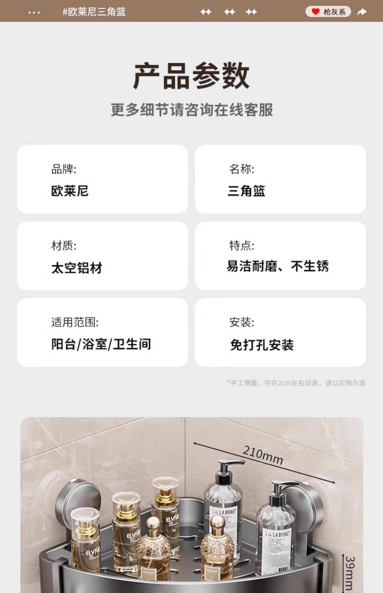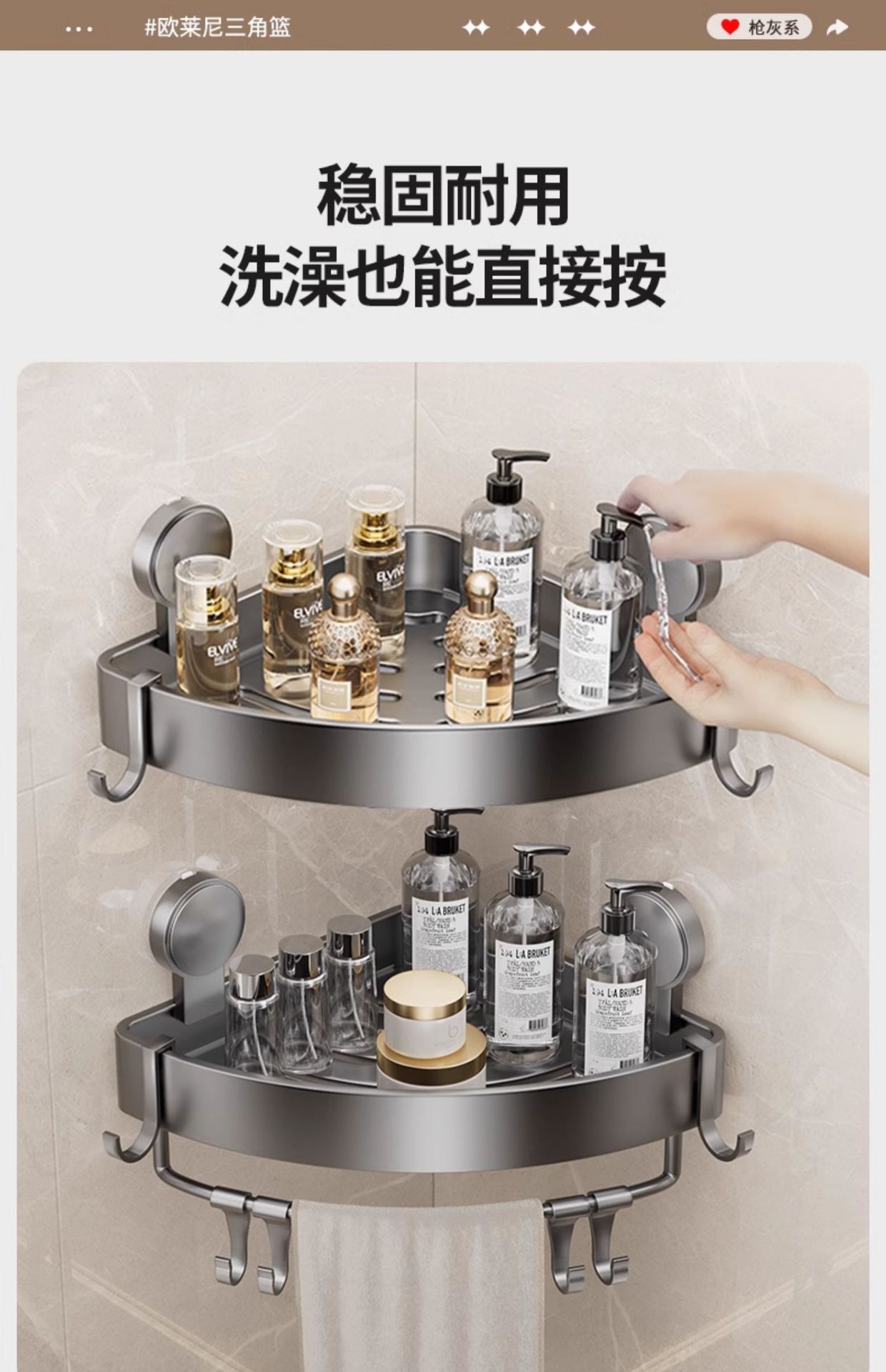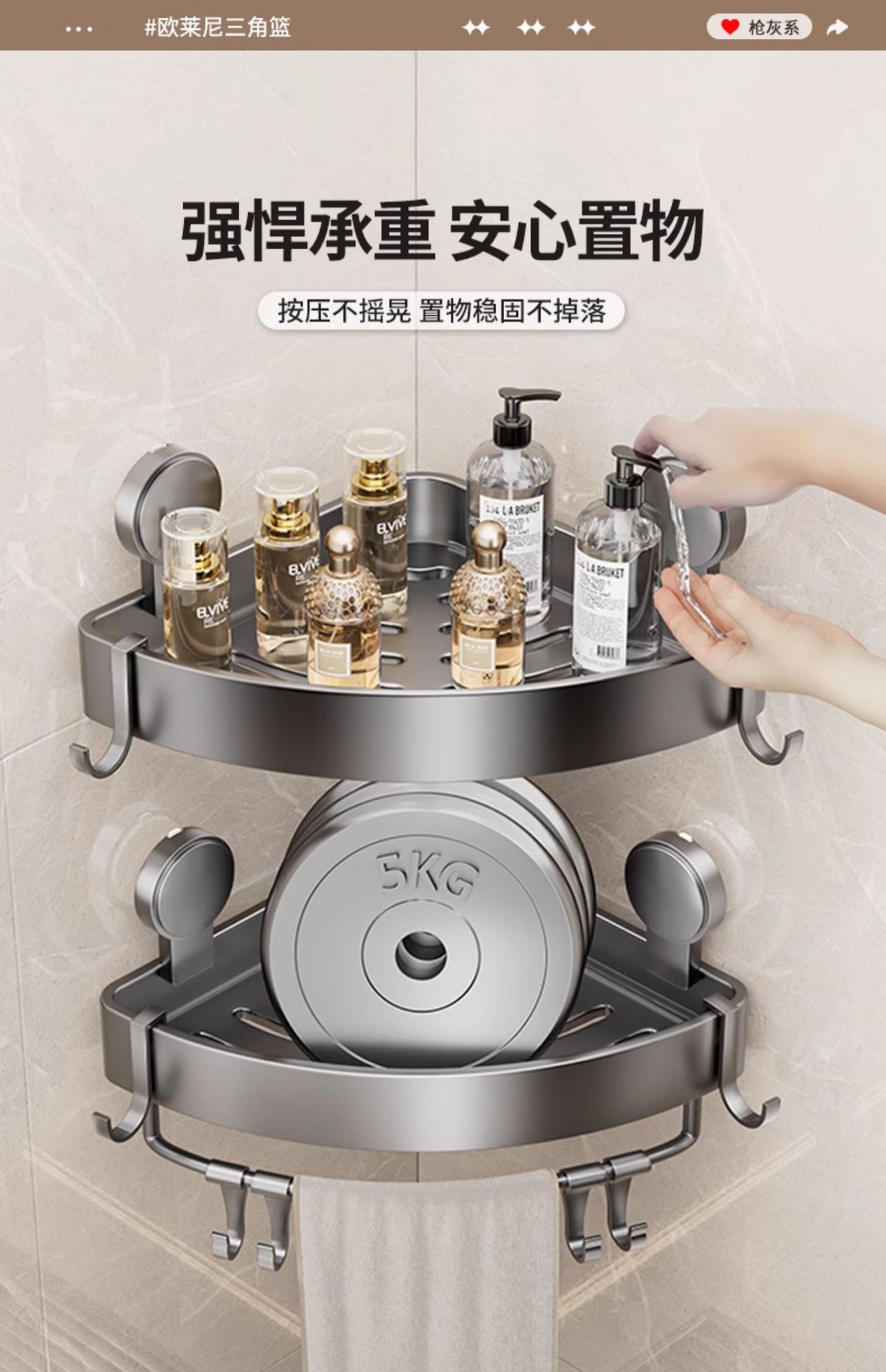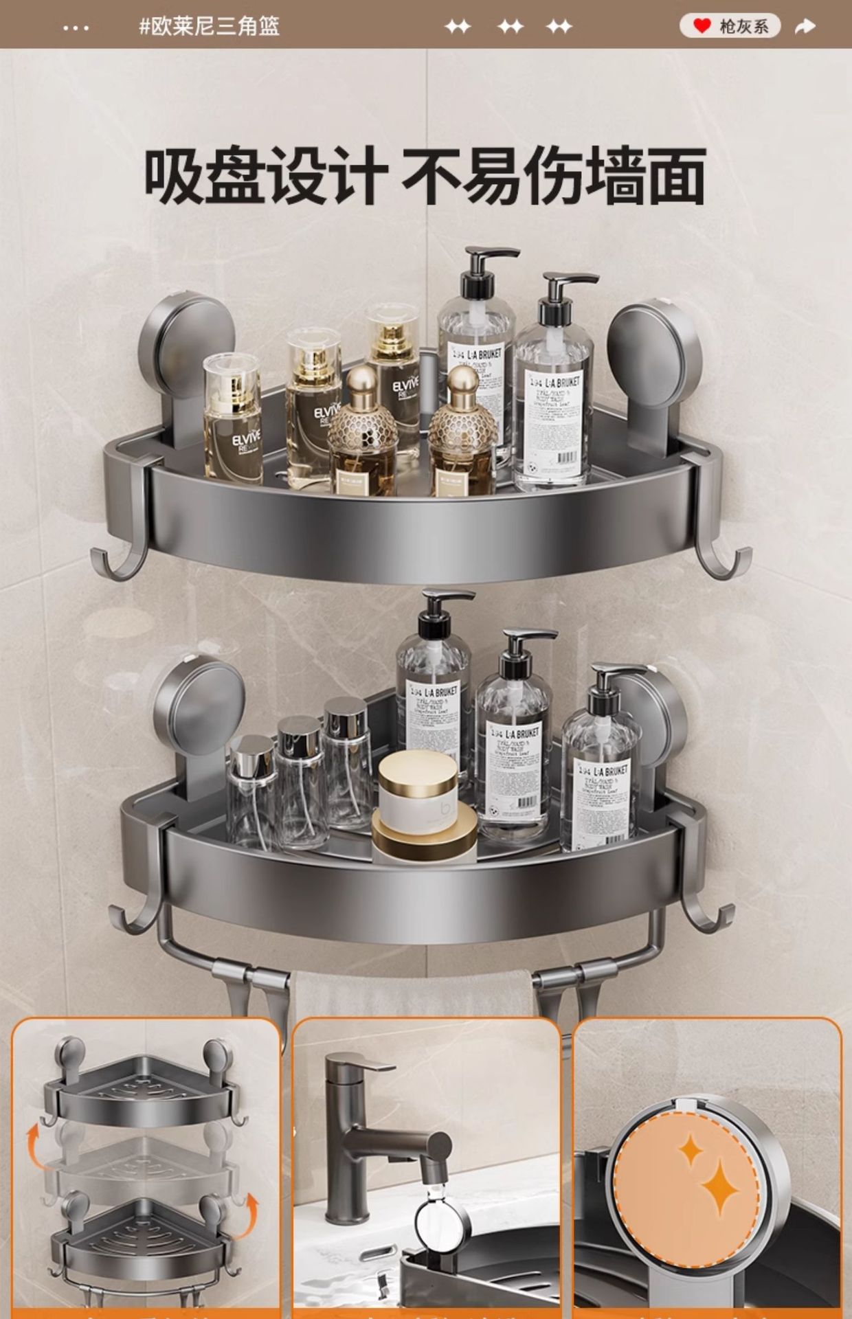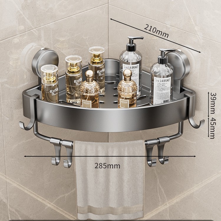 • 건 그레이❥높이가 6.8cm인 진공 흡착 삼각형 바구니 - 막대가 있는 3겹 [흡입 컵은 분리 가능하고 재사용 가능]