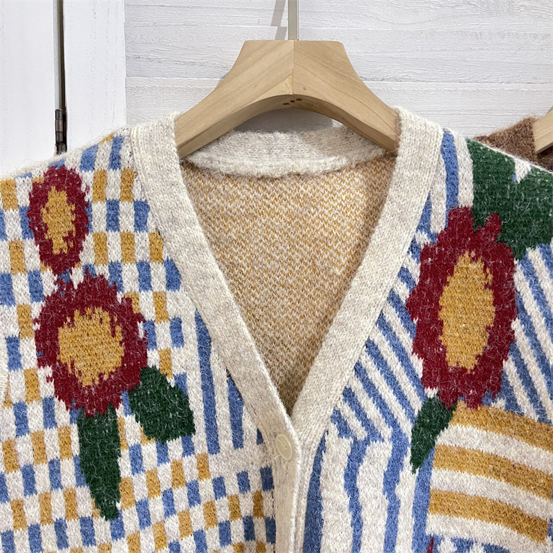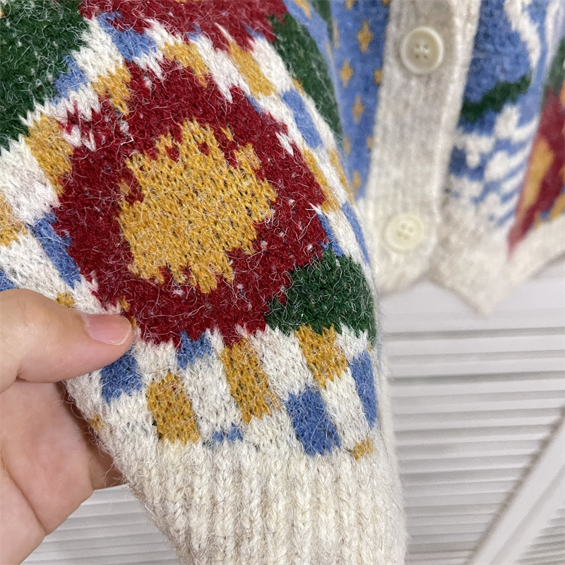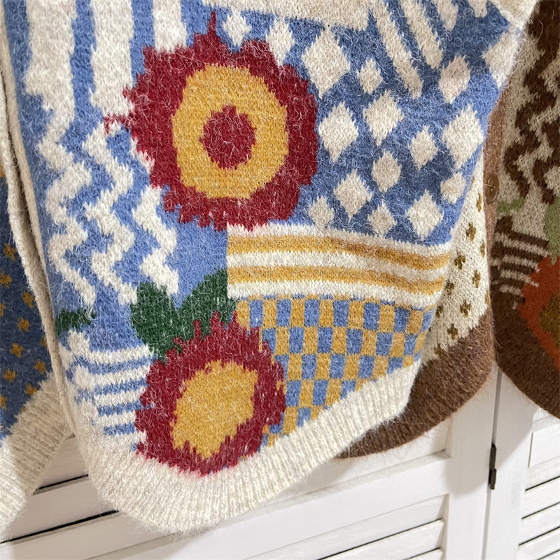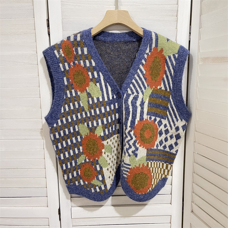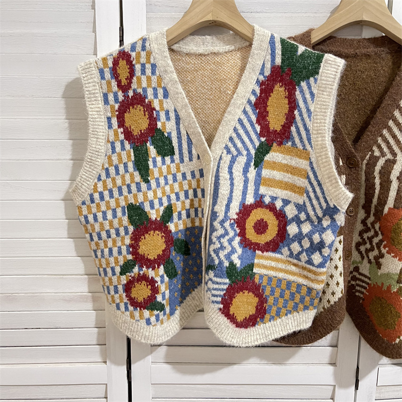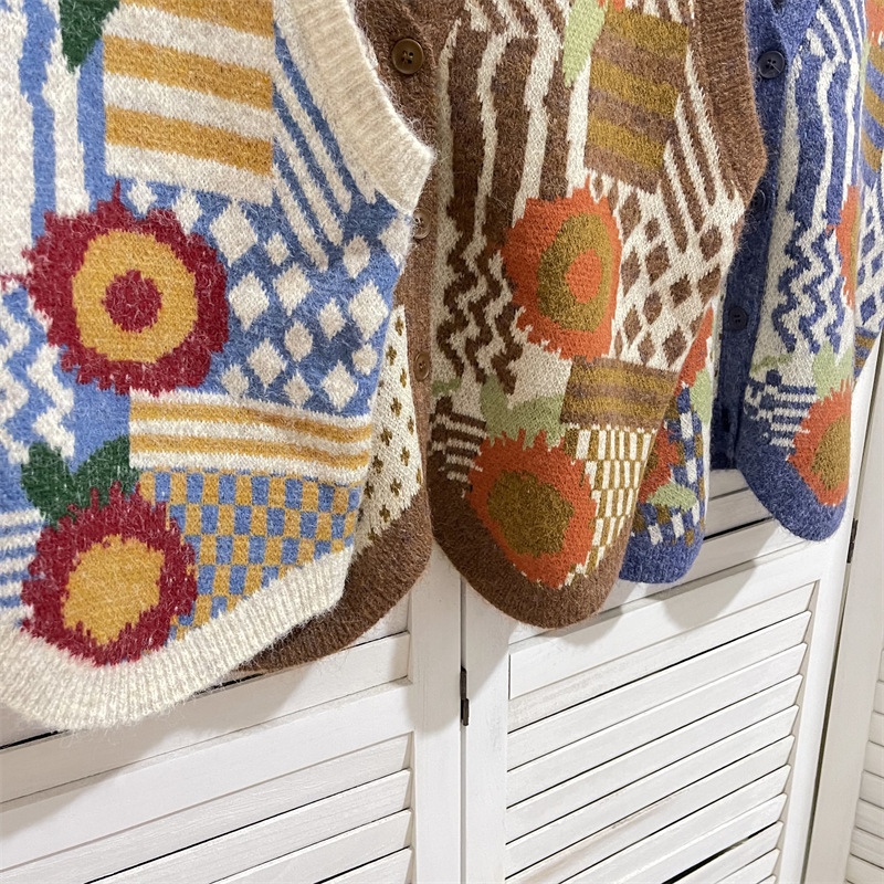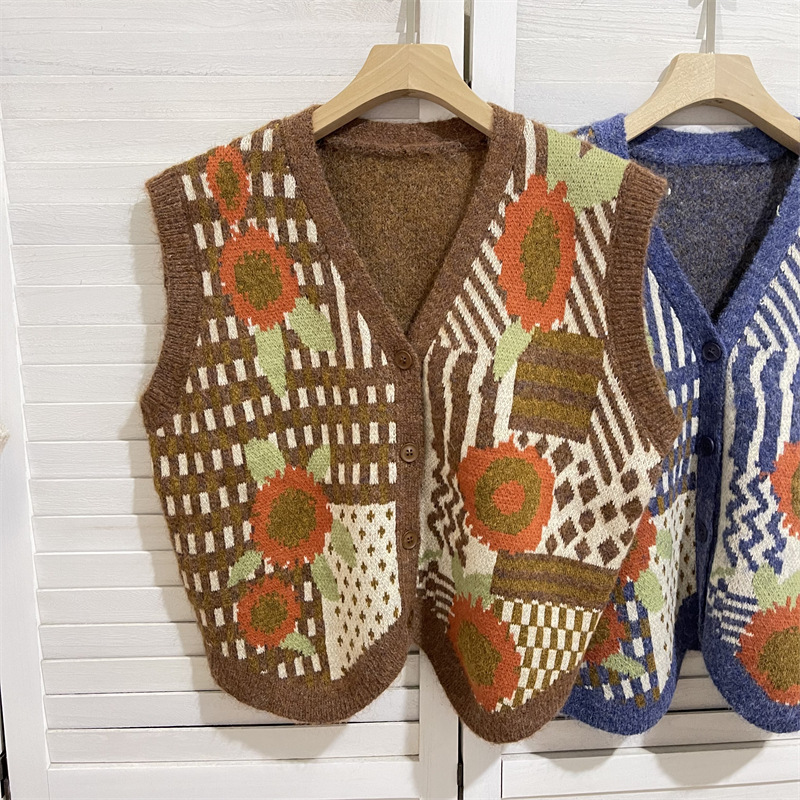 커피 꽃 빈티지 카디건 조끼 재킷 여성 디자인 센스 가을과 겨울 V 넥 올 매치 싱글 브레스트 조끼