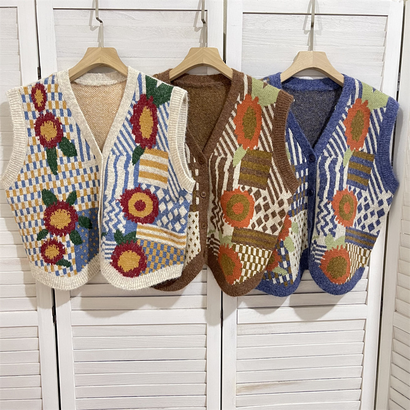 커피 꽃 빈티지 카디건 조끼 재킷 여성 디자인 센스 가을과 겨울 V 넥 올 매치 싱글 브레스트 조끼스토어 가기