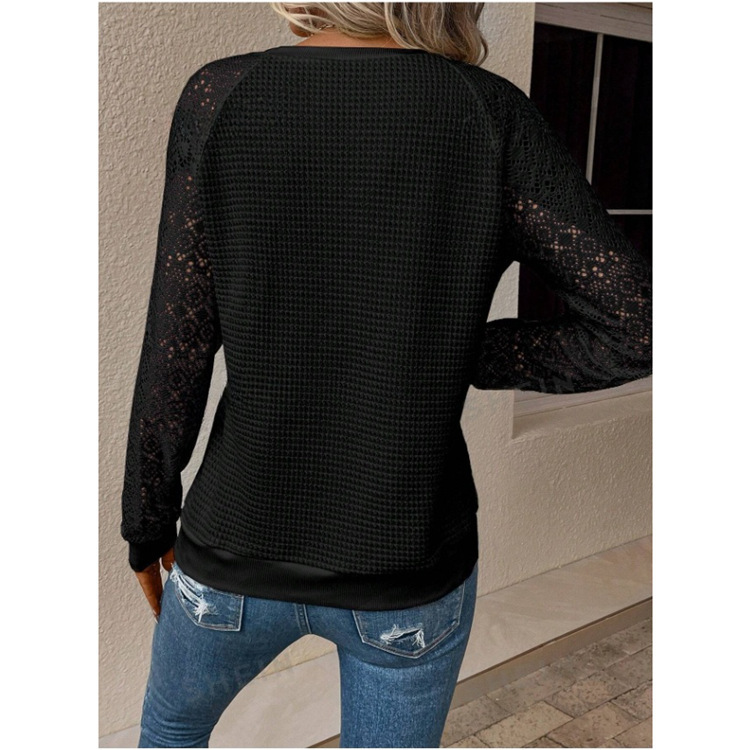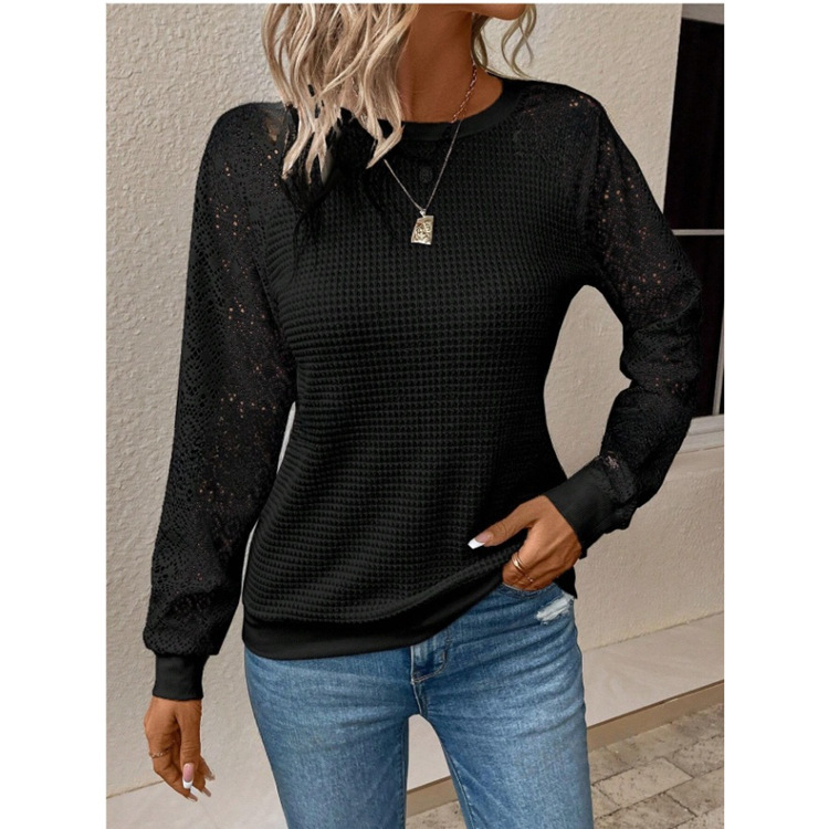 2024 독립 역 아마존 테무 폭발 가을 플러스 사이즈 새로운 라운드 넥 긴 소매 레이스 스티칭 셔츠 여성스토어 가기