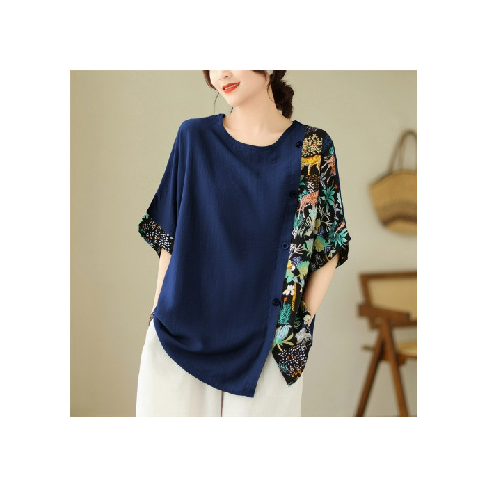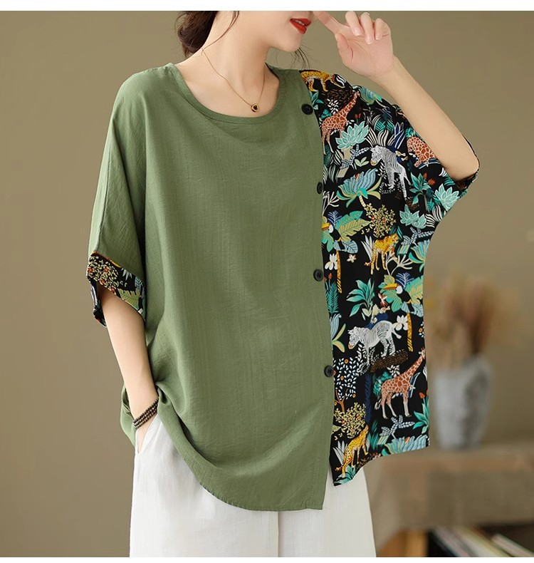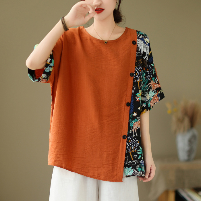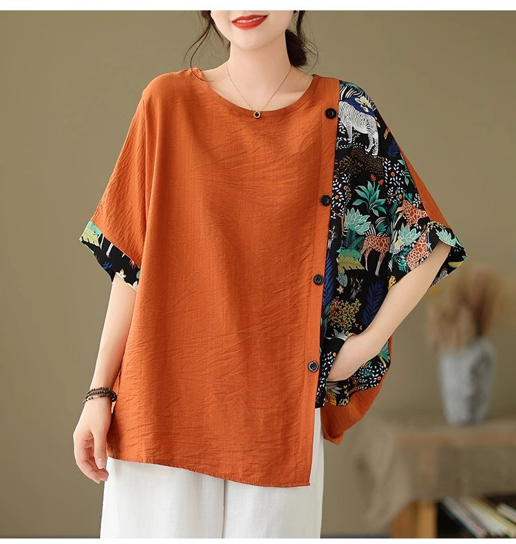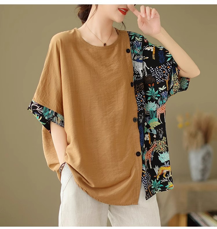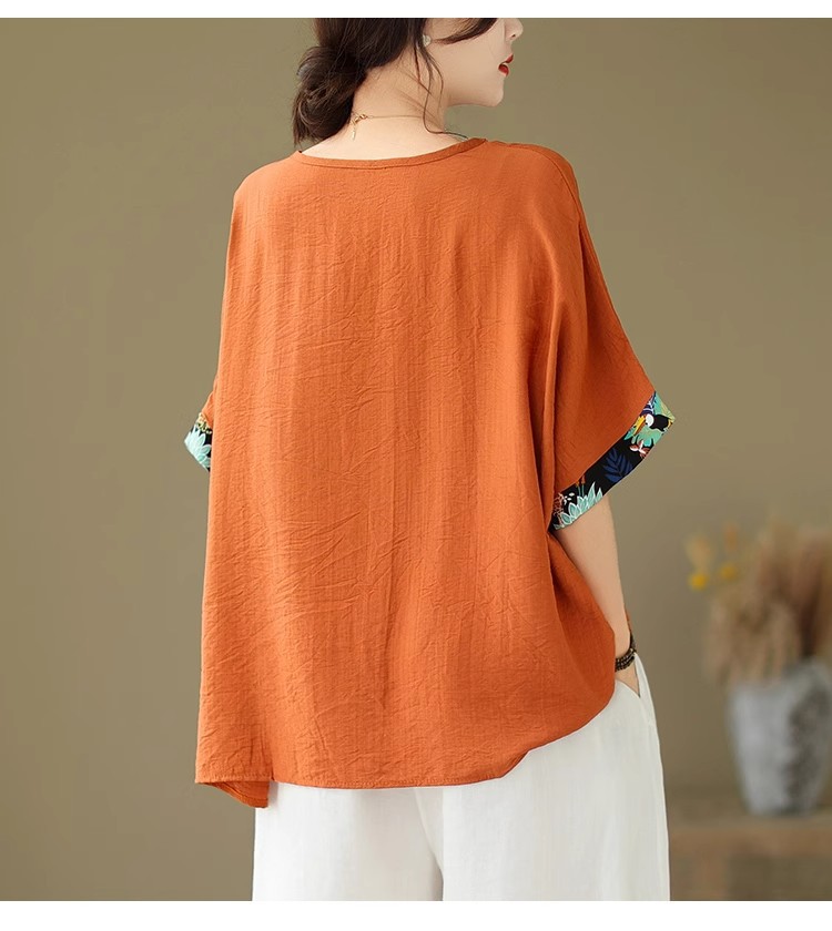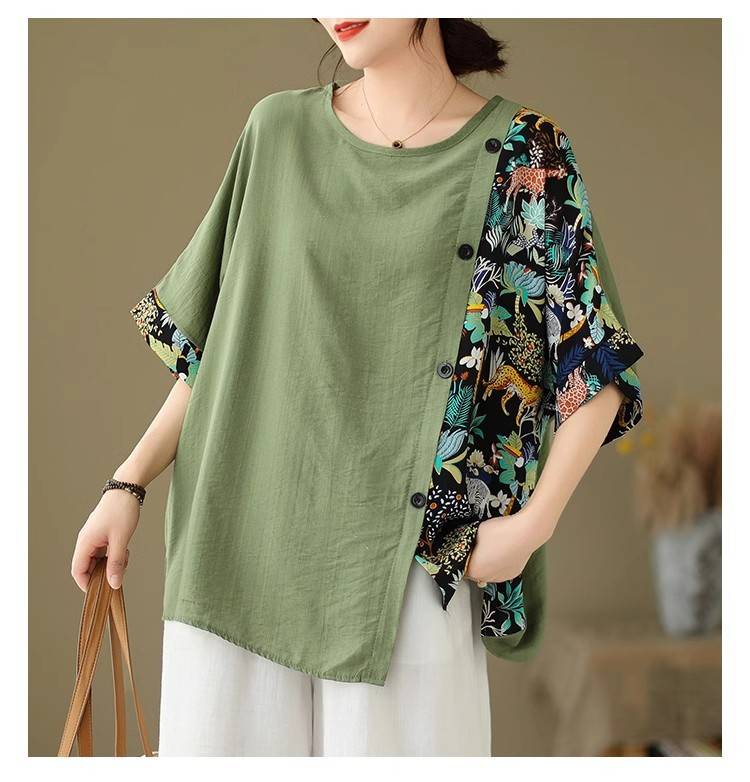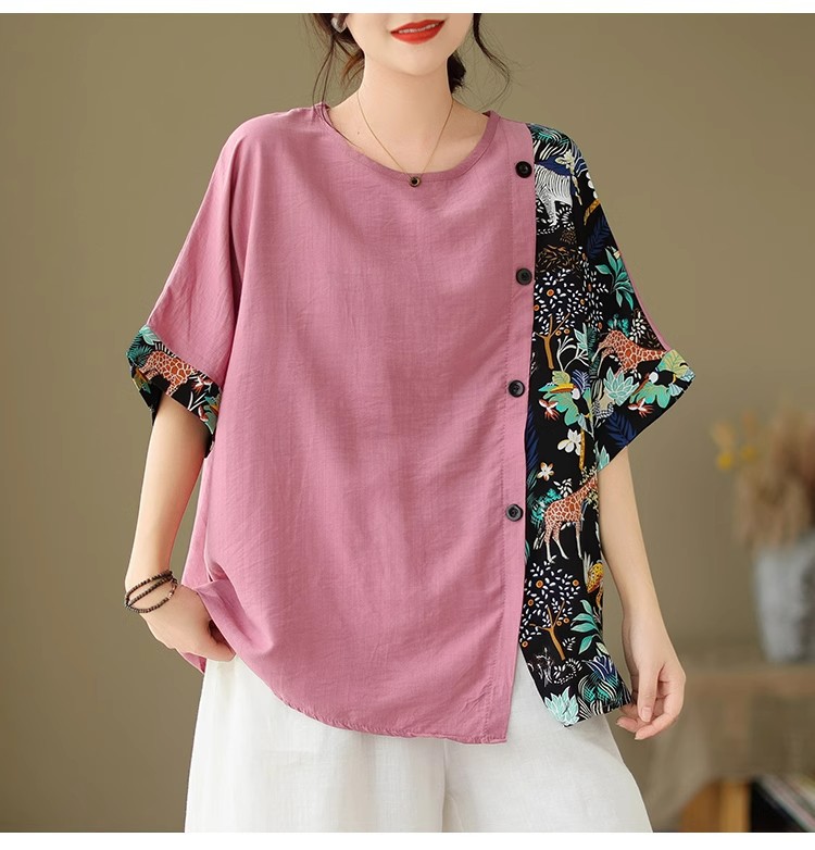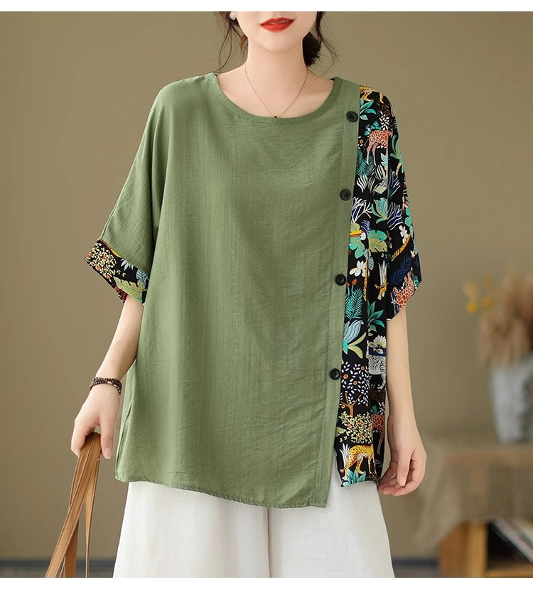 코튼 리넨 플러스 사이즈 여성 2024 년 여름 뉴 통통녀 탑 루즈 슬림 아티스틱 스티칭 반팔 티셔츠 여성스토어 가기