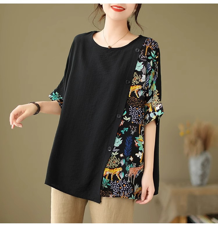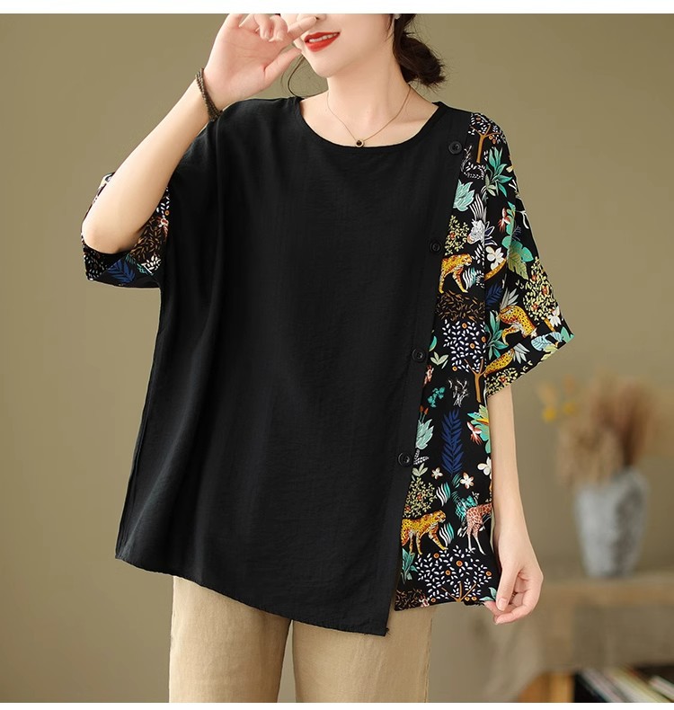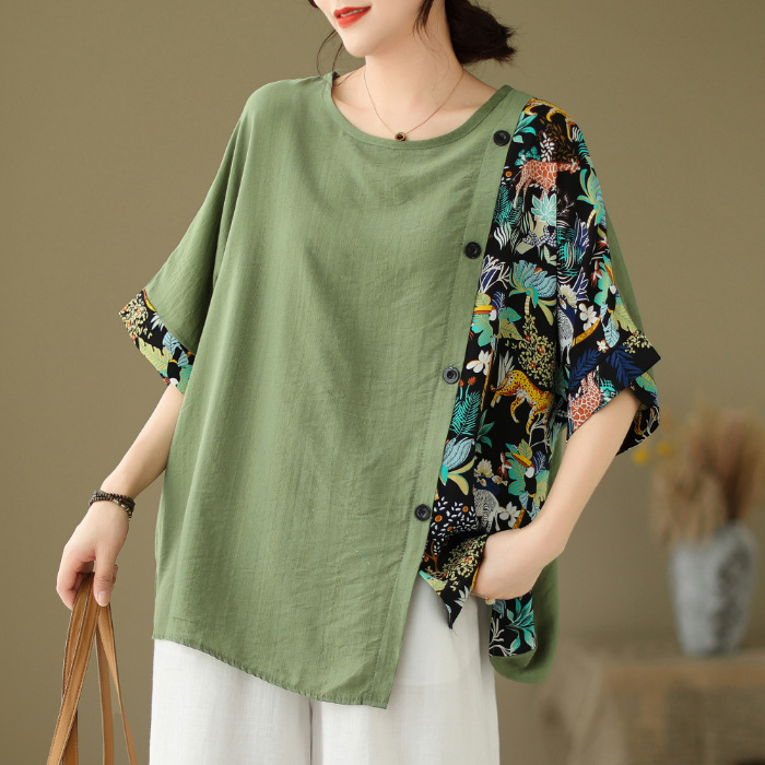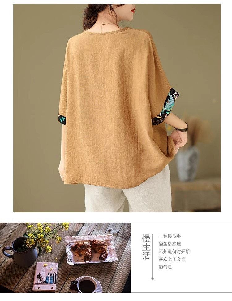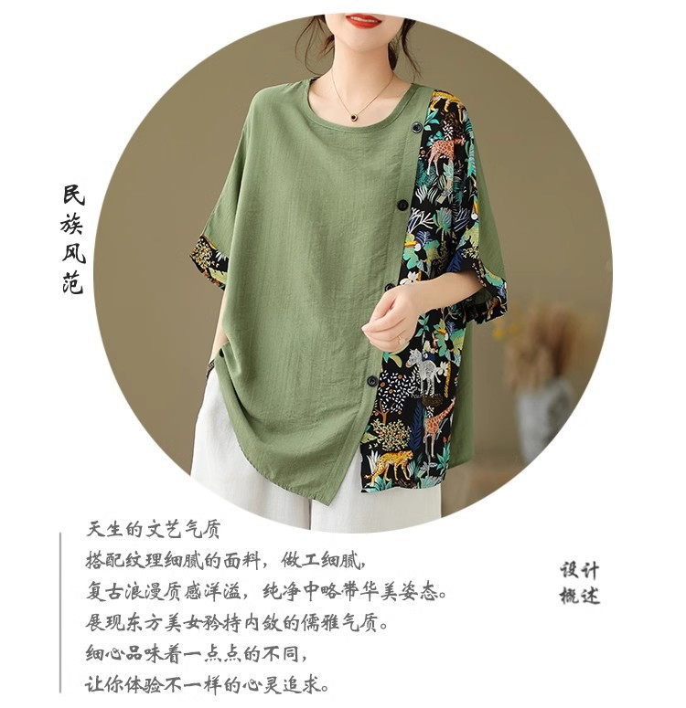 코튼 리넨 플러스 사이즈 여성 2024 년 여름 뉴 통통녀 탑 루즈 슬림 아티스틱 스티칭 반팔 티셔츠 여성