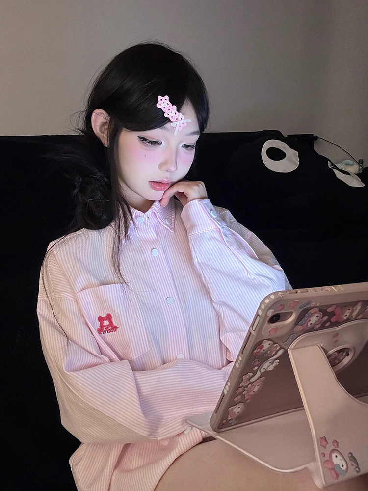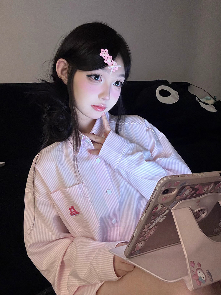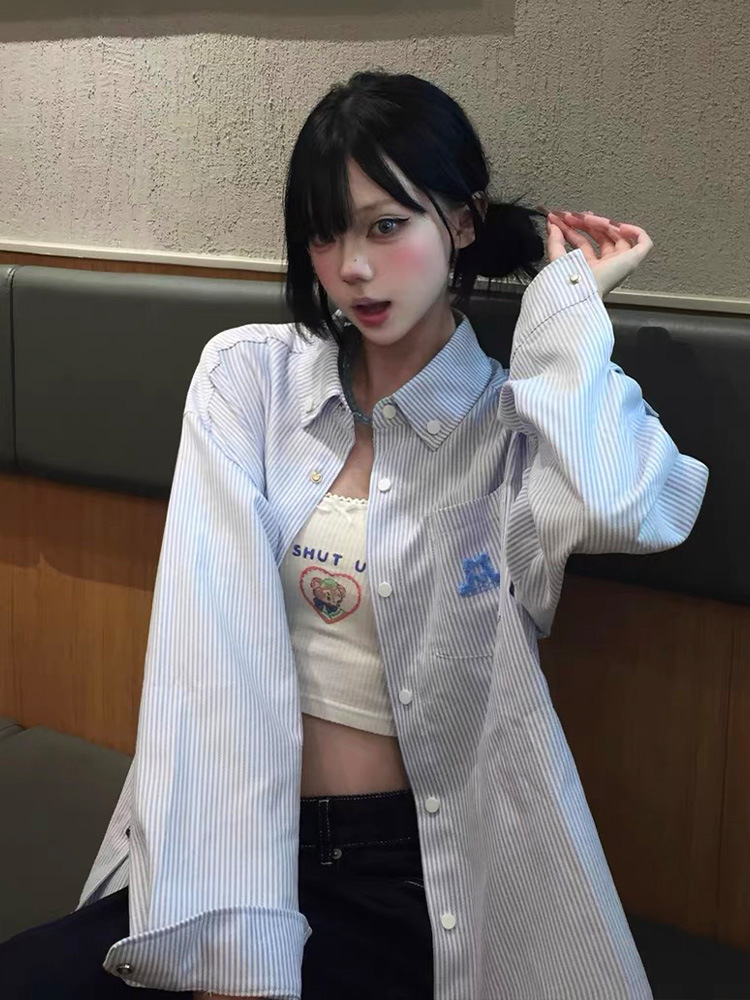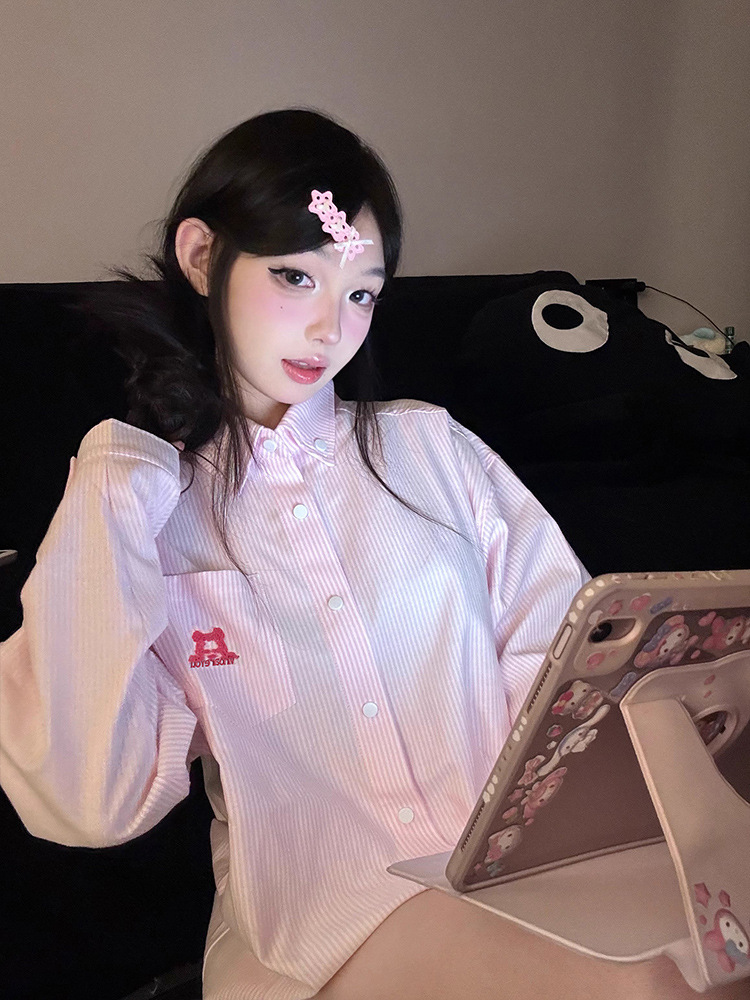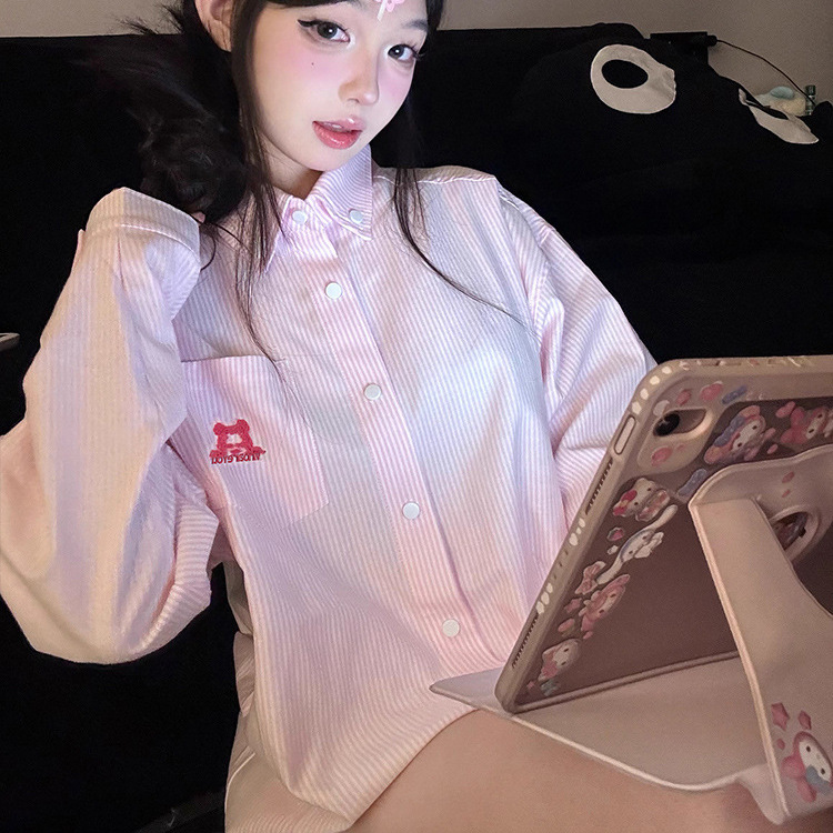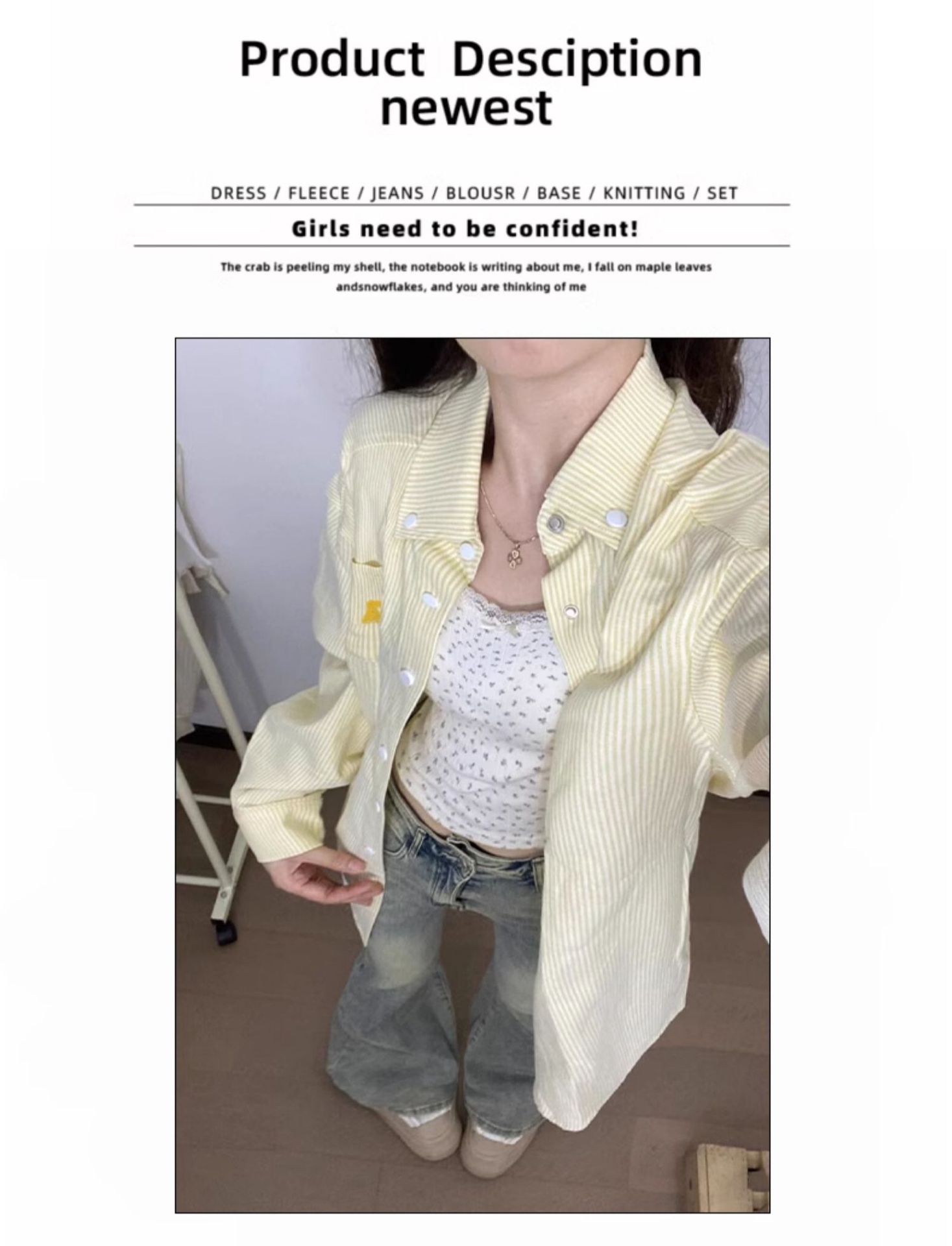 미국 복고풍 노란 줄무늬 폴로 칼라 셔츠 코트 여성의 봄과 가을 느슨한 자수 강아지 카디건 탑 도매