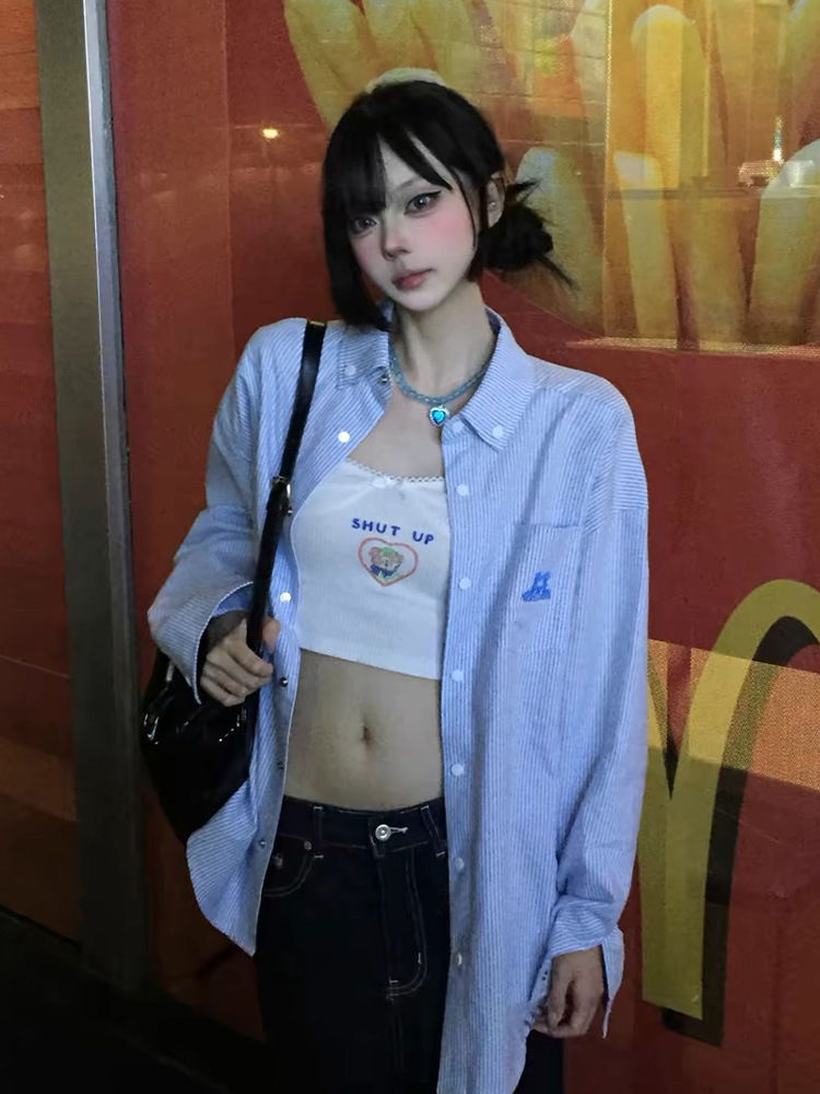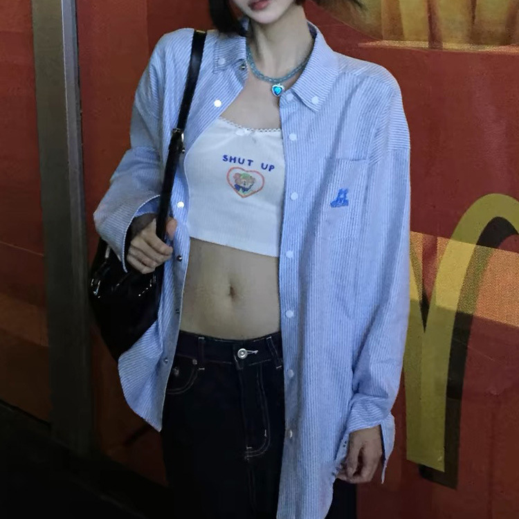 미국 복고풍 노란 줄무늬 폴로 칼라 셔츠 코트 여성의 봄과 가을 느슨한 자수 강아지 카디건 탑 도매스토어 가기