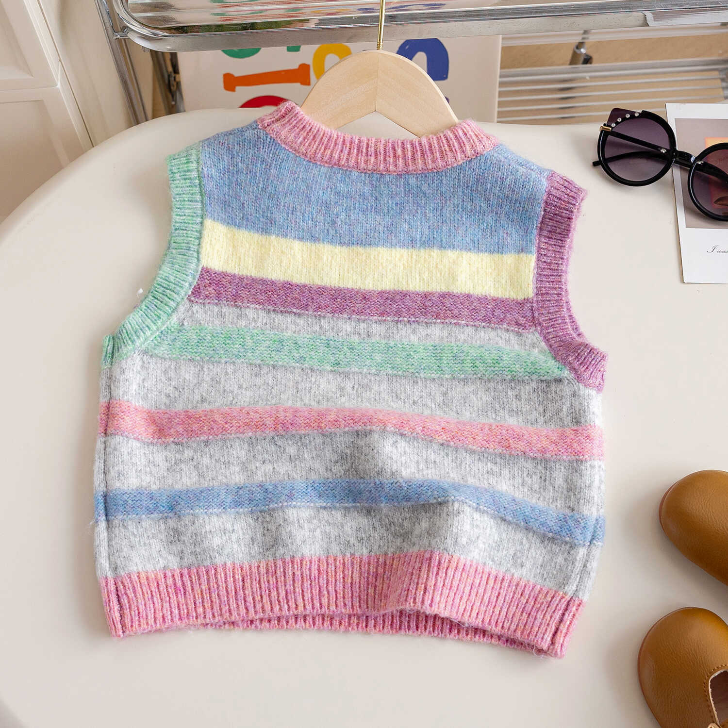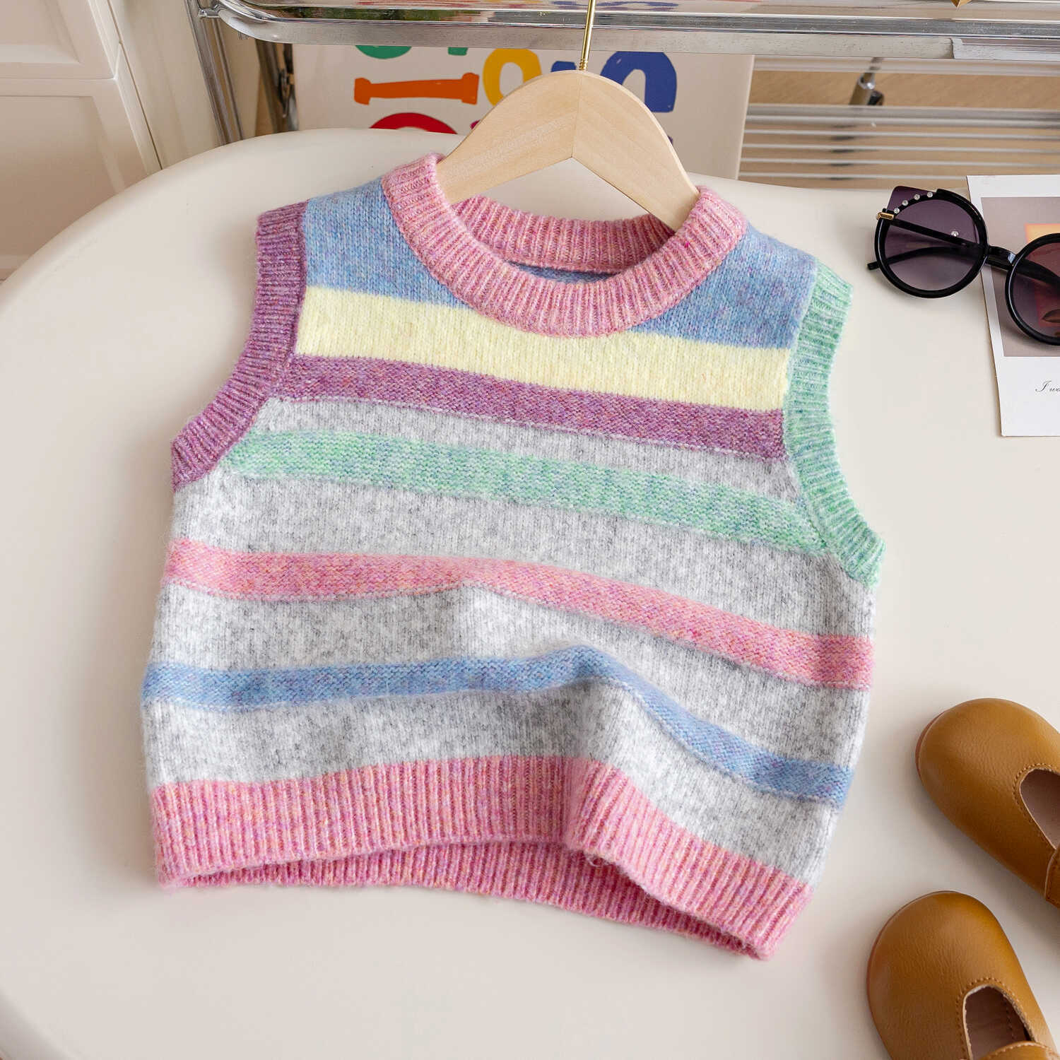 여아용 컬러풀 스트라이프 니트 조끼 2025 가을 신상품 한국 스타일 다용도 니트웨어 아동 상의