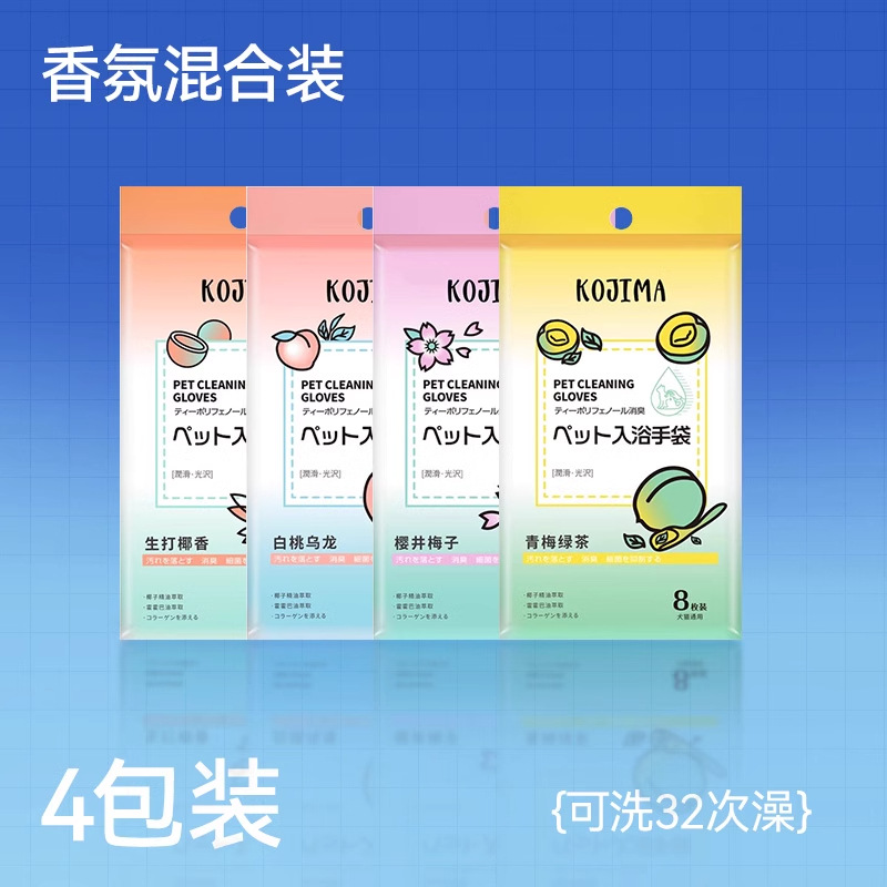 【品名】:KOJIMA宠物免洗手套湿巾6片装/宠物免洗手套(生打椰香/青梅绿茶/白桃乌龙/樱井梅子)珍珠纹款8片