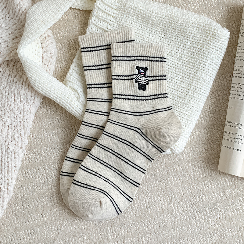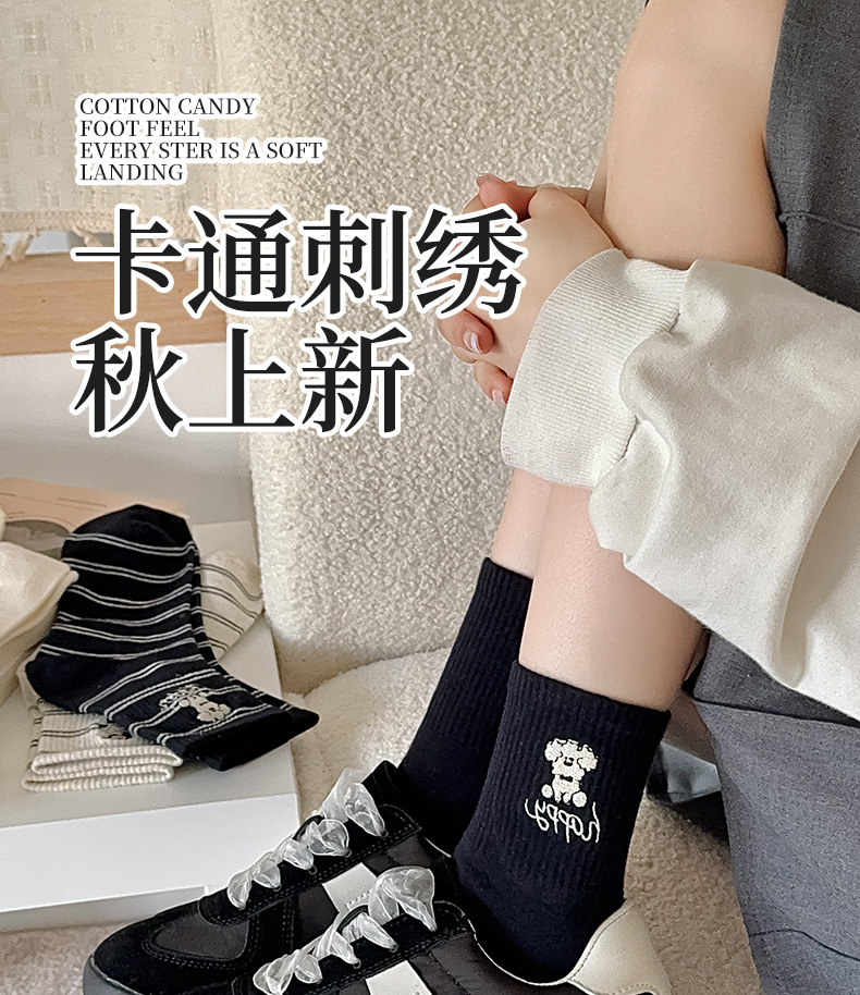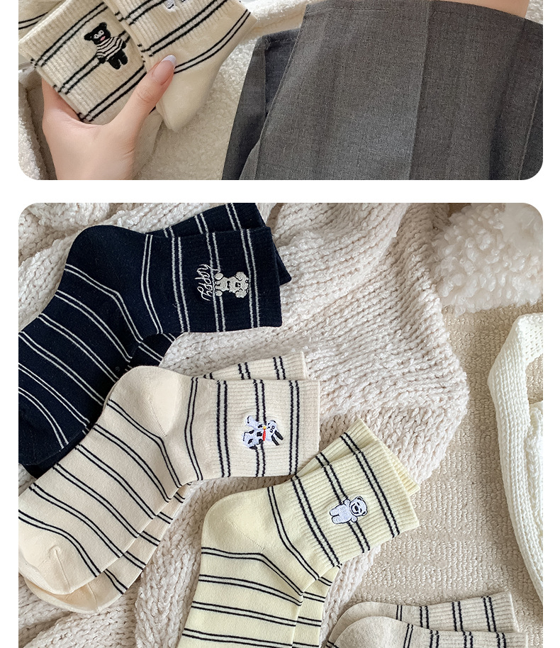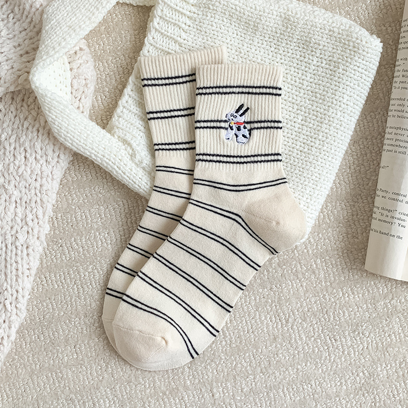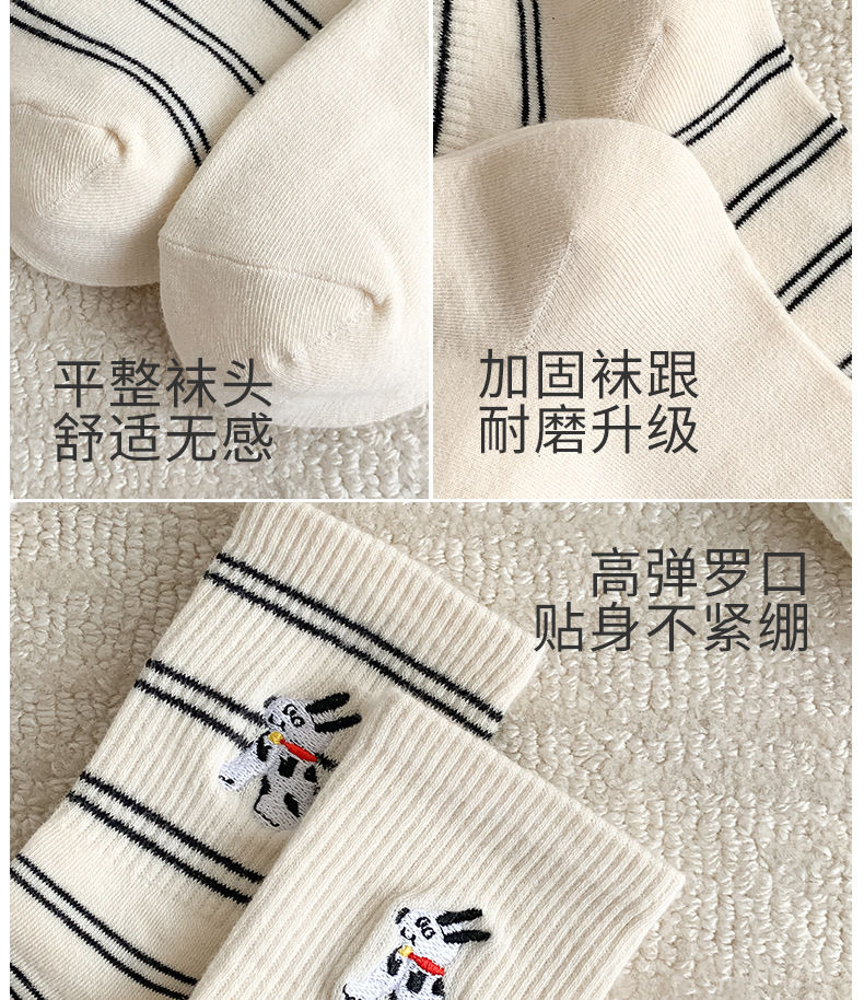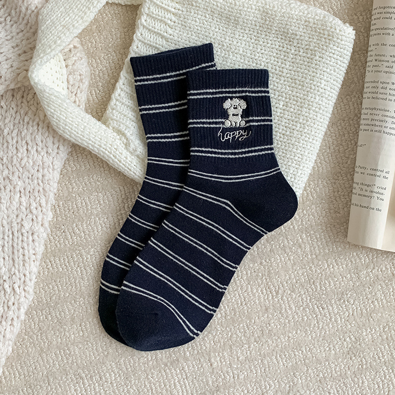 양말 여성용 가을면 양말 귀여운 개 자수 스트라이프 튜브 양말 안티 필링 뼈없는 여성용 양말 도매